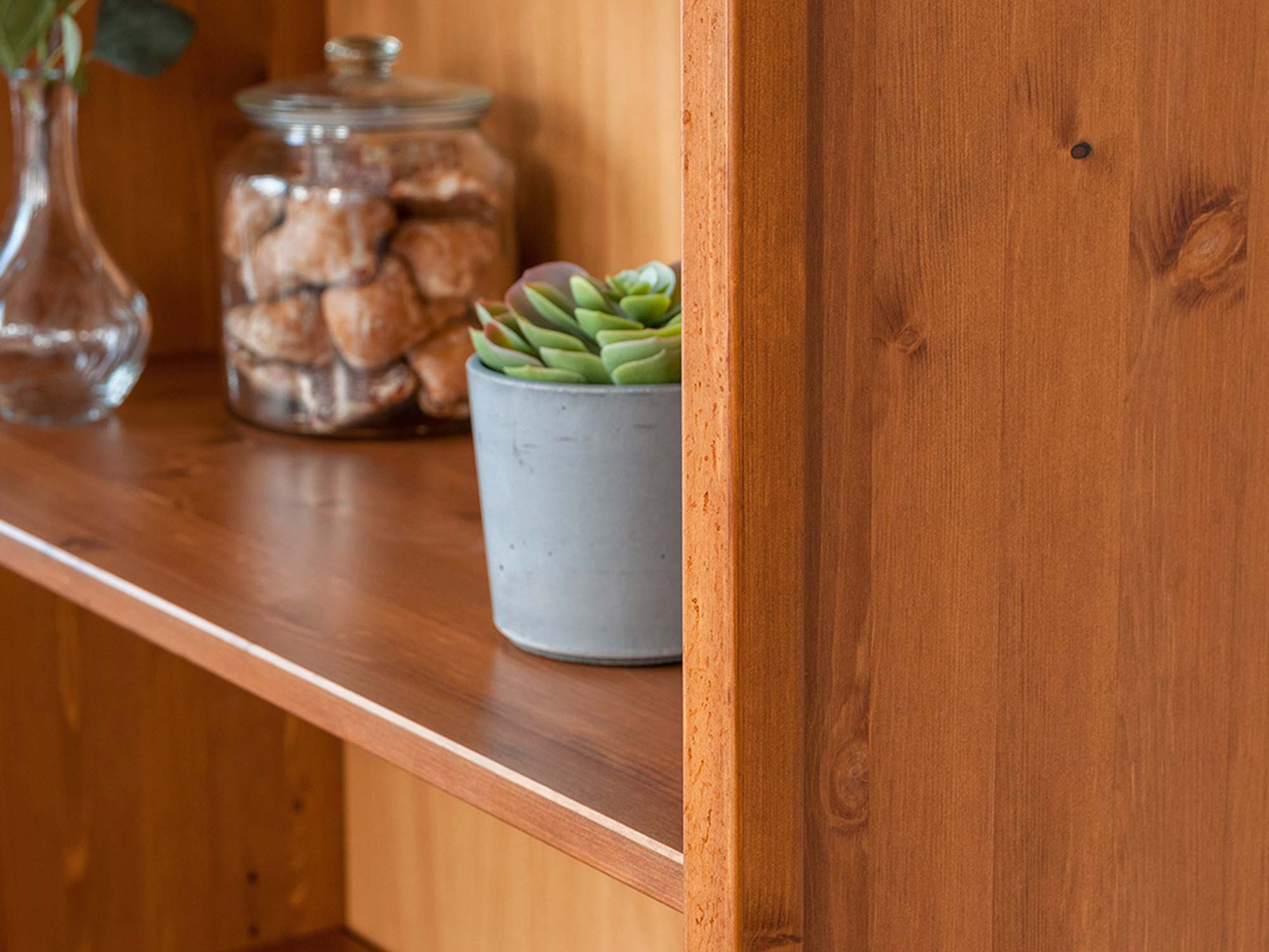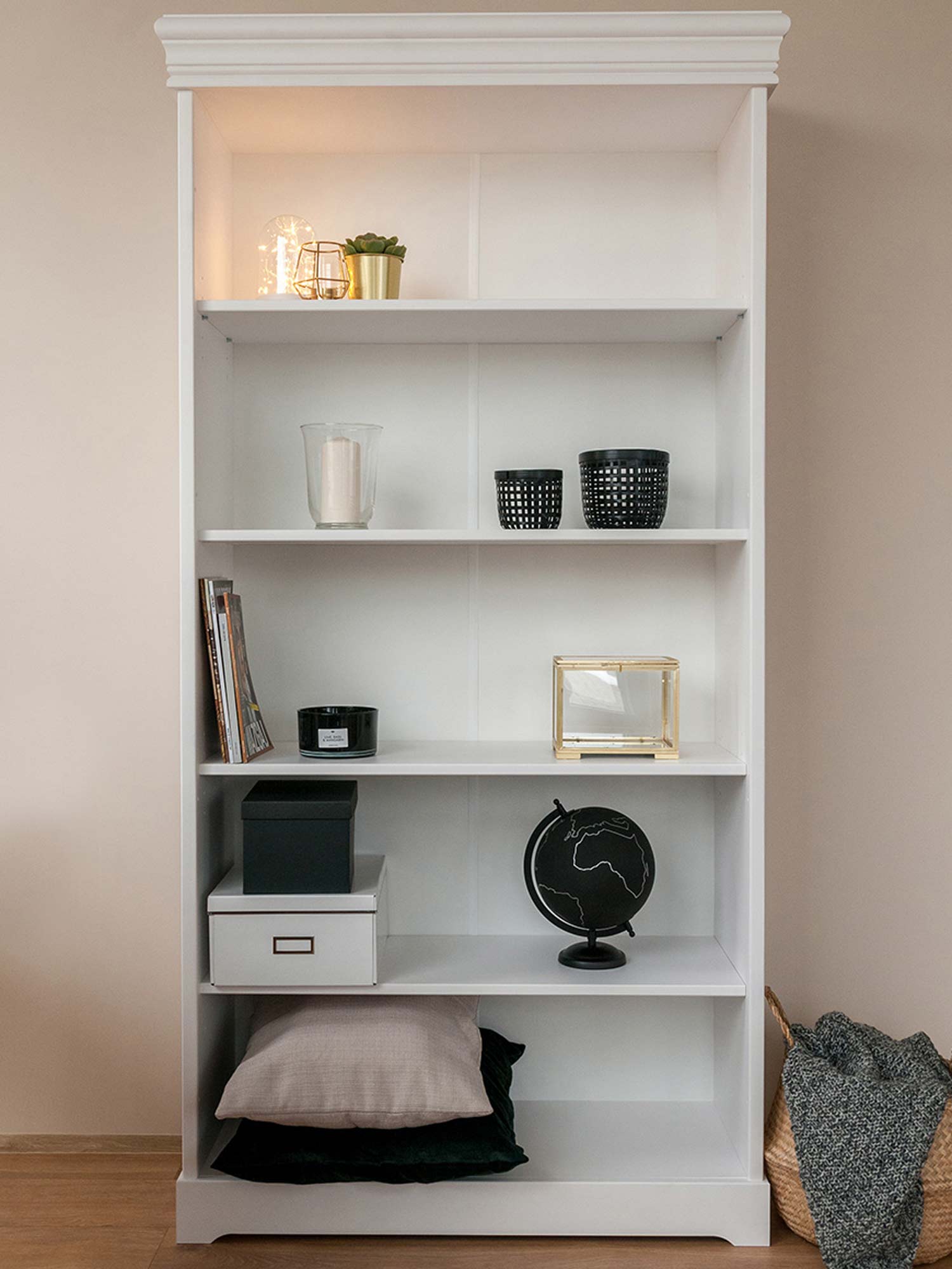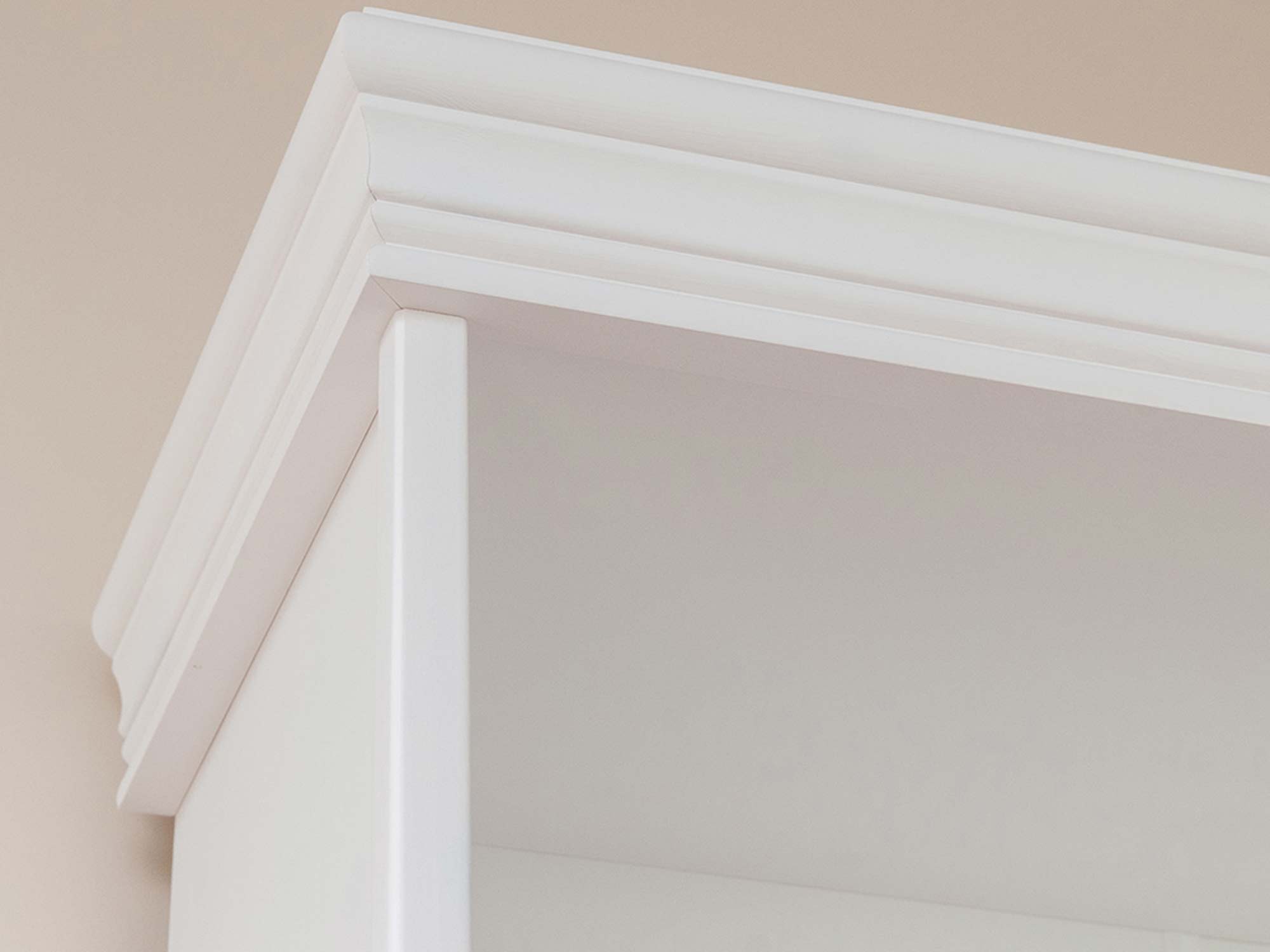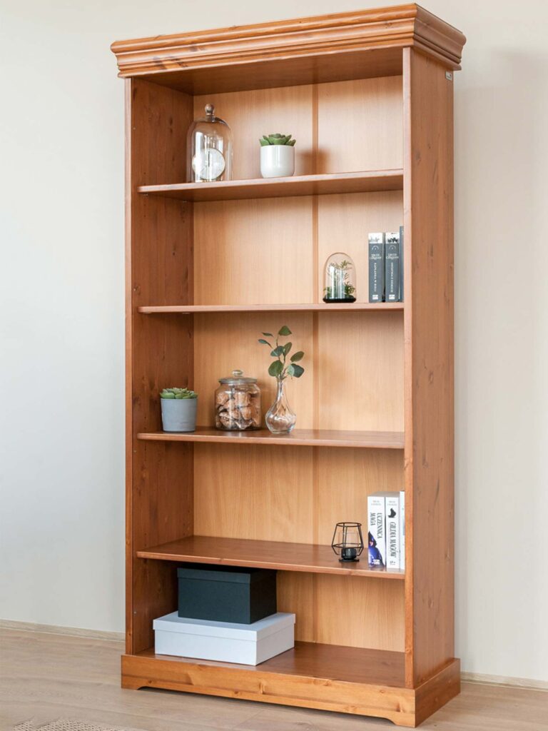 Co najważniejsze regał biblioteczka ANADI posiada cztery głębokie półki, które organizują razem dostatecznie miejsca na wszelkiego rodzaju kolekcje, książki czy dokumenty. Ze względu na materiał wykonania, mebel przy odpowiedniej pielęgnacji może posłużyć nawet przez kilka pokoleń. Oczywiście regał w całości oprócz pleców został wykonany z litego drewna sosnowego, co zapewnia solidność wykonania oraz długoletnią wytrzymałość. Co więcej jest to propozycja nie tylko do salonu czy jadalni, ale również sypialni czy gabinetu, biura. Zdecydowanie wniesie do wnętrza ciepło i rozjaśni całą aranżacje. Dodatkowo ozdobny wieniec górny oraz dolny na styl prowansalski dodają meblu lekkości. Ponadto regał został pokryty farbą wodną o niepełnym kryciu, dzięki czemu widoczne są naturalne sęki występujące w drewnie i wyczuwalna struktura pod opuszkami palców, co bez wątpienia dodaje dodatkowego charakteru.