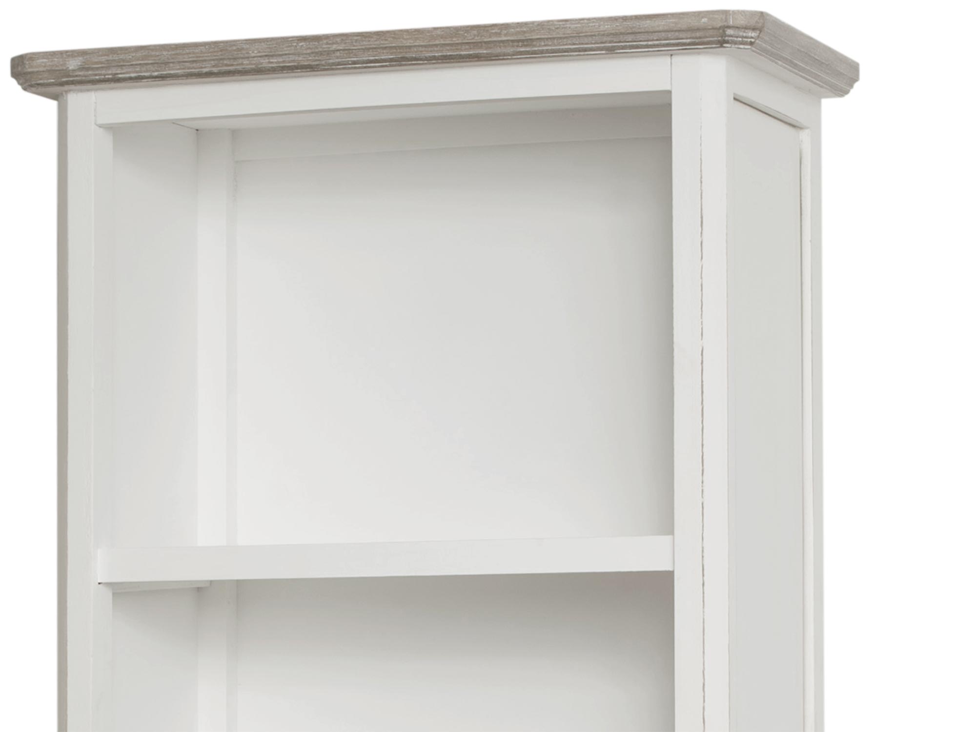 Regał w stylu prowansalskim w kolorze białym z przecieranym, ciemnobrązowym wieńcem górnym. Produkt posiada metalowe uchwyty i toczone nóżki.