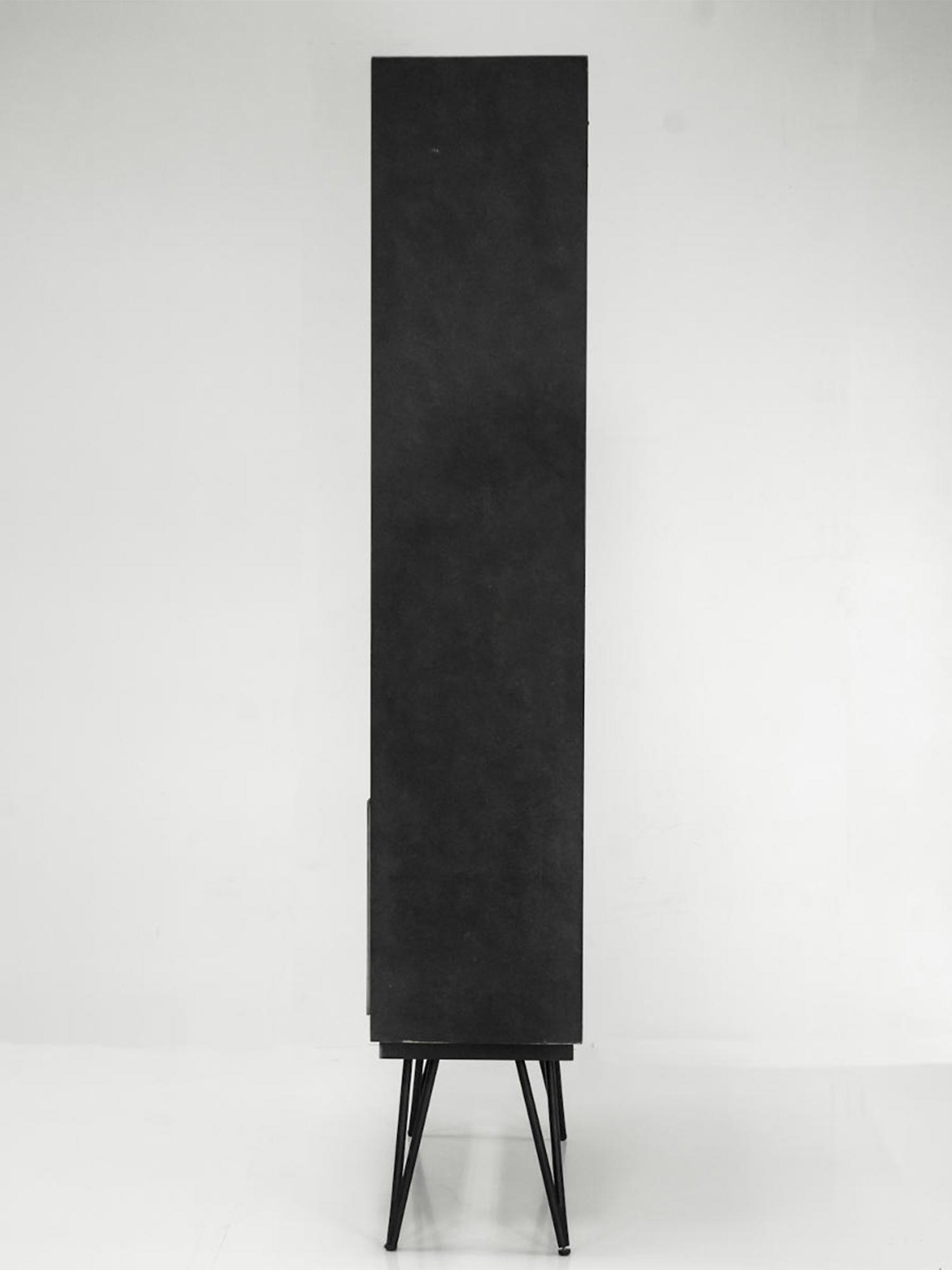 Wysoka czarna witryna z otwartymi półkami i kolorowymi frontami w stylu industrialnym