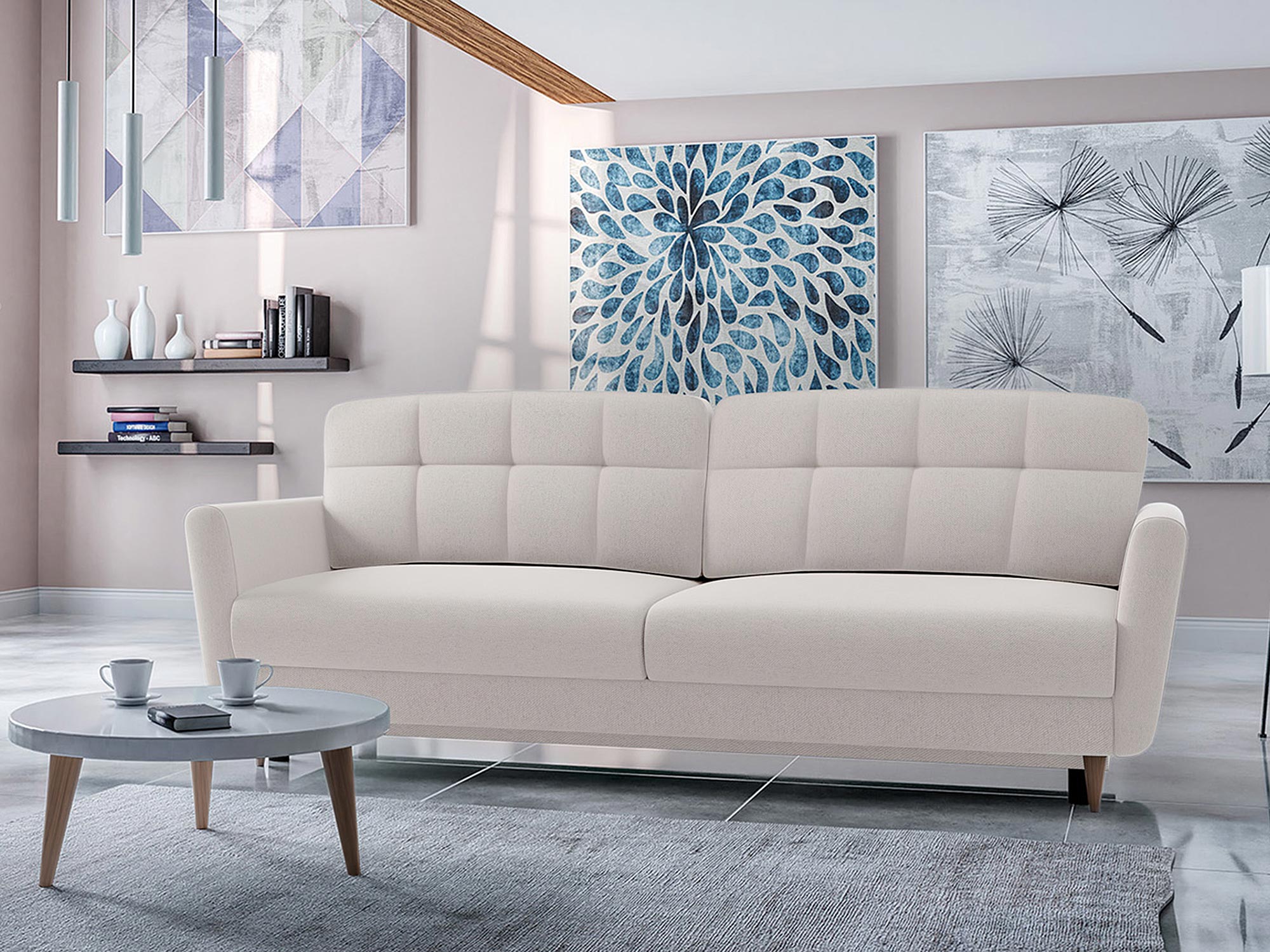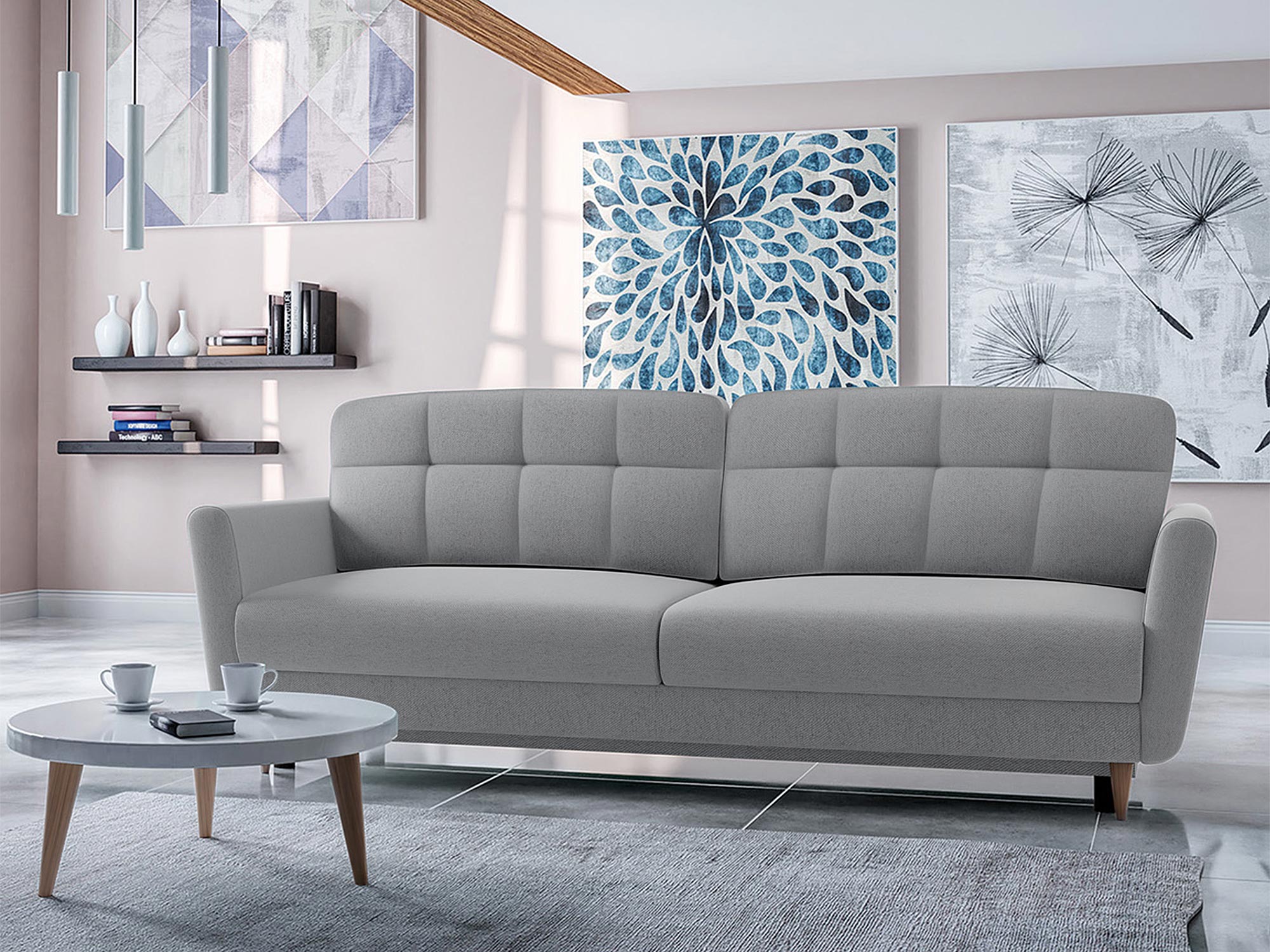 • Funkcja spania – powierzchnia spania o wymiarach 140×200 cm sprawia, że kanapa doskonale sprawdzi się jako łóżko dla gości.