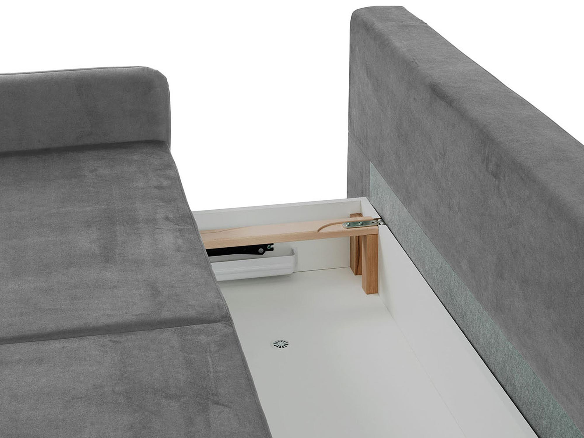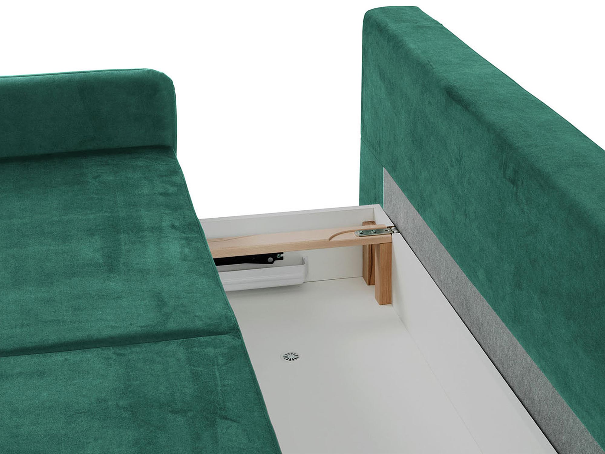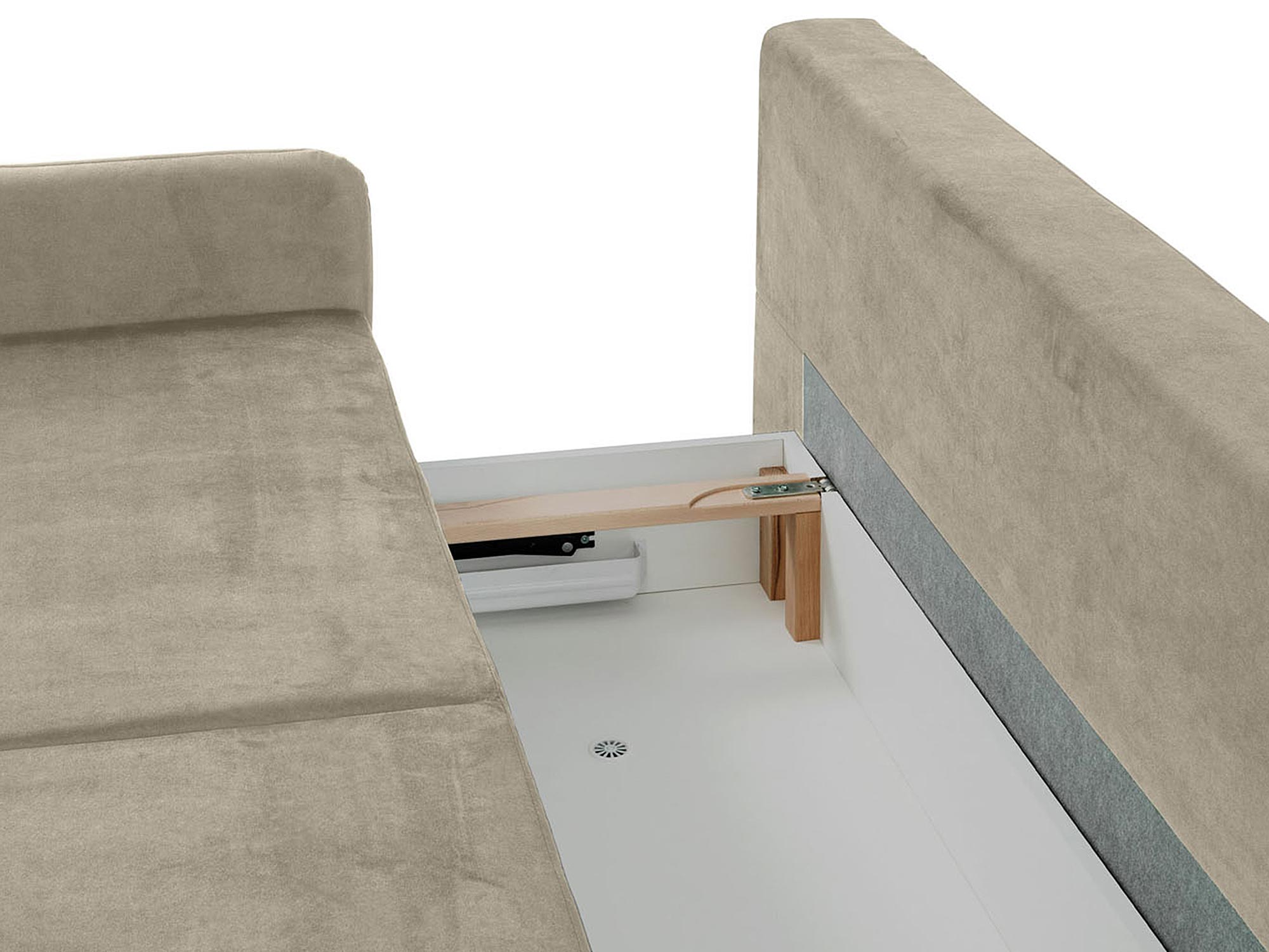 - Pojemnik na pościel – praktyczny schowek pod siedziskiem umożliwia łatwe przechowywanie pościeli i innych rzeczy.