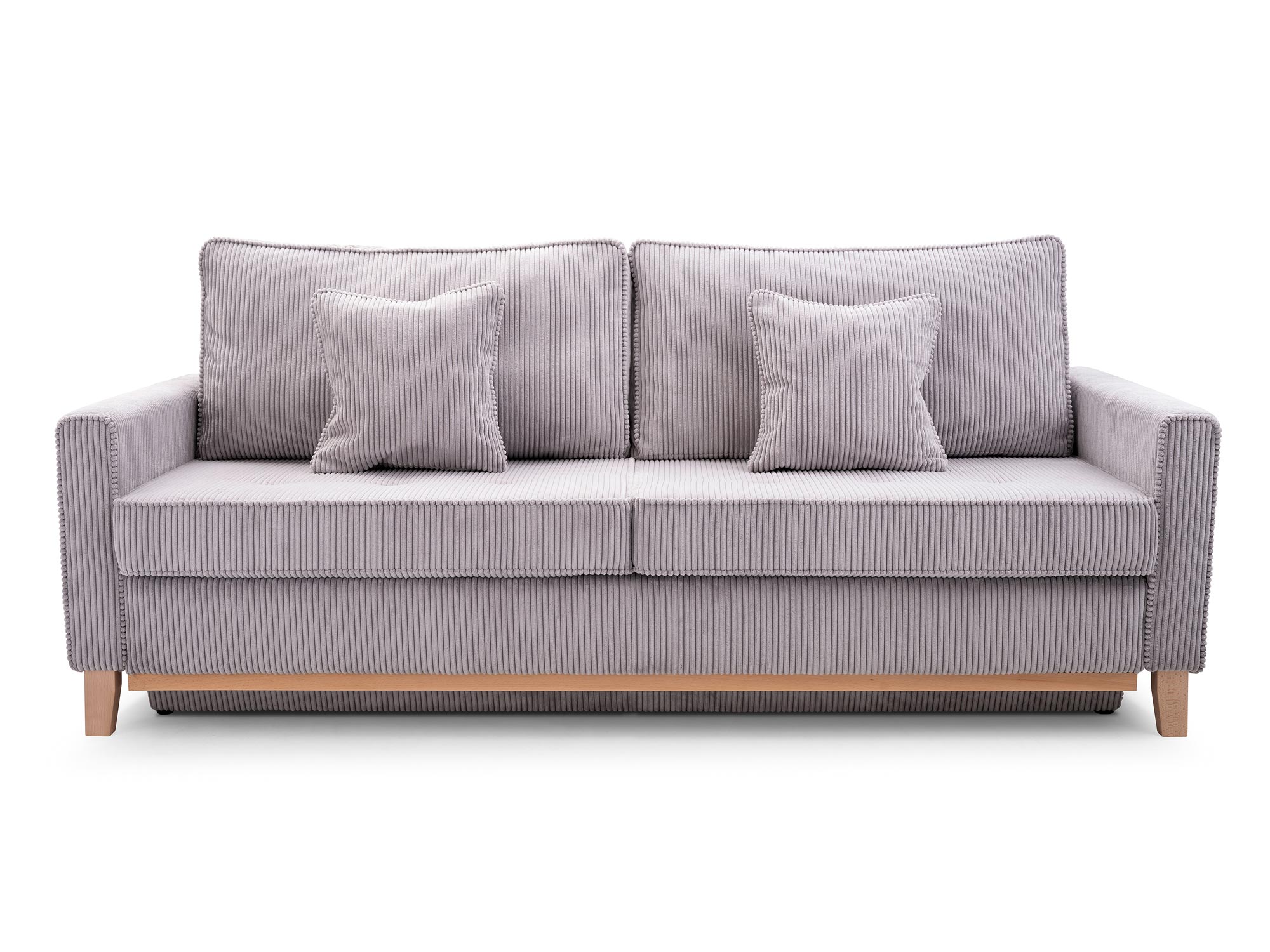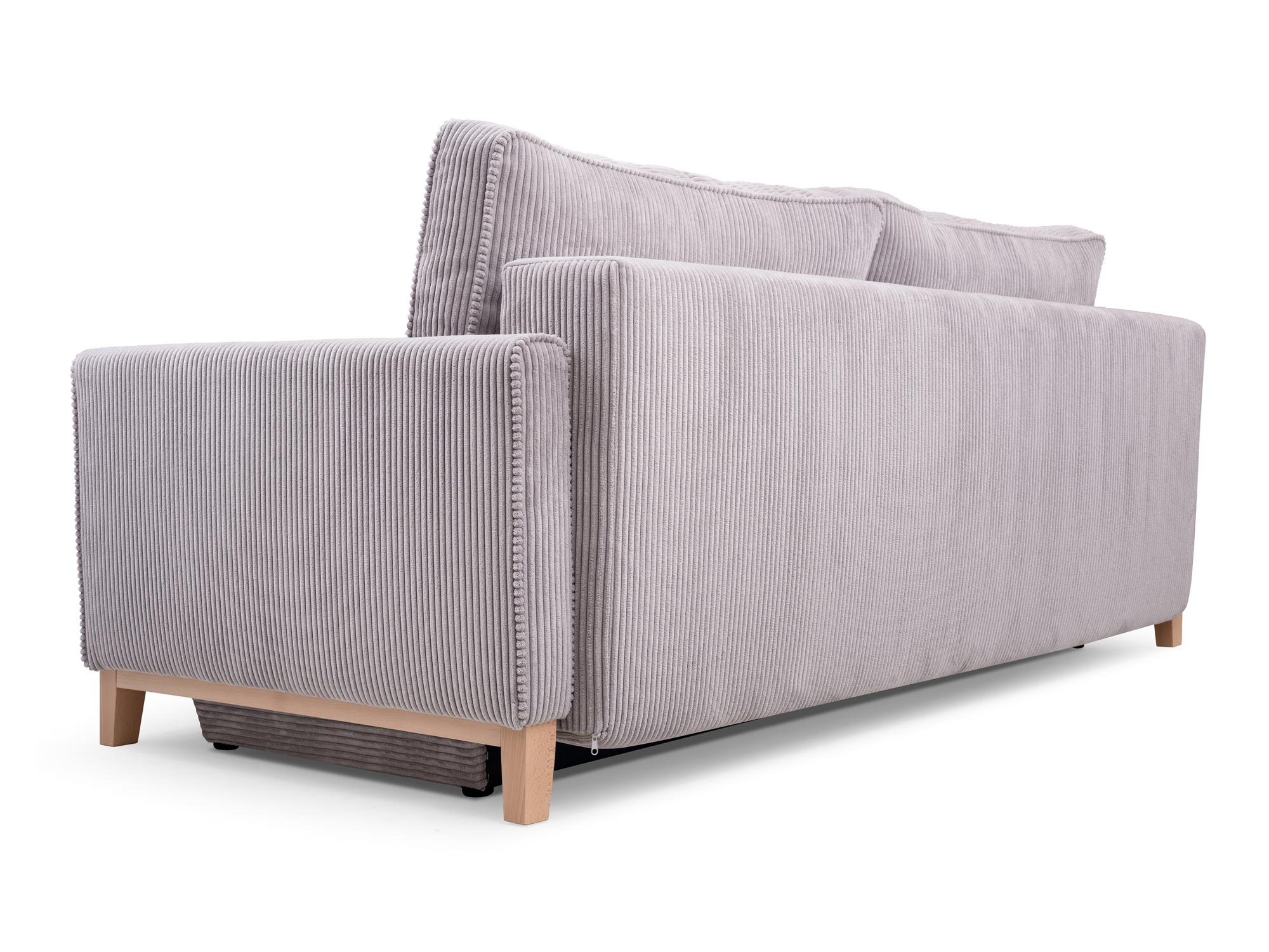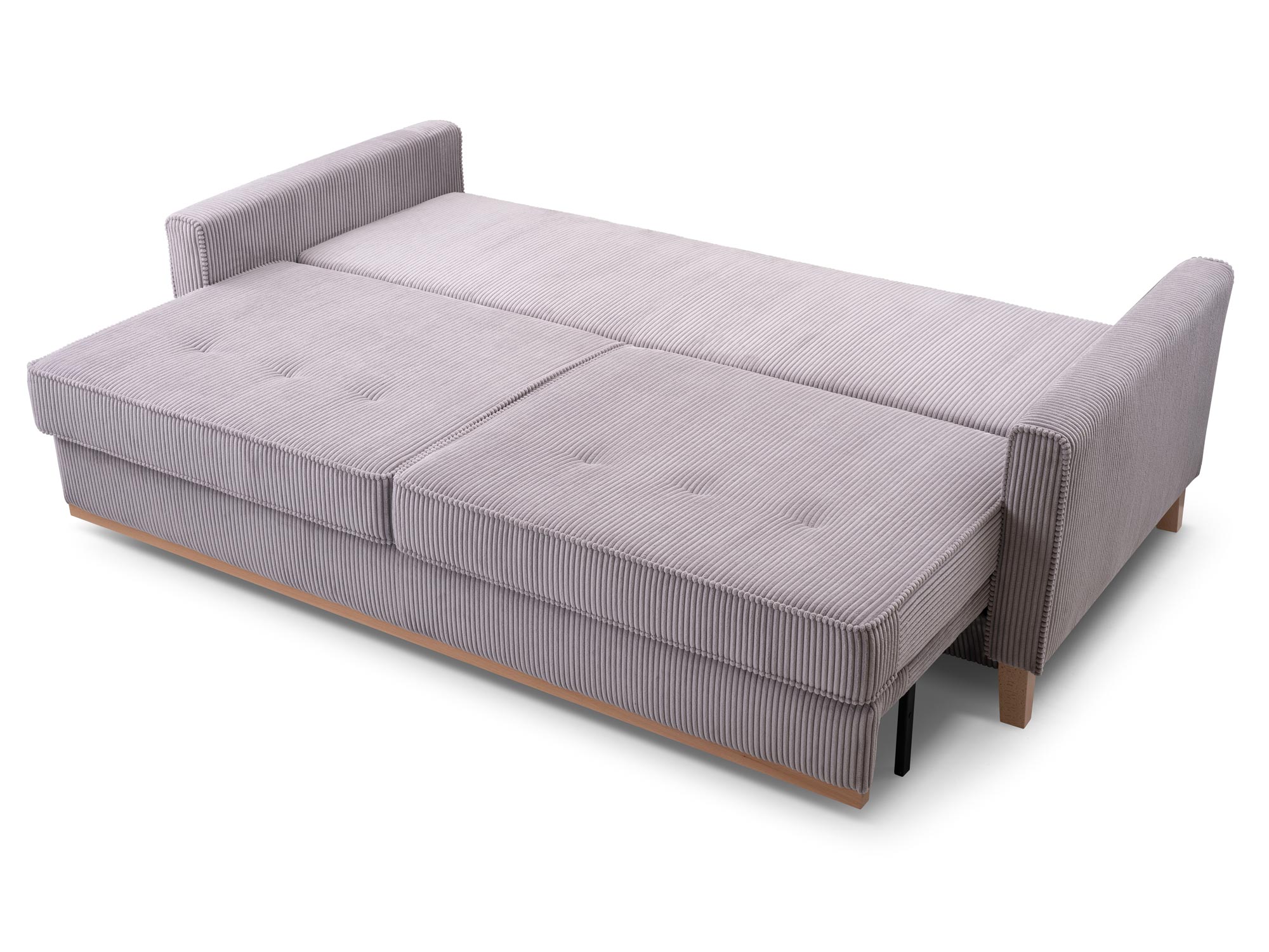 Co najważniejsze wnętrze sofy wypełniono sprężynami falistymi oraz pianką T-30. Przede wszystkim użycie tych materiałów  podnosi komfort wypoczynku i zapewnia równomierne rozłożenie twardości na całej powierzchni. Co więcej poduszki, w które została wyposażona sofa posiadają wszyte zamki ułatwiające utrzymanie czystości sofy. Ponadto wewnątrz mebla znajduje się pakowny pojemnik na pościel. Przede wszystkim sofa Aris to mebel tapicerowany tkaniną, której kolorystkę można wybrać z bogatej gamy wybarwień.