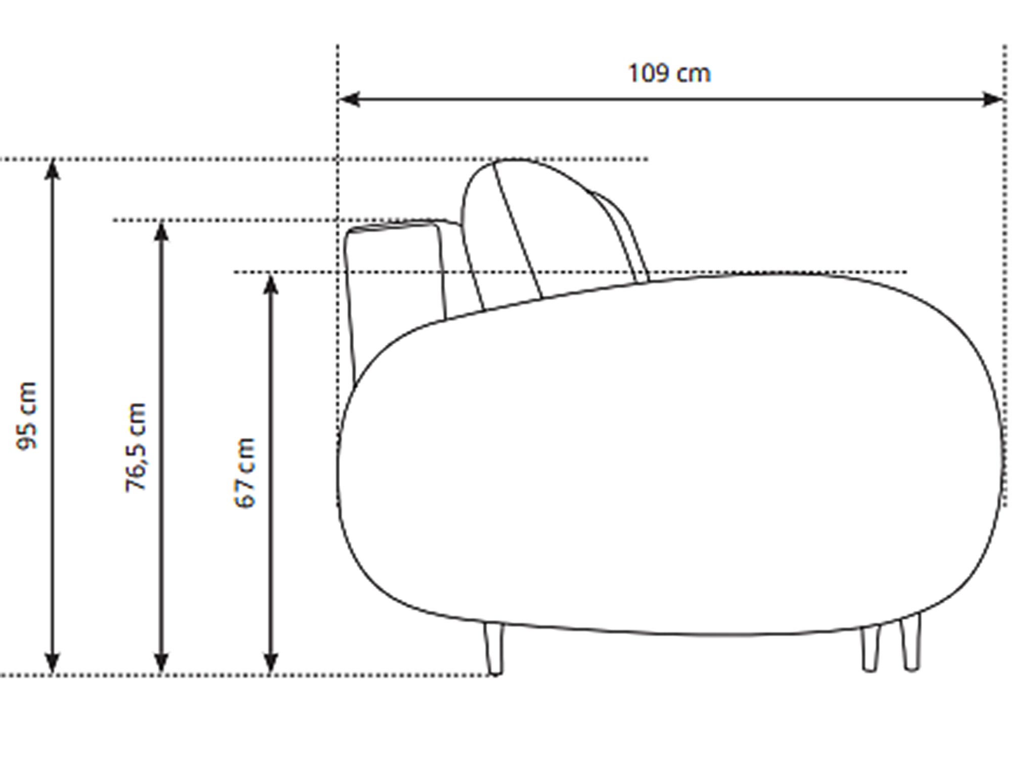 Schemat techniczny sofy z zaokrąglonymi podłokietnikami