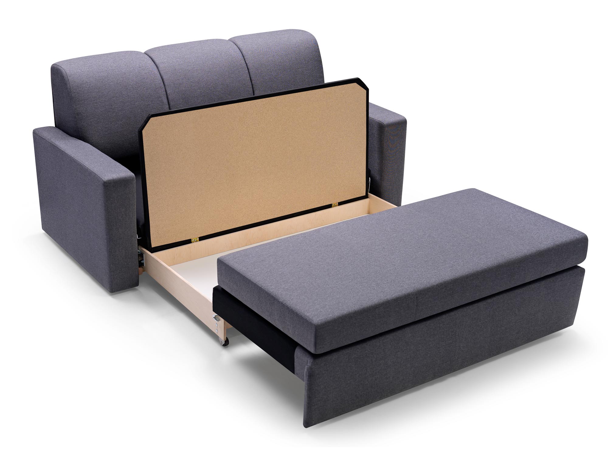 - Rozkładana tradycyjnie na tzw „wózku” 3 elementowym chowanym pod oparcie z przewracanym siedziskiem