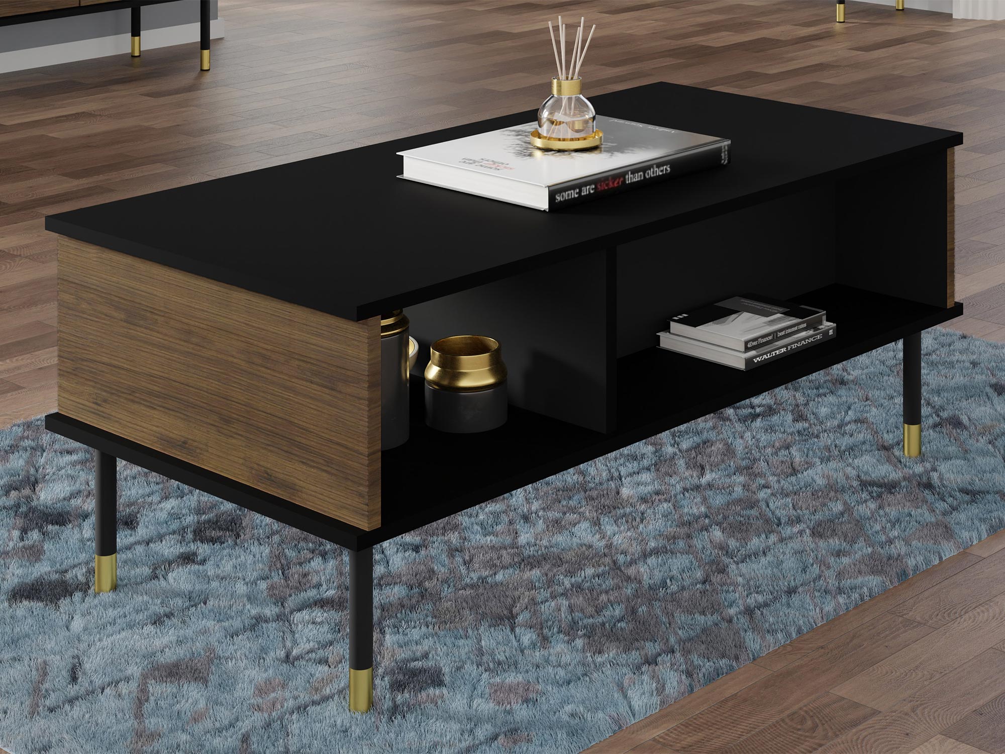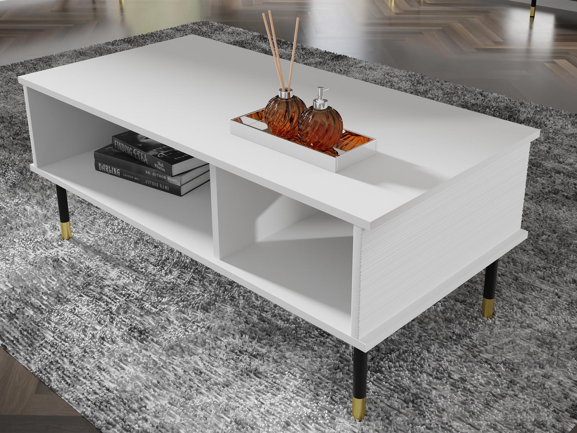 Korpus stolika kawowego Armonia wykonany jest z płyty laminowanej o grubości 16 mm, co zapewnia trwałość i odporność na codzienne użytkowanie. Fronty z płyty MDF o grubości 18 mm, ozdobione delikatnym, nieregularnym frezem, nadają stolikowi eleganckiego wyglądu i wyjątkowego charakteru. Metalowe nogi o wysokości 20 cm, wykończone w kolorze czarnym ze złotymi akcentami, dodają całości nowoczesności i lekkości.