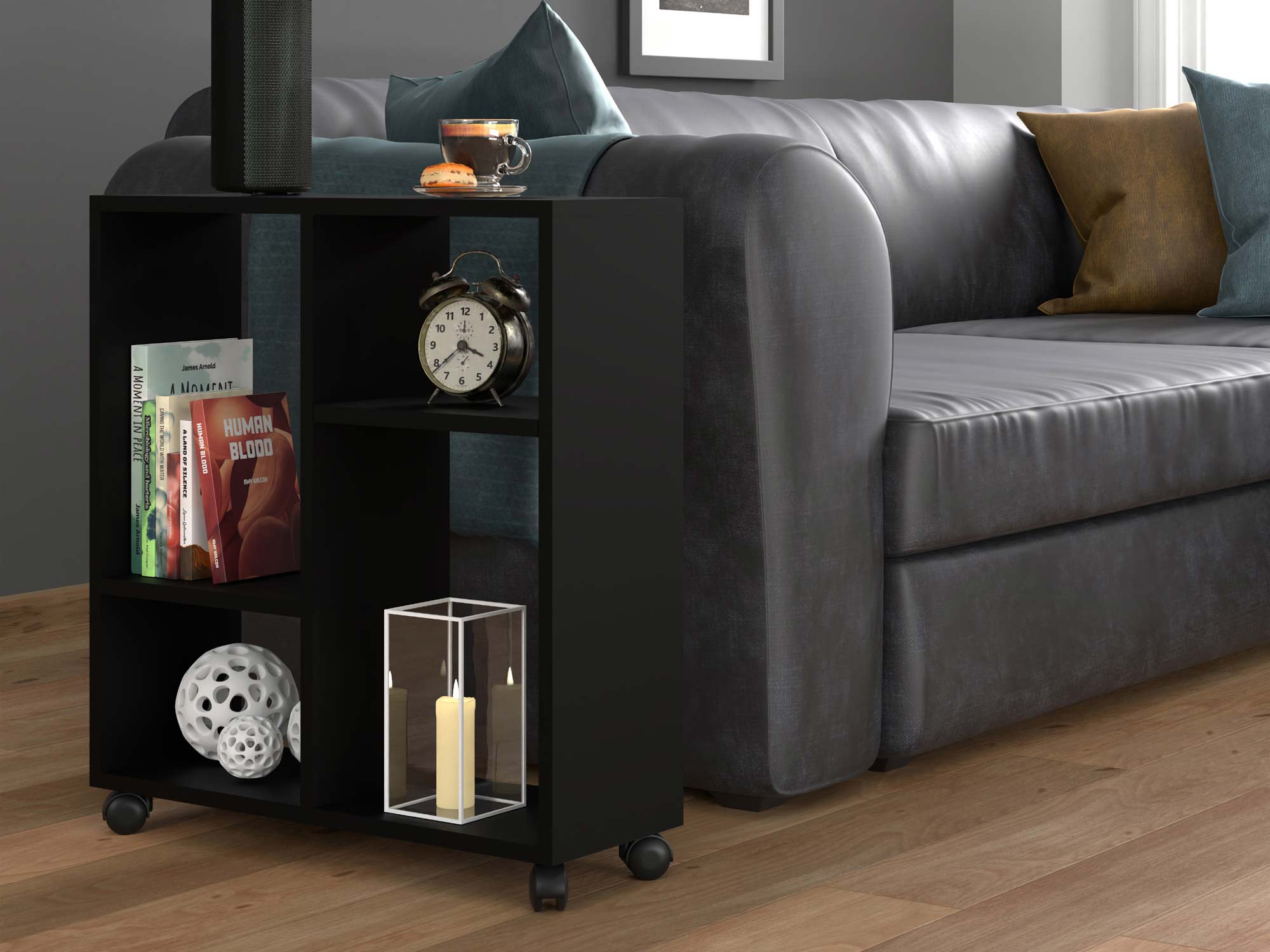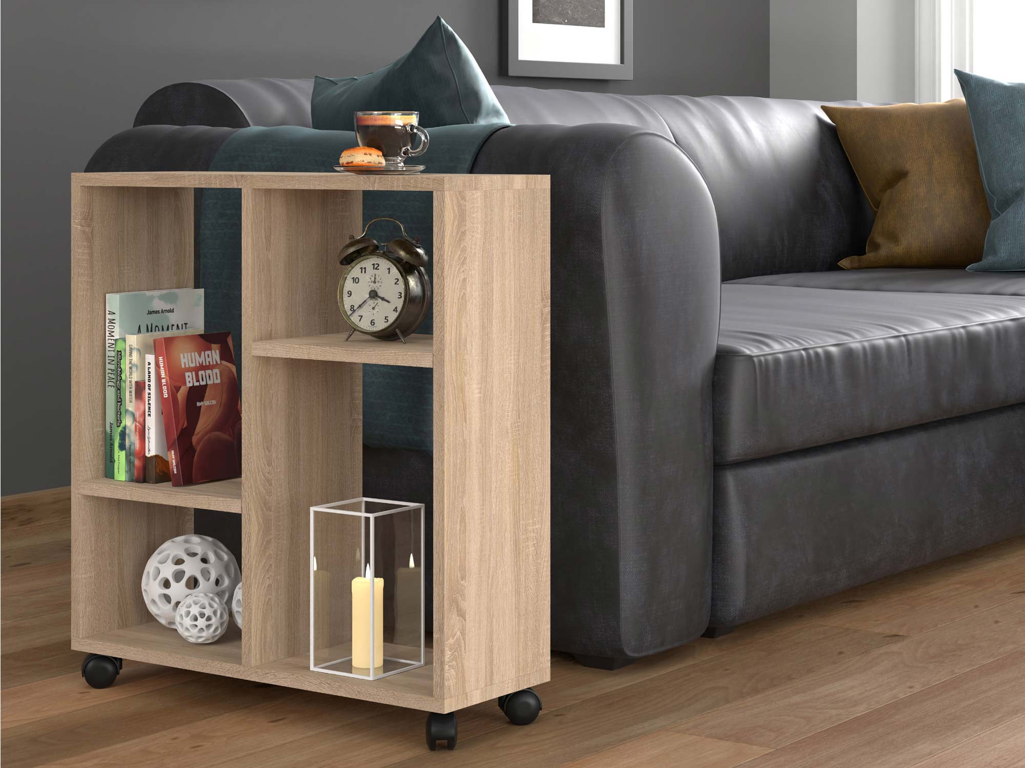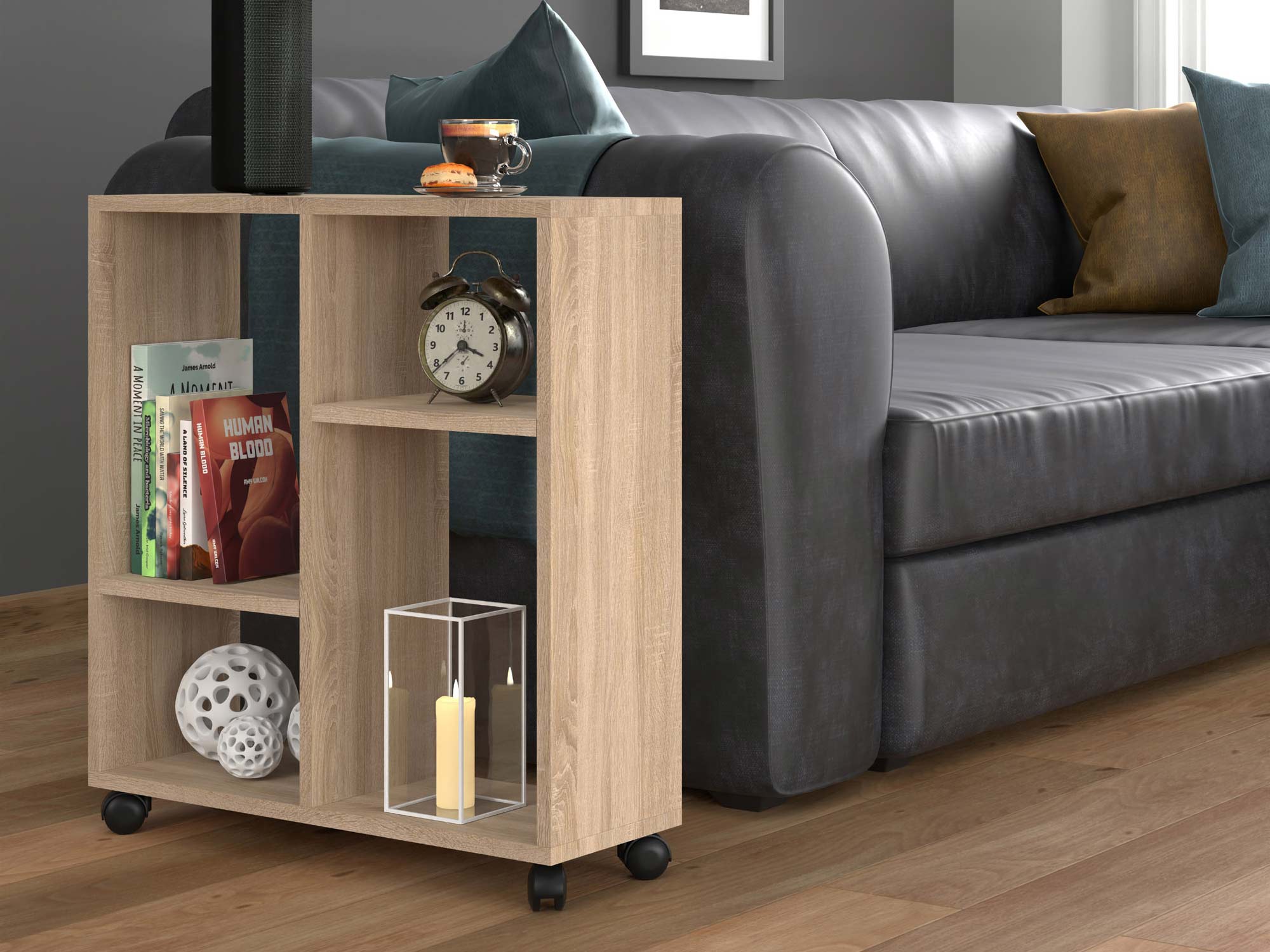 Co najważniejsze oferowany funkcjonalny stolik na kółkach STAR to propozycja innowacyjna i praktyczna do każdego wnętrza. Ze względu na to iż jest to mebel mobilny, jest to doskonała opcja zarówno do przedpokoju, salonu jako stolik kawowy czy sypialni jako szafka nocna. Co więcej jest to mebel łatwy w użytku a dzięki pojemnych półkom również praktyczny.