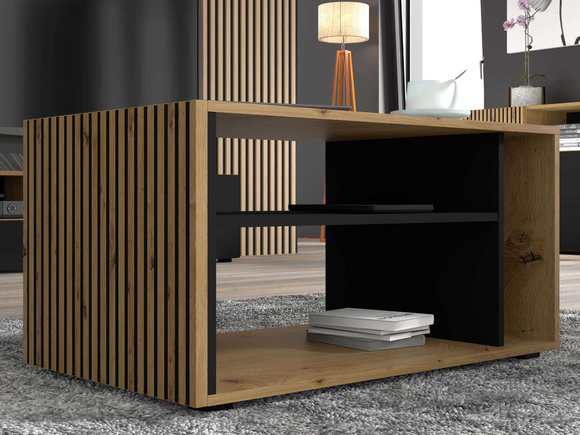 Prezentowana nowoczesna ława do salonu MERVE to nieszablonowa propozycja do każdego nowoczesnego wnętrza. Unikalne połączenie czerni z naturalnym odcieniem drewna z pewnością nada wnętrzu charakteru. Ponadto zastosowane lamele to również zaskakujące wykończenie mebla, które zachwyci niejedną osobę. Co więcej w połączeniu z innymi meblami MERVE stworzą przytulne, wyjątkowe i szykowne wnętrze.