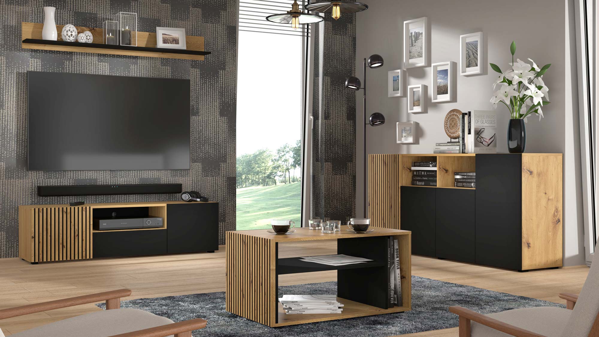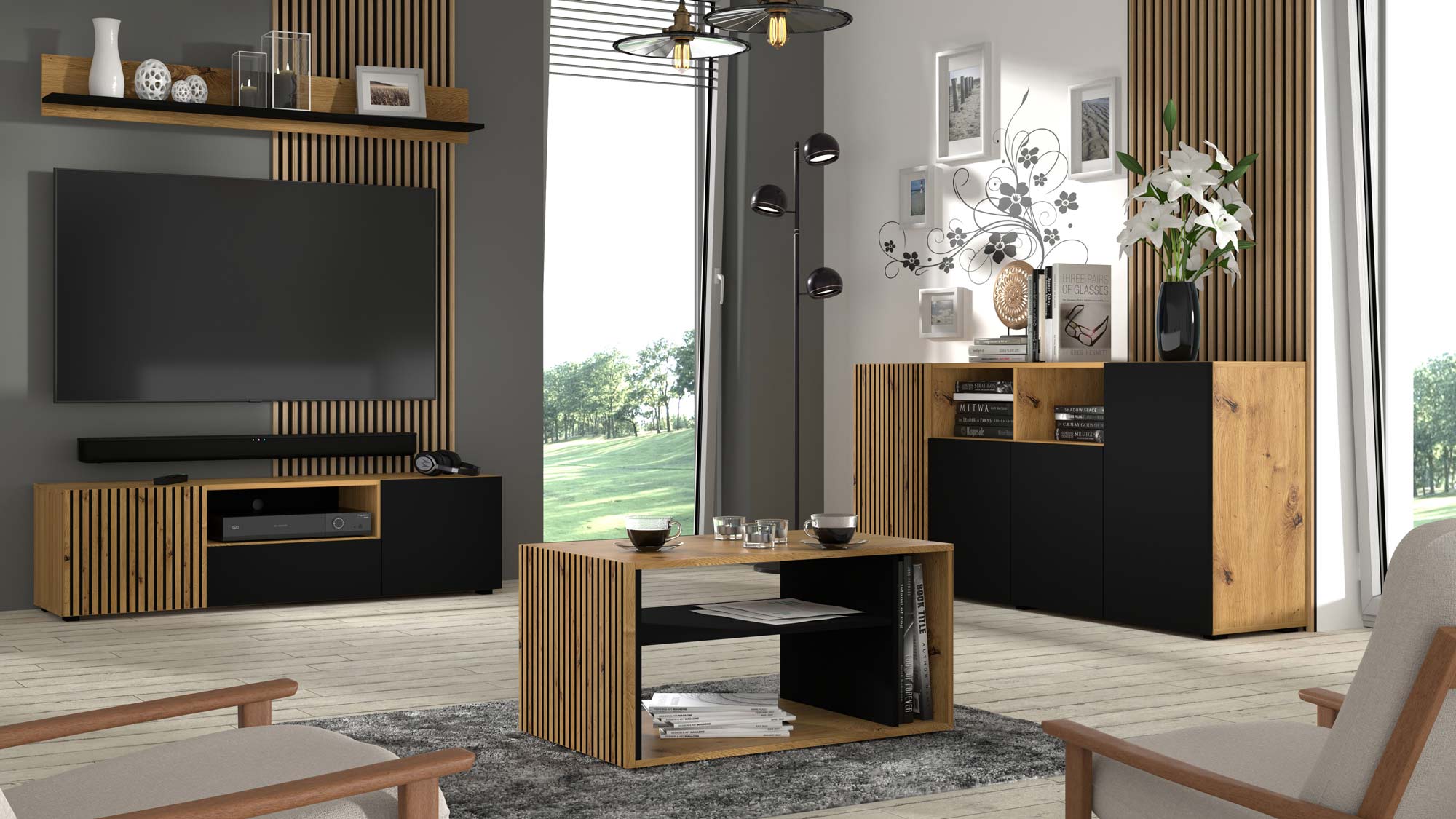 Prezentowana ława wchodzi w skład mebli systemowych MERVE, które wyróżniają się nieszablonowym połączeniem czarnego matu z naturalnym odcieniem drewna, które zdecydowanie zwraca uwagę. Dodatkowo jest to doskonały wybór dla wnętrz projektowanych w stylu nowoczesnym, loftowym czy rustykalnym. Co więcej, meble wyróżniają również fronty z lameli, które zostały wykonane z wysokiej jakości płyty MDF. Ponadto meble nie przytłaczają aranżacji oraz prezentują się we wnętrzu niezwykle szykownie. Dodatkowo podczas tworzenia kolekcji stawiano nie tylko na estetykę, ale przede wszystkim na funkcjonalność. Z tego względu zastosowano wiele szafek oraz szuflad, dzięki czemu organizacja jest znacznie usprawniona. Co więcej, meble nie posiadają uchwytów, a meble otwierane są za pomocą nowoczesnego systemu push to open.