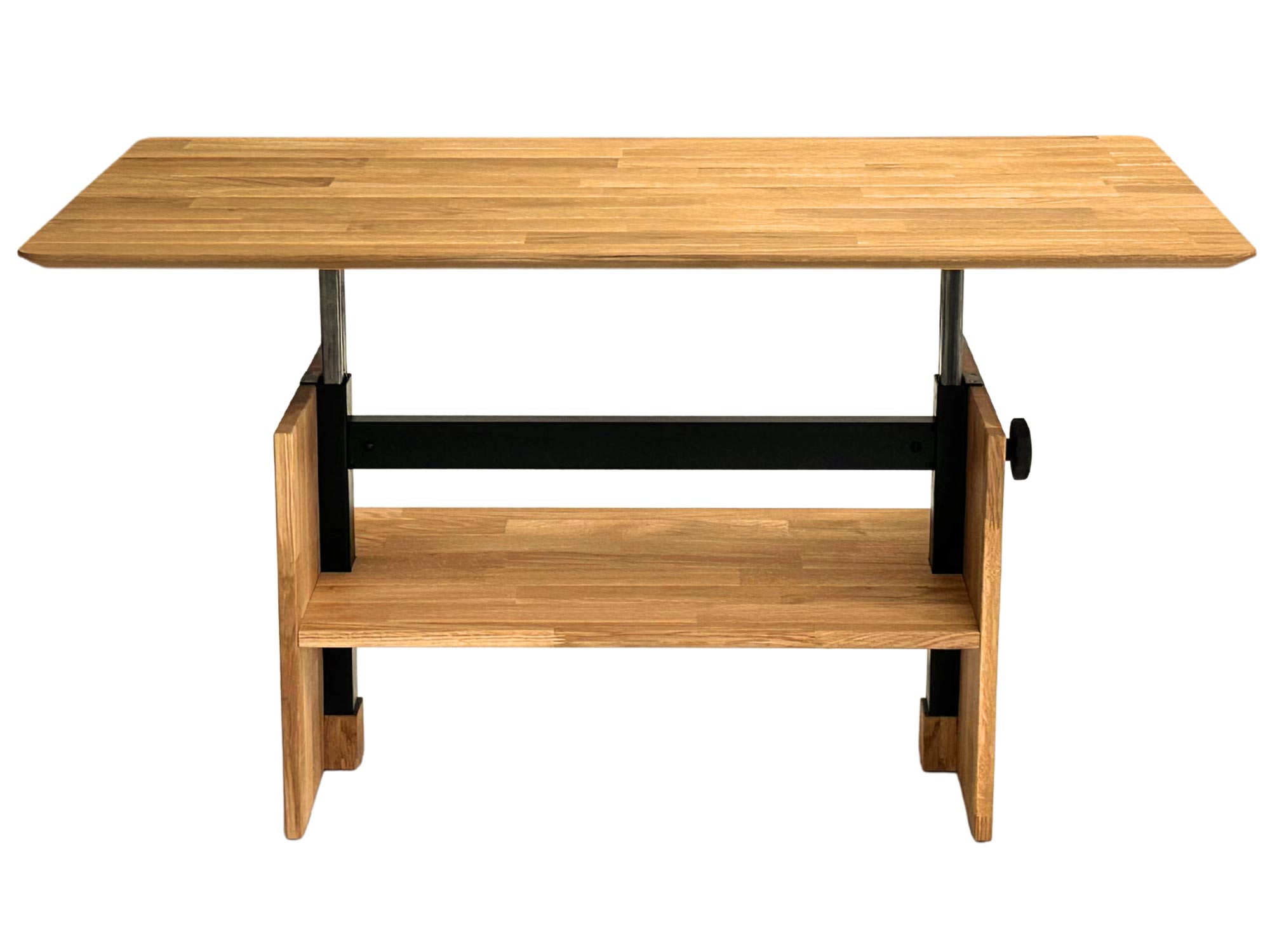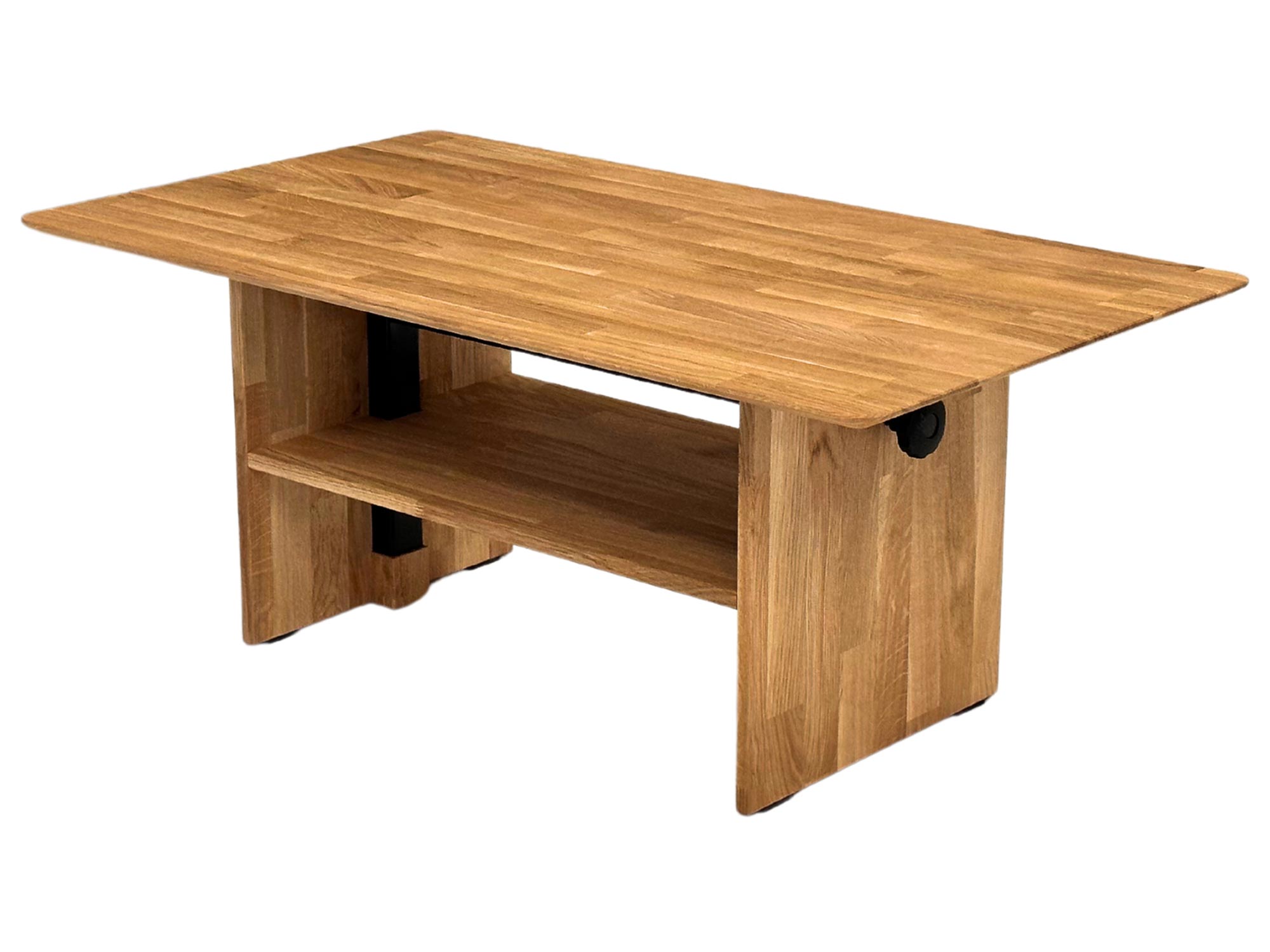 Dębowy stolik z metalowym mechanizmem i czarnym wspornikiem