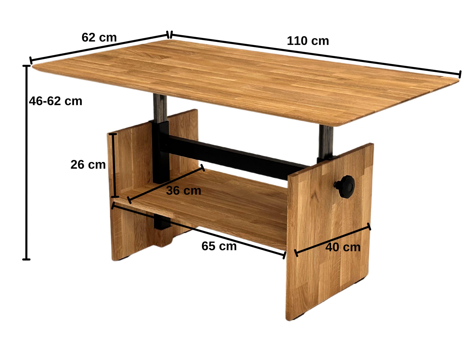 Nowoczesność, elegancja i praktyczność – właśnie to oferuje Stolik Dębowy z Podnoszonym Blatem – Taverno. Dzięki możliwości regulacji wysokości od 46 do 62 cm, ten funkcjonalny mebel idealnie dopasuje się do Twoich potrzeb – jako klasyczny stolik kawowy, miejsce do pracy lub podręczny blat w salonie. Połączenie naturalnego olejowanego drewna dębowego i czarnego metalu wprowadza do wnętrza styl loftowy oraz subtelną elegancję.