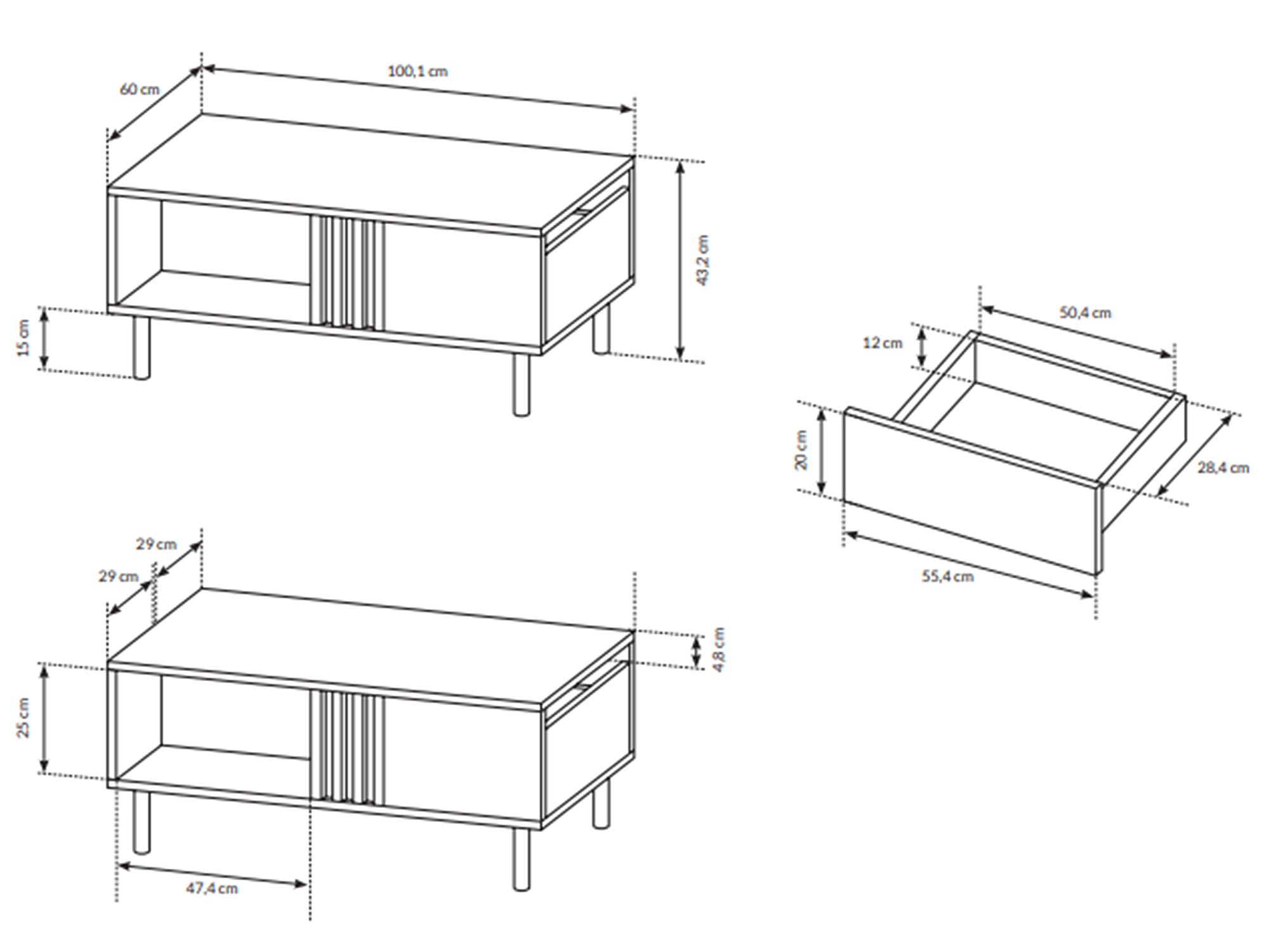 • Praktyczność i elegancja: Wymiary 100,1 cm szerokości, 43,2 cm wysokości oraz 60 cm głębokości zapewniają idealne proporcje, oferując zarówno funkcjonalność, jak i estetyczne dopasowanie do nowoczesnych wnętrz.