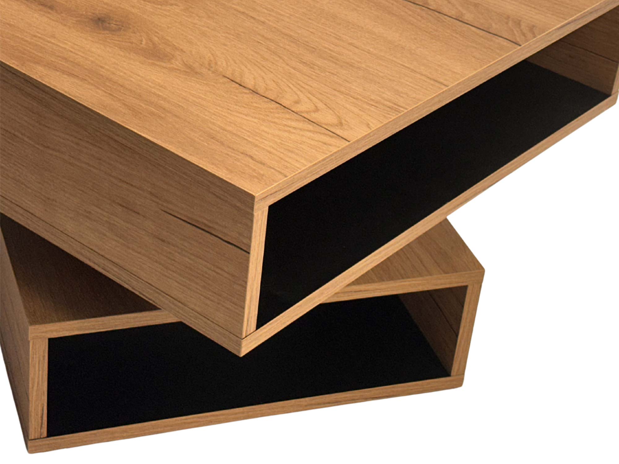 Wnętrze stolika utrzymane jest w eleganckim czarnym kolorze, co w połączeniu z zewnętrzną powierzchnią imitującą naturalny dąb tworzy harmonijną całość. Praktyczne wnęki pozwalają przechowywać piloty, czasopisma czy inne drobne akcesoria zawsze w zasięgu ręki. Kompaktowe wymiary sprawiają, że stolik Nexor sprawdzi się zarówno w mniejszych przestrzeniach, jak i w przestronnych wnętrzach jako nowoczesny akcent dekoracyjny.