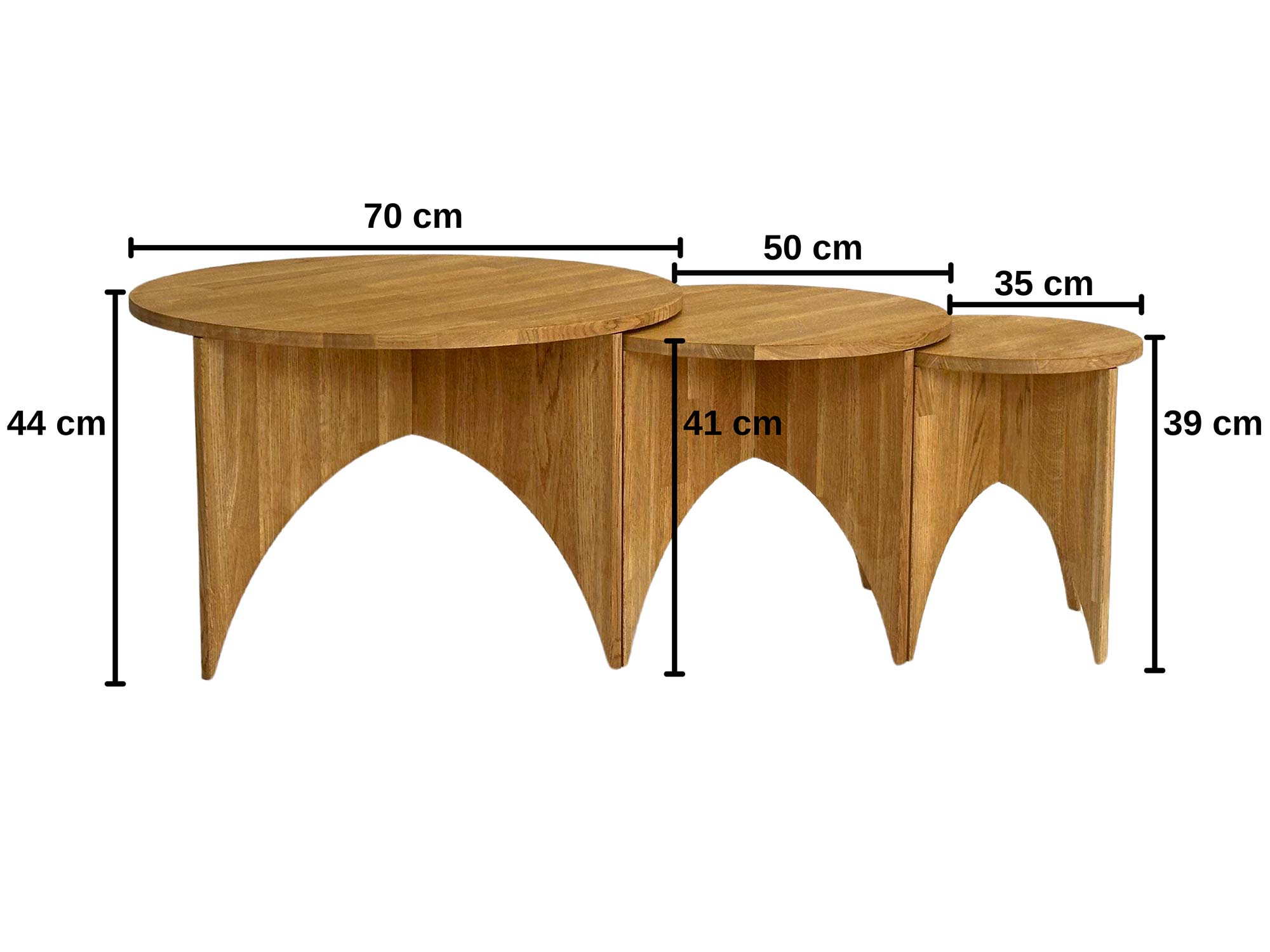 Zestaw składa się z trzech stolików o różnych rozmiarach, co pozwala na elastyczne aranżowanie przestrzeni według potrzeb. Największy stolik posiada blat o średnicy 70 cm i wysokości 44 cm, średni 50 cm i 41 cm wysokości, a najmniejszy – 35 cm średnicy i 39 cm wysokości. To funkcjonalne i estetyczne rozwiązanie, które idealnie sprawdzi się w salonie, pokoju gościnnym czy przestrzeni wypoczynkowej.