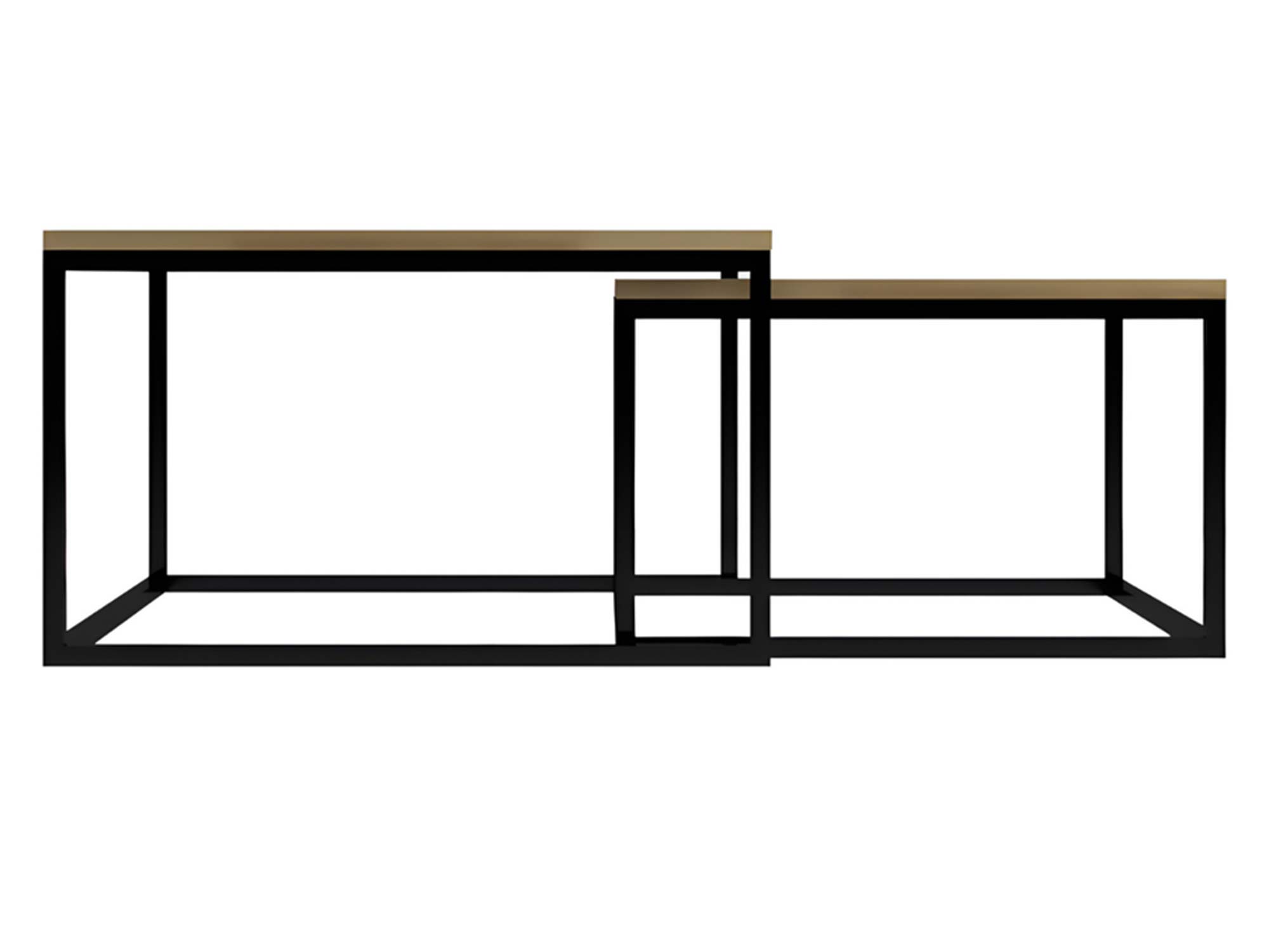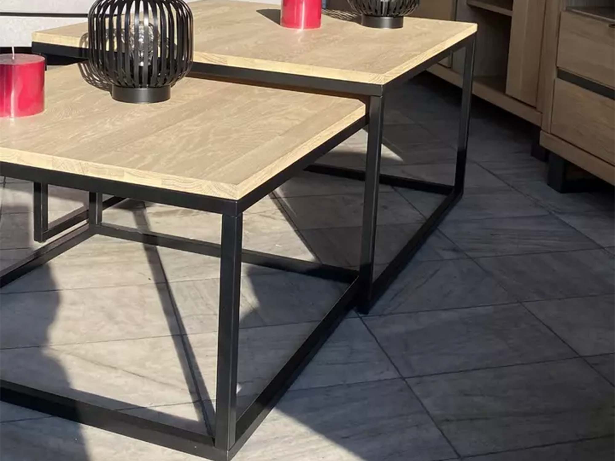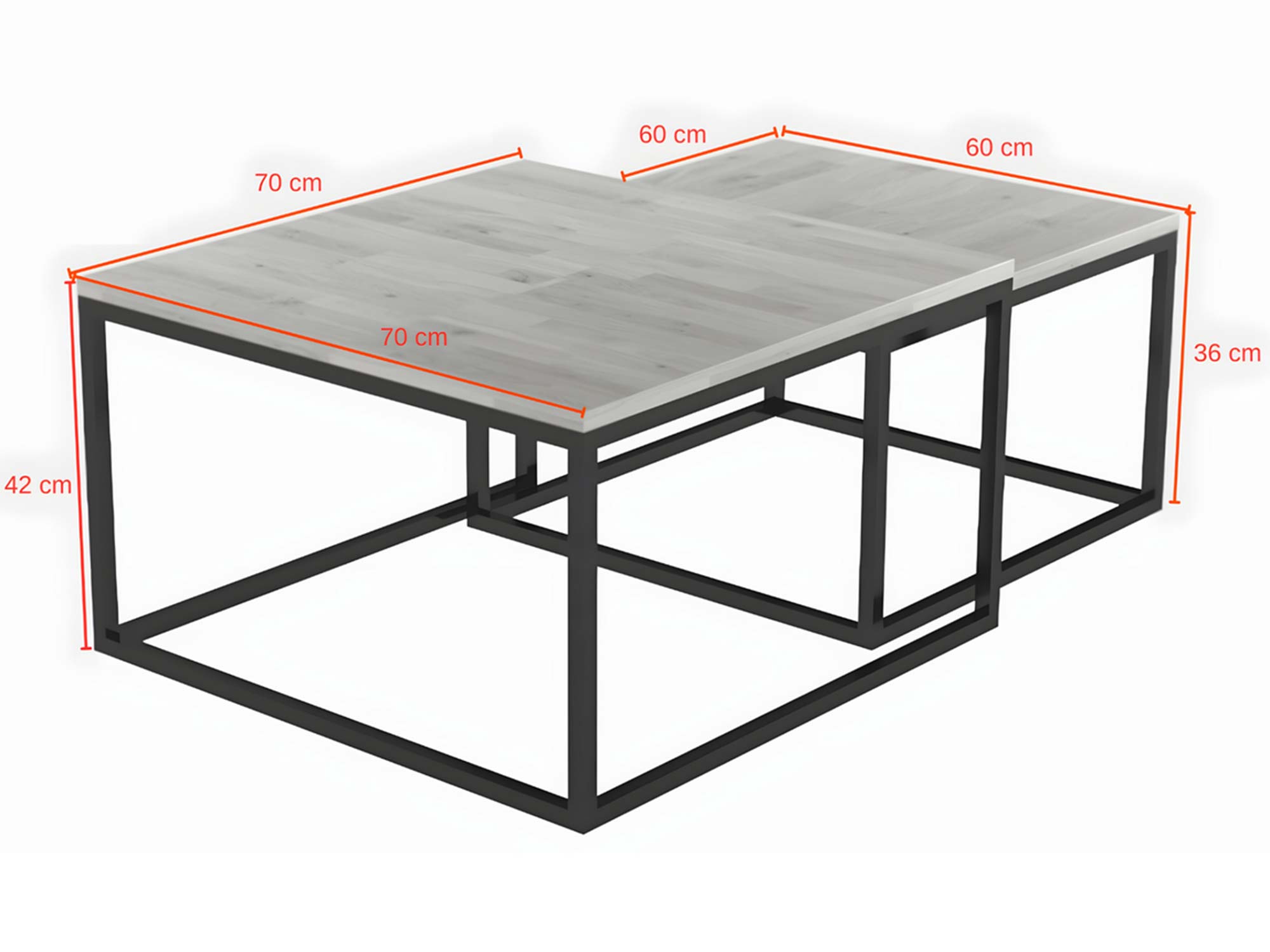 Większy stolik posiada średnicę 70 cm i wysokość 43 cm, a mniejszy – 60 cm i 36,5 cm wysokości. Oba wspierają się na czarnym, stalowym stelażu malowanym proszkowo o profilu 20×20 mm. Nowoczesna forma i prostota wykonania doskonale wpisują się w stylistykę loftową i industrialną, dodając wnętrzu charakteru i elegancji.