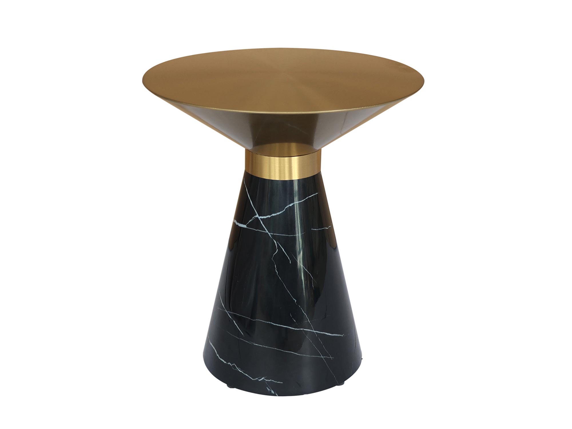 Elegancki stolik Virtus to doskonały wybór dla tych, którzy pragną połączyć nowoczesny design z luksusowymi akcentami. Czarna podstawa w kształcie stożka imitująca marmur oraz złoty blat ze stali nierdzewnej tworzą niepowtarzalną harmonię stylu i jakości. Ten stolik doskonale sprawdzi się zarówno w nowoczesnych, jak i klasycznych wnętrzach, dodając im elegancji i prestiżu.