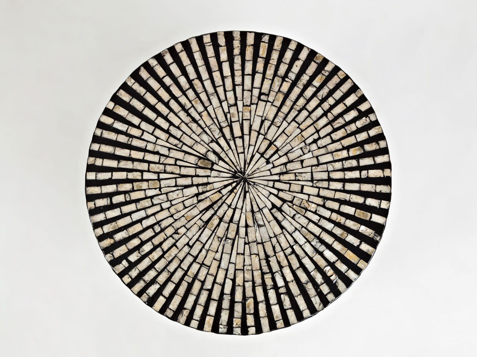 Szczegół wykończenia okrągłego stolika z geometrycznym wzorem kolor czarno-biały