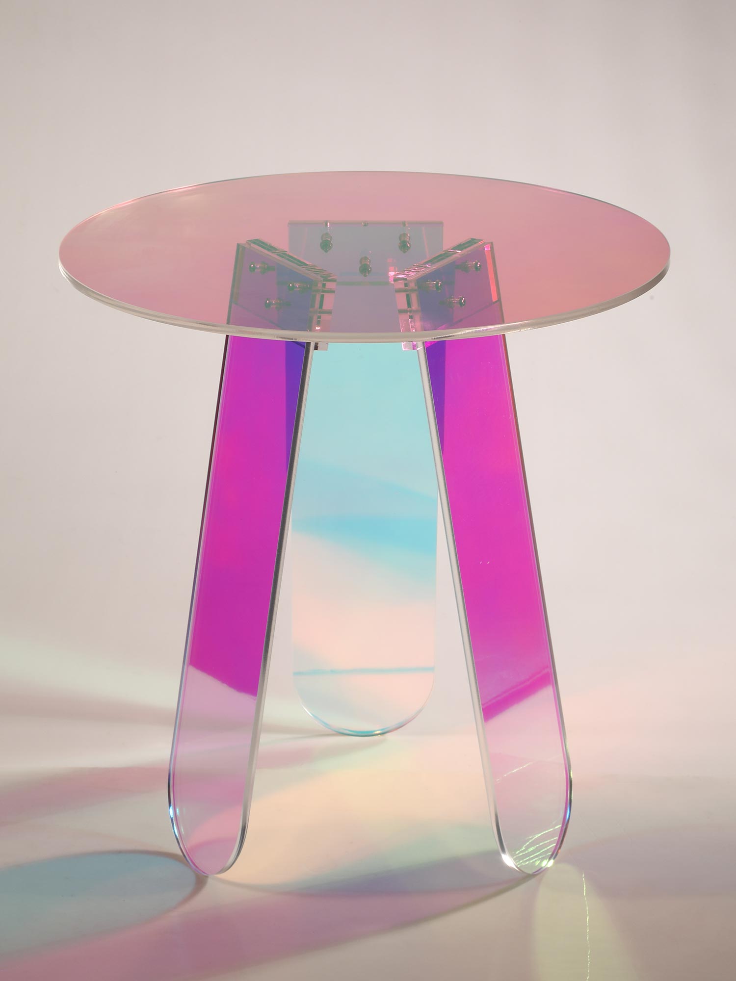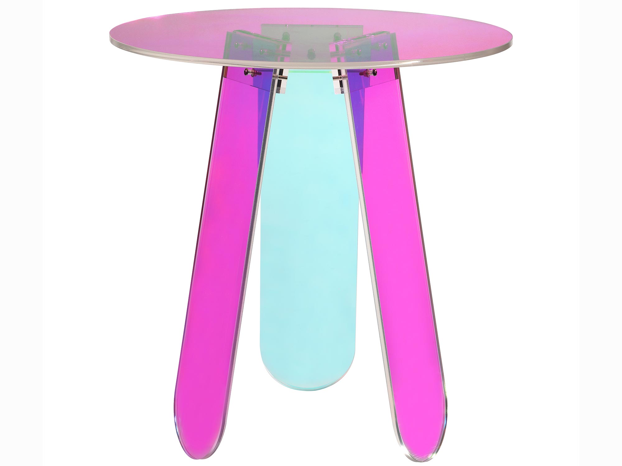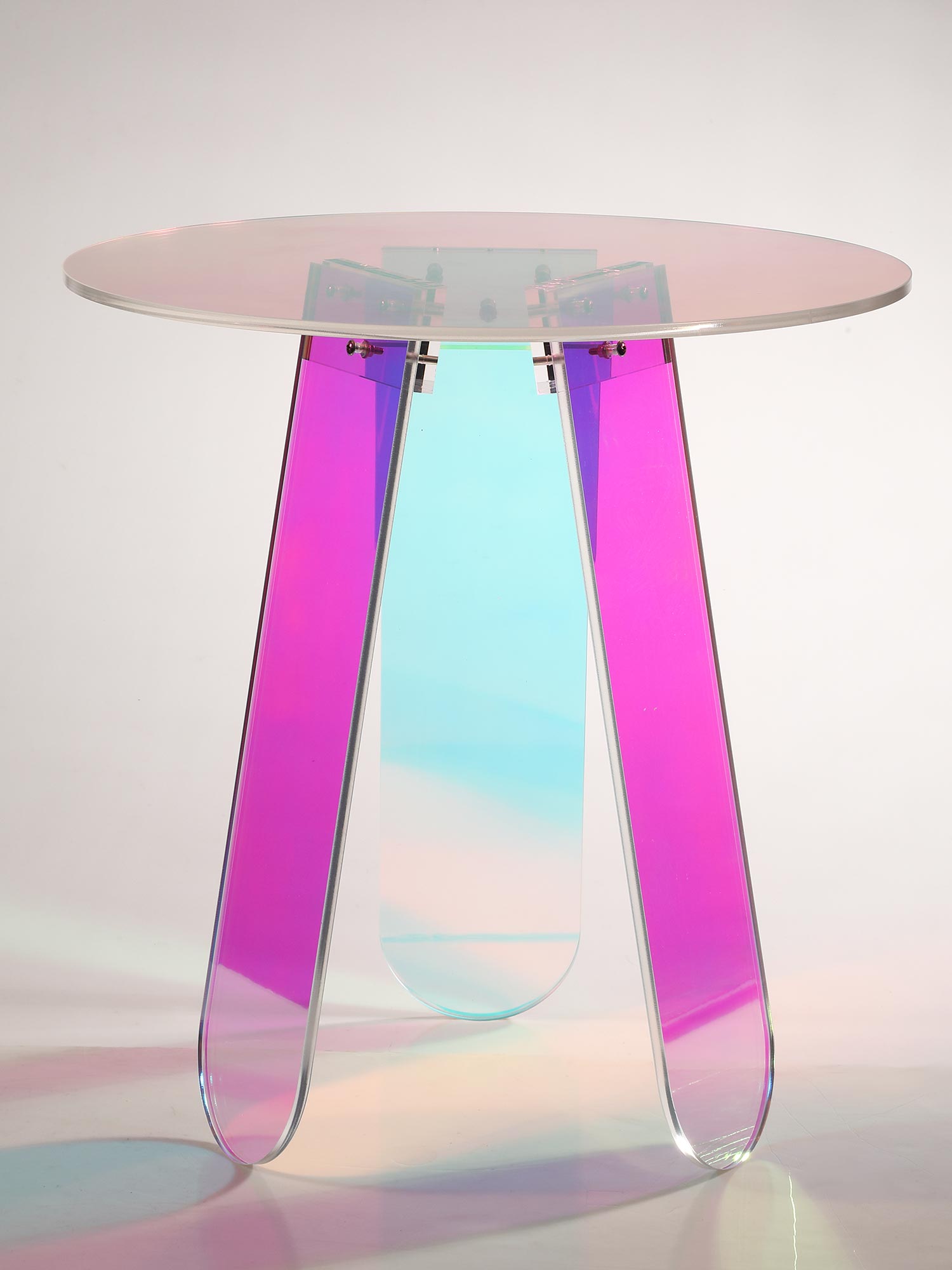 Oryginalny stolik wykonany z przezroczystego, opalizującego akrylu. W zależności od kąta padania światła widoczne są różne efekty kolorystyczne. Prosta forma i lekka konstrukcja sprawią, iż stolik dopasuje się do każdego wnętrza.