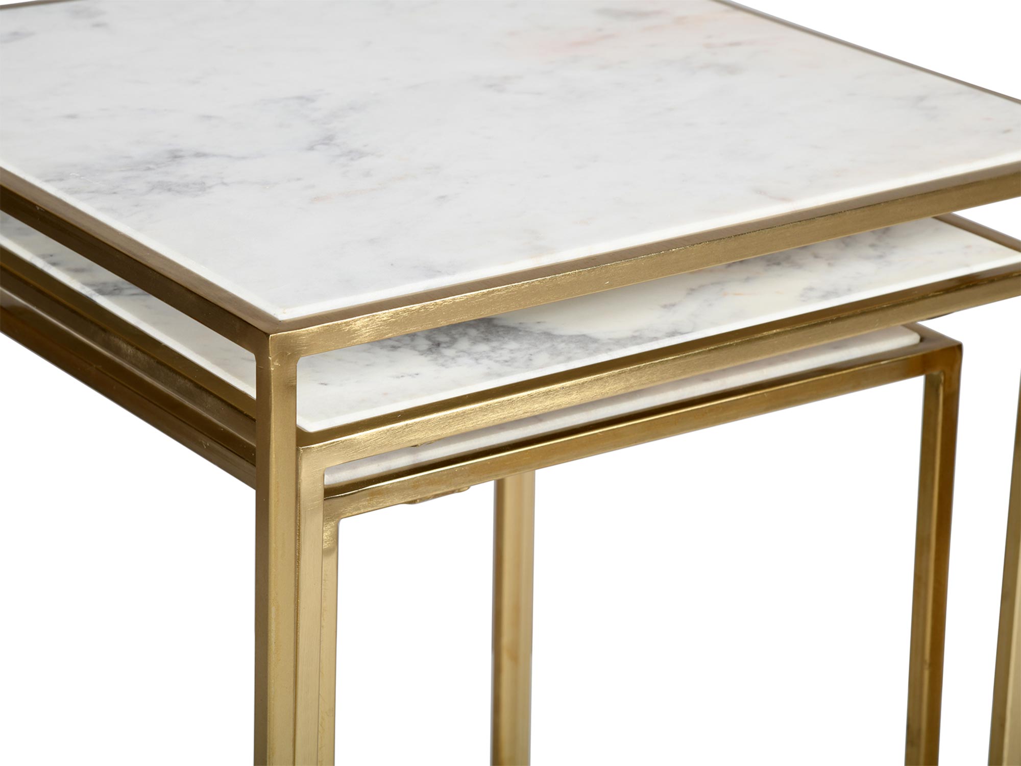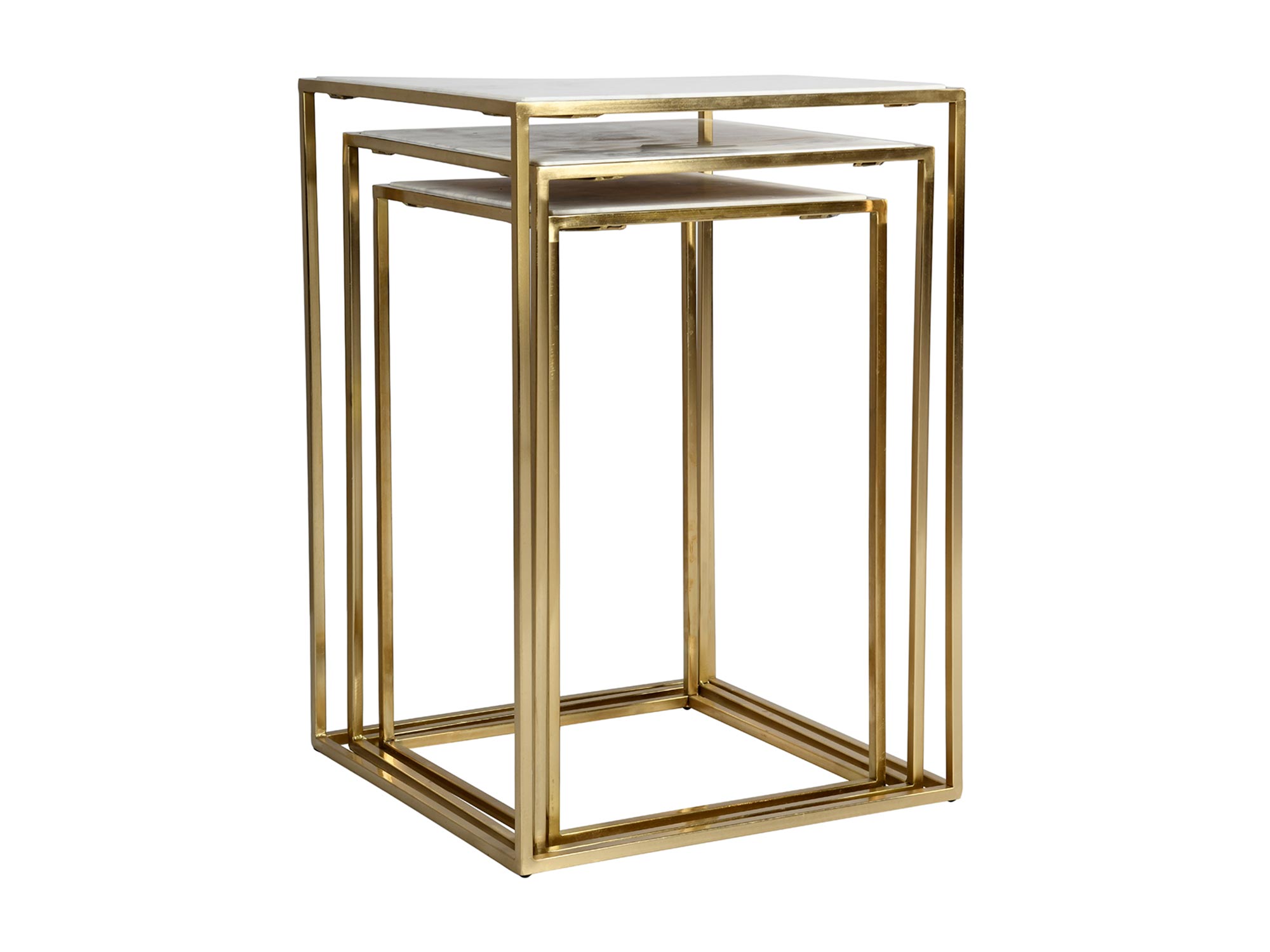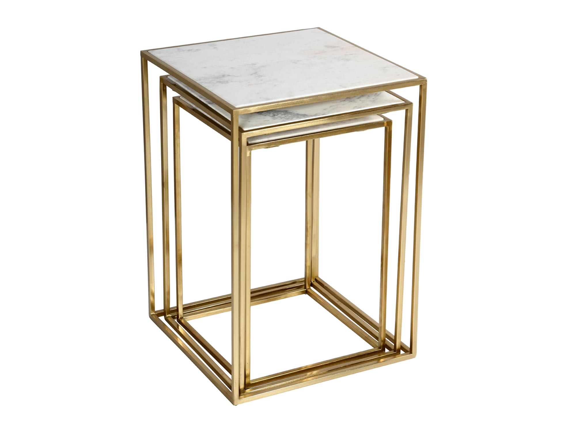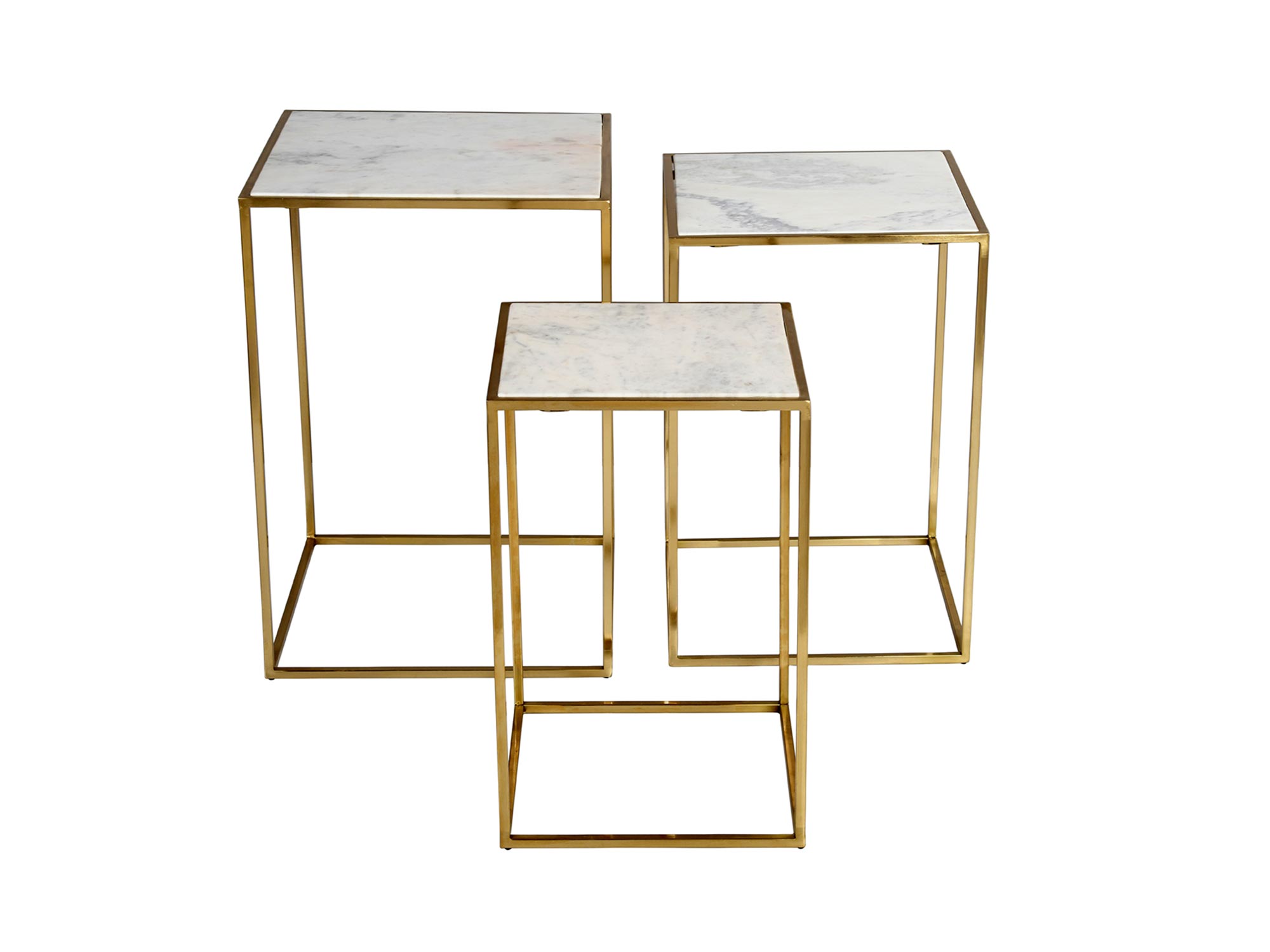 Zestaw stolików z naturalnym, marmurowym blatem w kolorze białym. Konstrukcja o podstawie w kwadratu wykonana jest z metalu w kolorze złotym. Stoliki można złożyć w jedną bryłę, chowając mniejsze w największym.