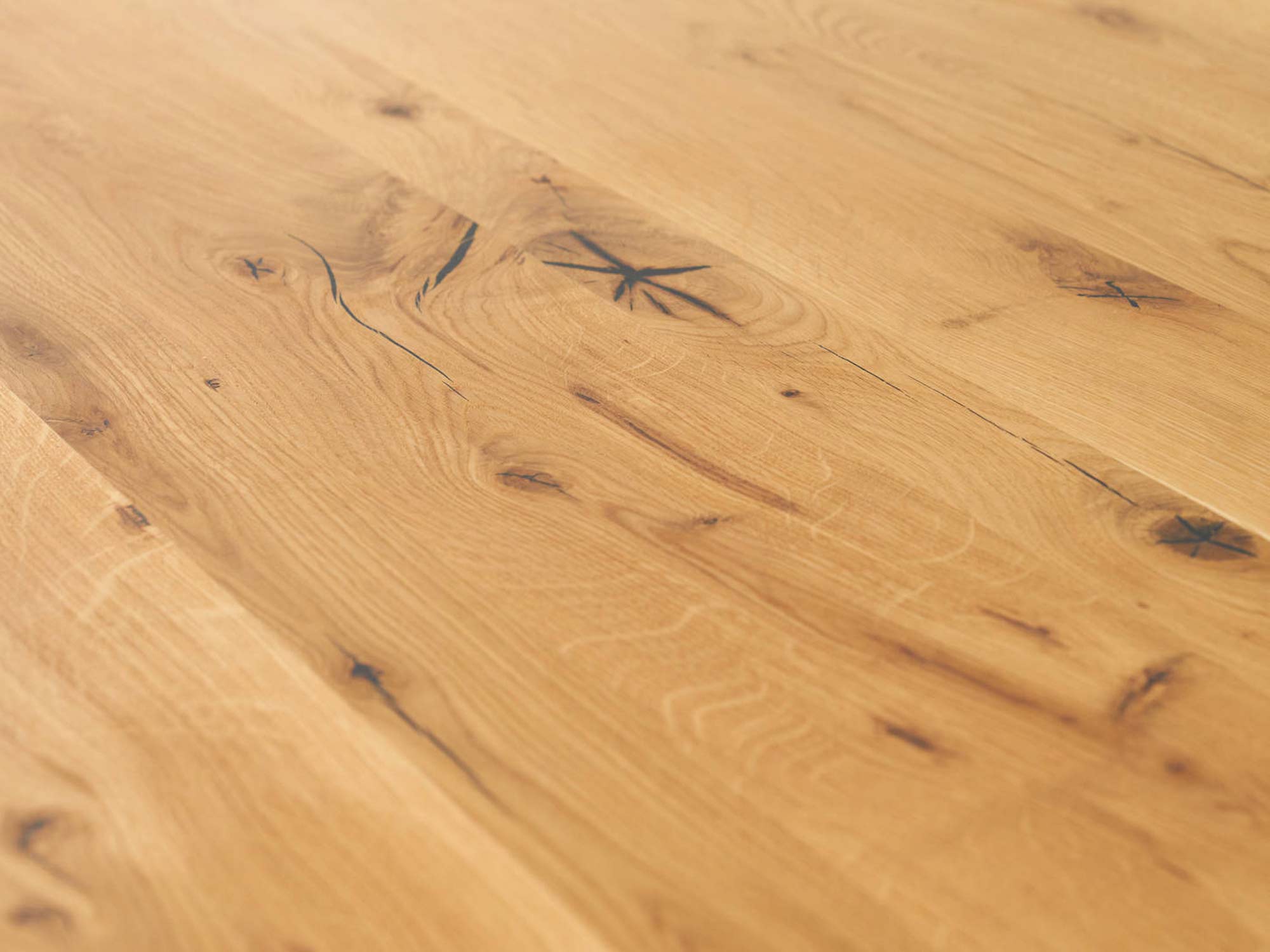 ECO  – blat dębowy o nieregularnym naturalnym kształcie wykonany z wyselekcjonowanego litego drewna dębowego klejonego na szerokości metodą przeciwprężną. Grubość blatu litego wynosi 40mm.