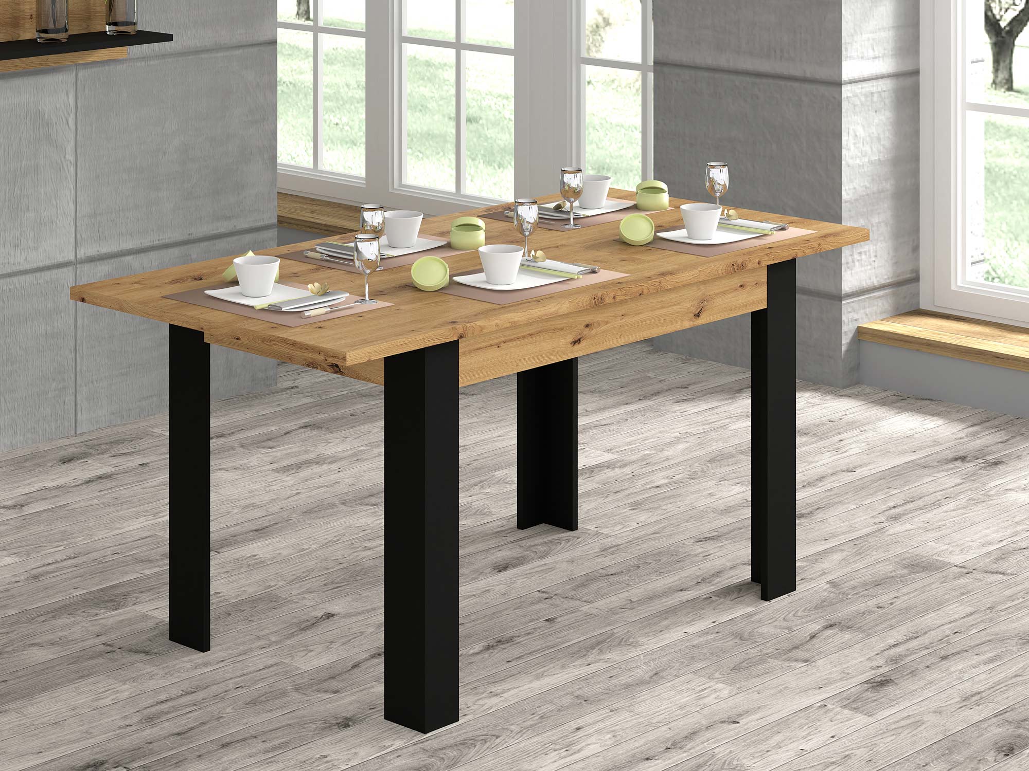 Bezsprzecznie stół to główny element aranżacji każdej jadalni czy kuchni. Z tego względu warto zadbać, aby nie tylko był stabilny i funkcjonalny, ale również pasował do reszty aranżacji. Prezentowany rozkładany stół w odcieniu dąb artisan IRFAN to propozycja o nowoczesnej barwie oraz stabilnych, czarnych nóżkach świetnie kontrastującymi z resztą mebla.