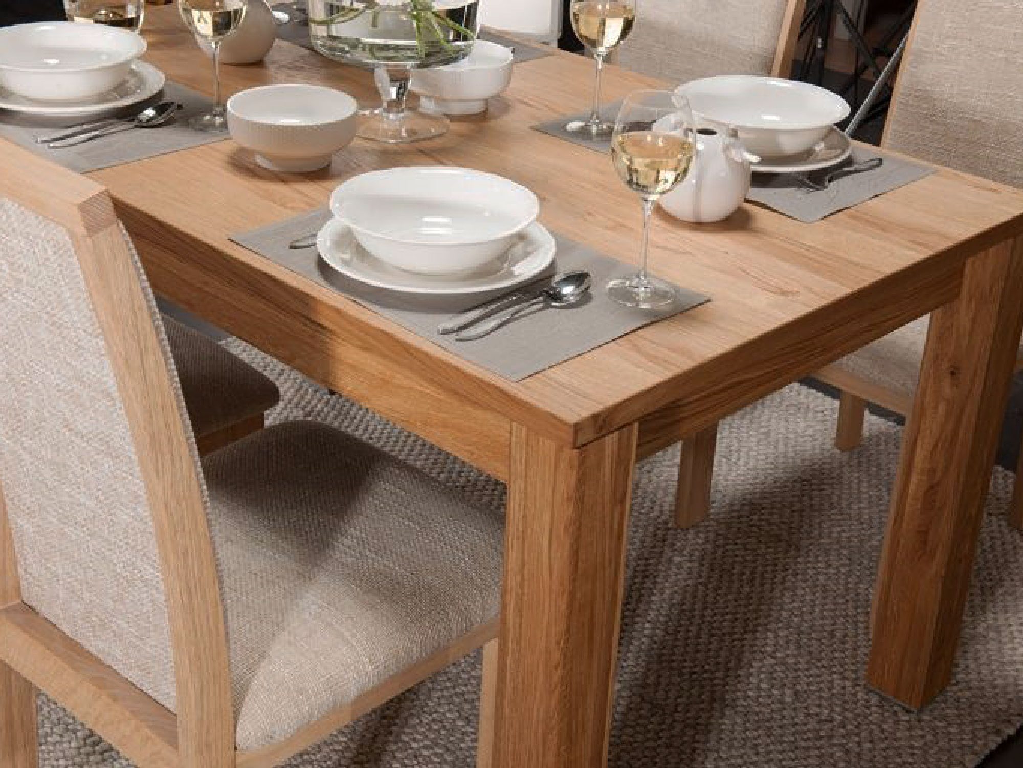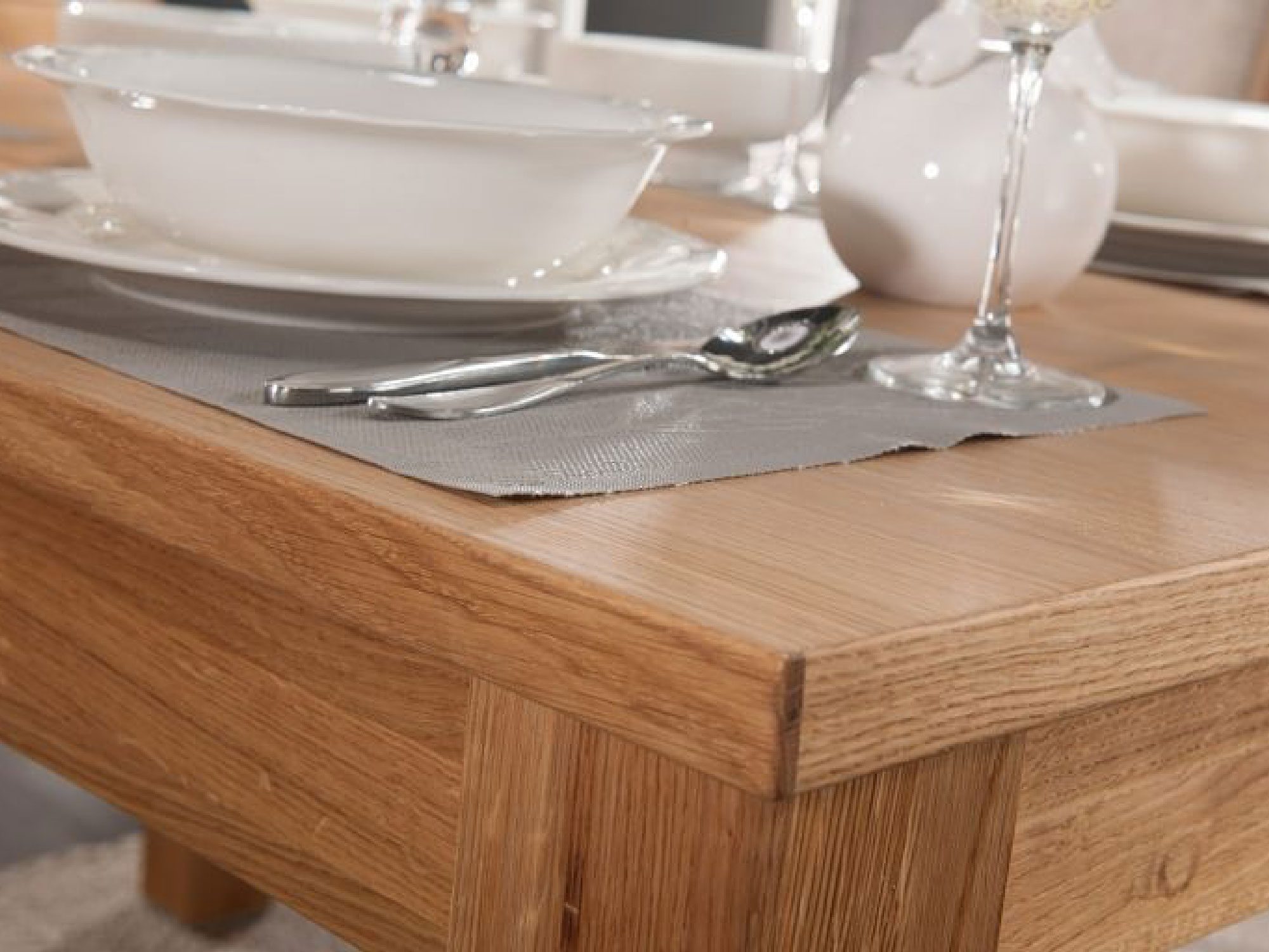 - Materiały Najwyższej Jakości: Nogi stołu wykonane są z litego dębu, oskrzynia również, a blat to płyta wiórowa fornirowana naturalnym dębem, co zapewnia trwałość i estetykę.