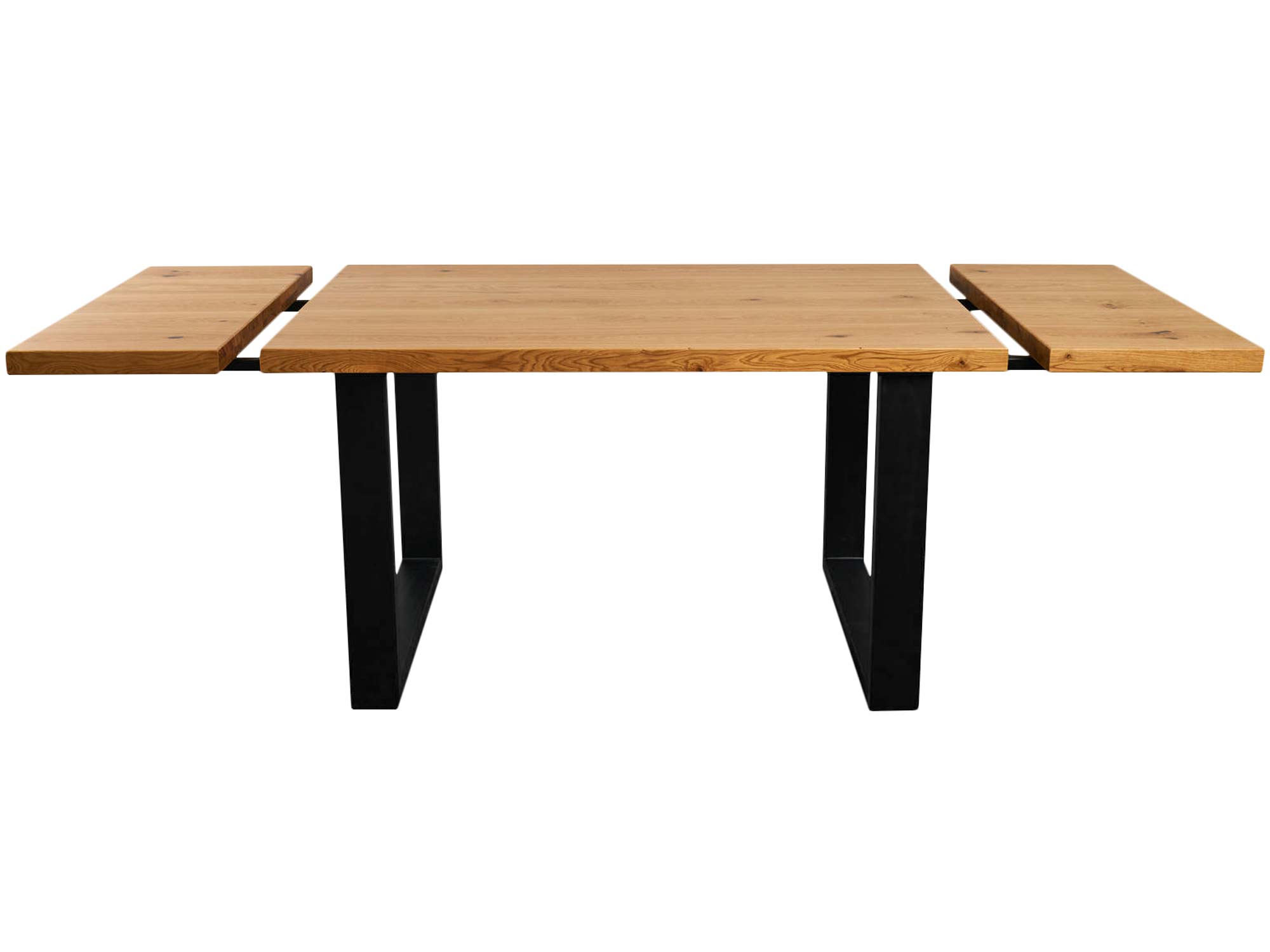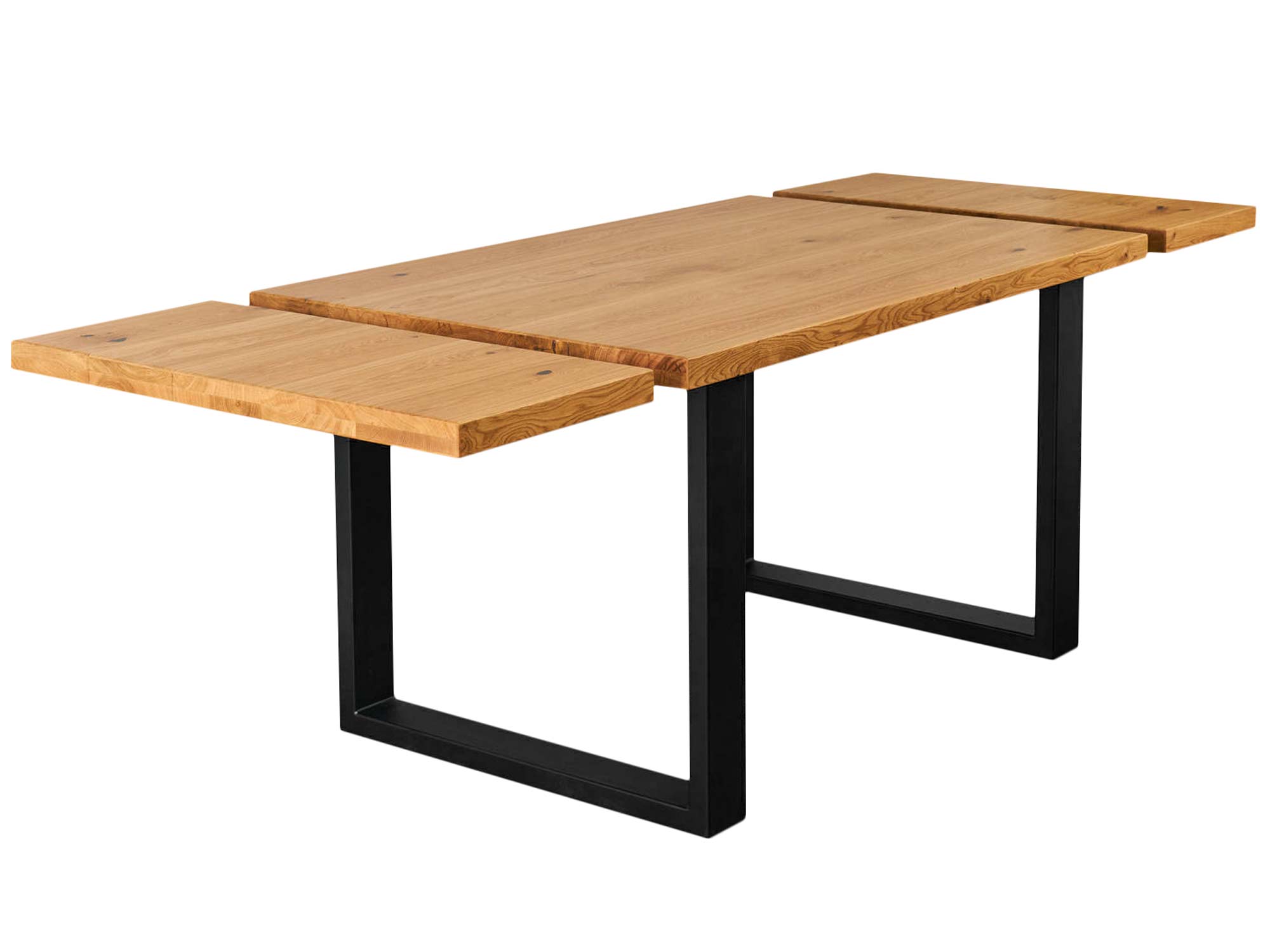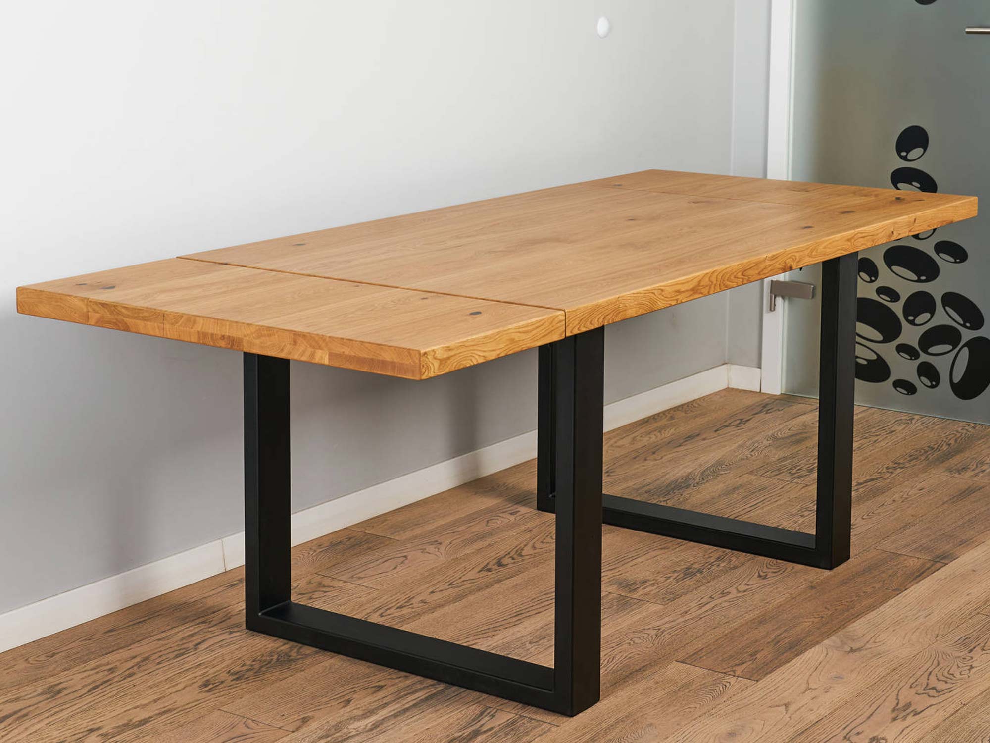 Po pierwsze Stół drewniany industrialny rozkładany na metalowych nogach to doskonałej jakości model, który stanowi idealne połączenie dębowego blatu z solidnymi metalowym nogami w czarnym kolorze. Po drugie stół został wyposażony w blat do wyboru w naturalnym nieregularnym kształcie lub prostym i skośnym wykończeniu krawędzi. Ponadto stół dzięki niezwykle praktycznym dostawkom pozwoli w prosty i szybki sposób pomieścić przy nim wszystkich zaproszonych gości.