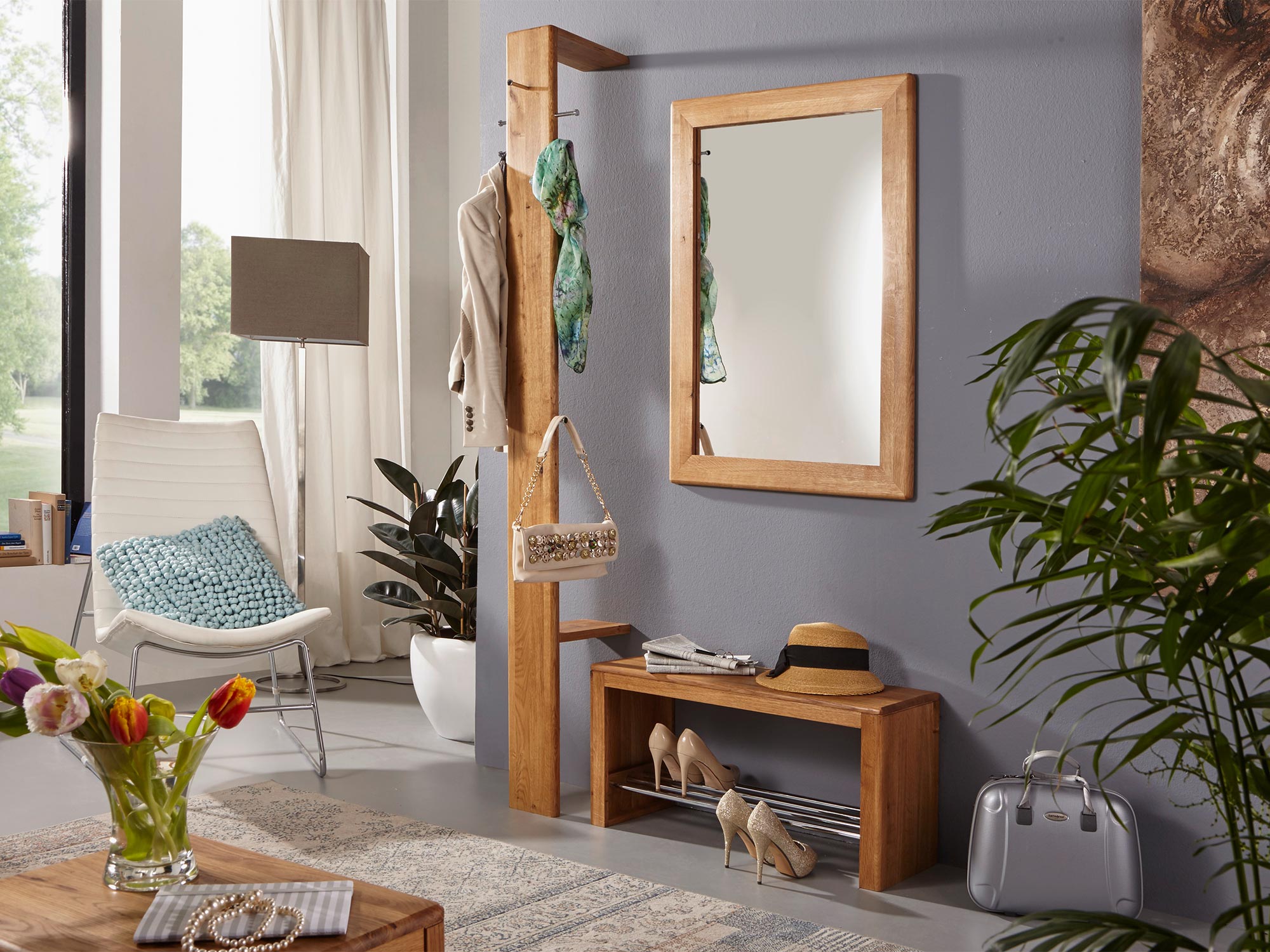 Przedpokój z szafką wiszącą, lustrem i siedziskiem