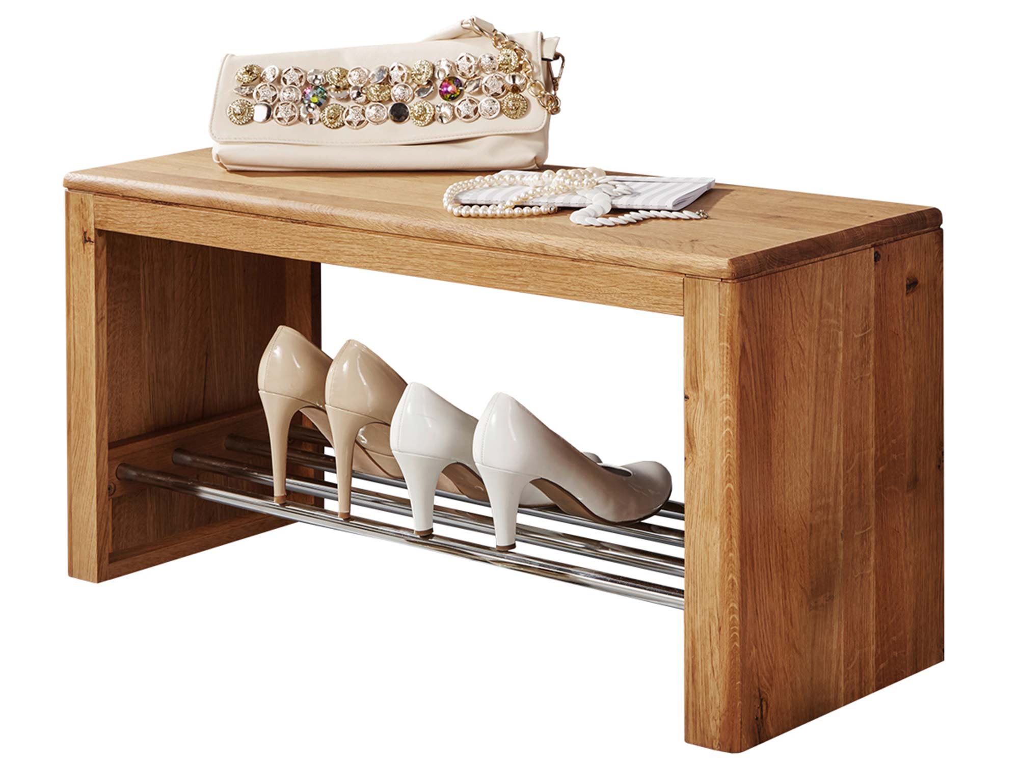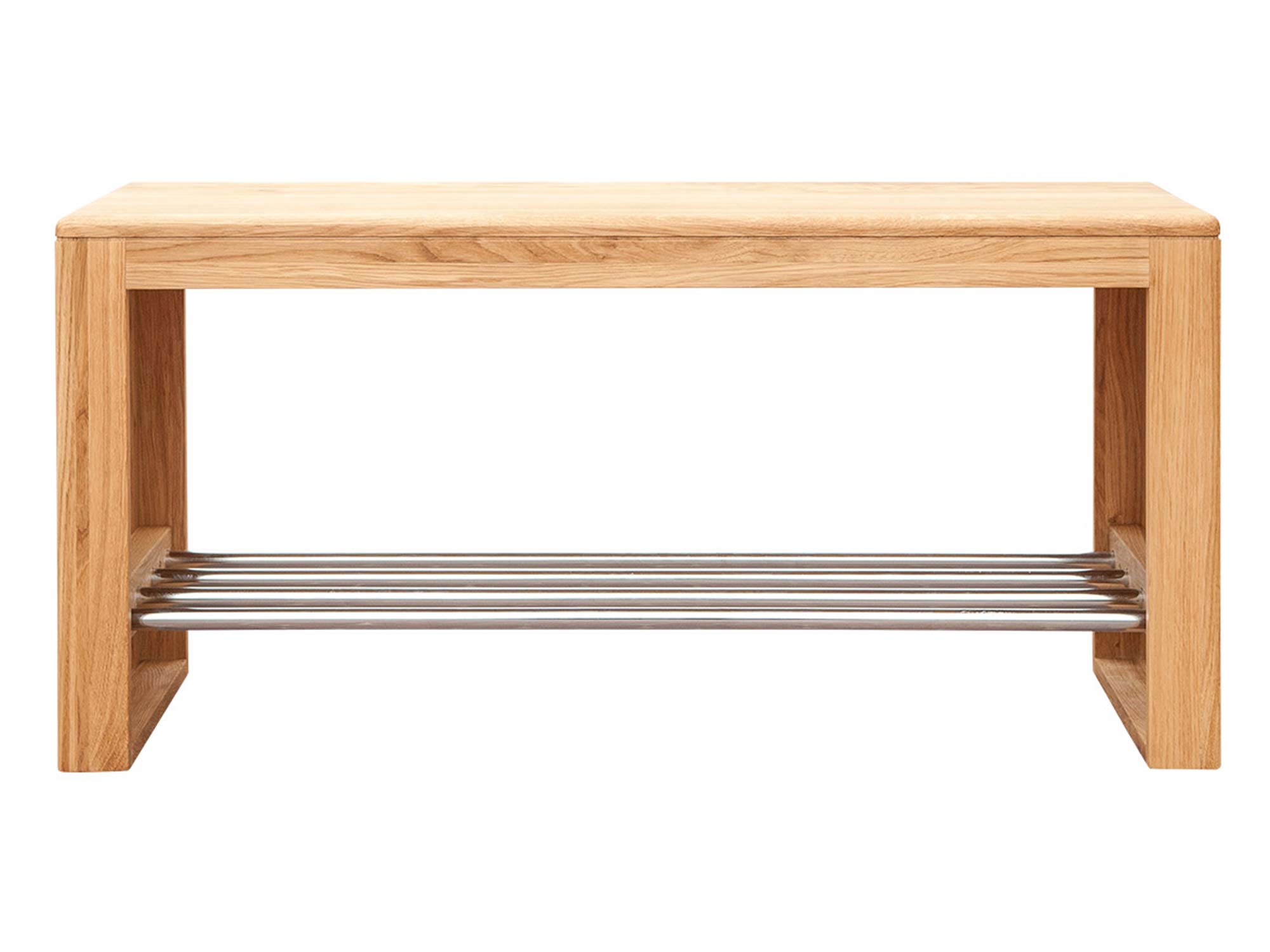 Dębowa ławka z metalowymi drążkami do przechowywania obuwia