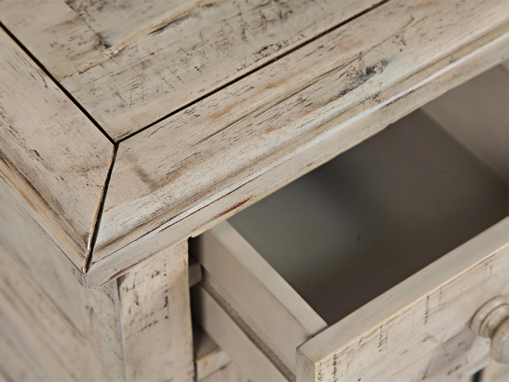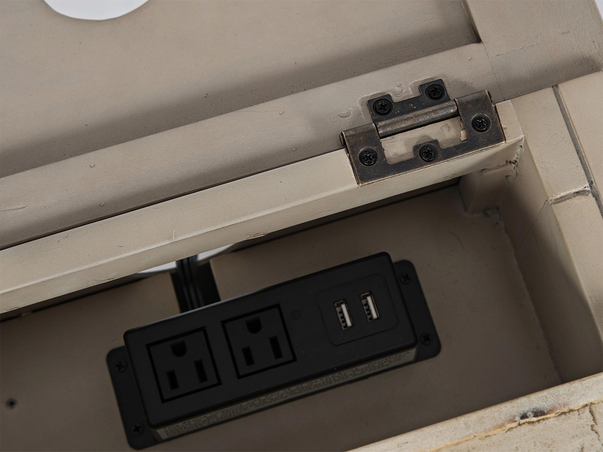 - Inne szczegóły: Wbudowane gniazdo USB, przetarcia shabby chic, ozdobne listewki, frezowany blat