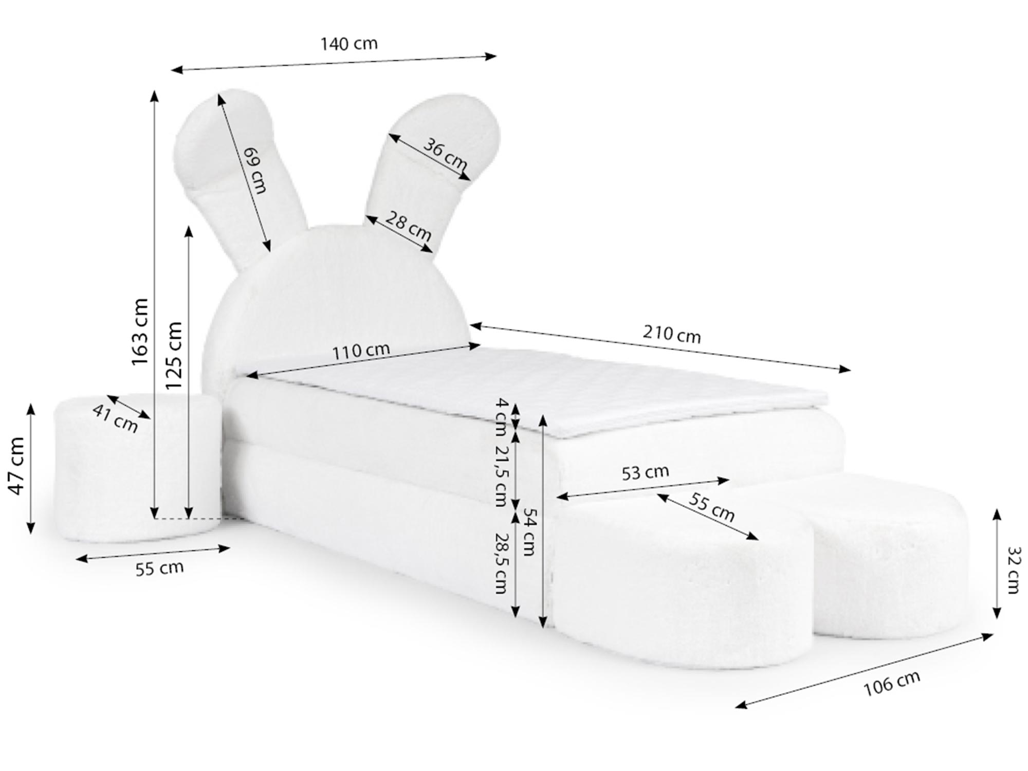 Łóżko dziecięce z pluszowymi oparciami, białe, wymiary techniczne