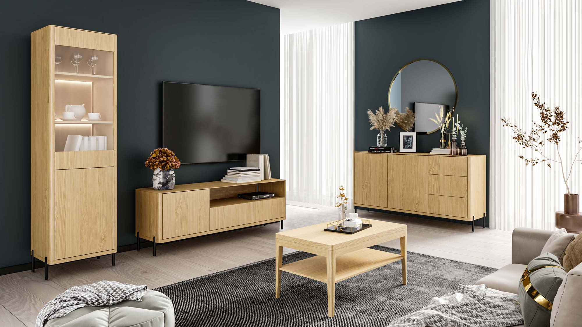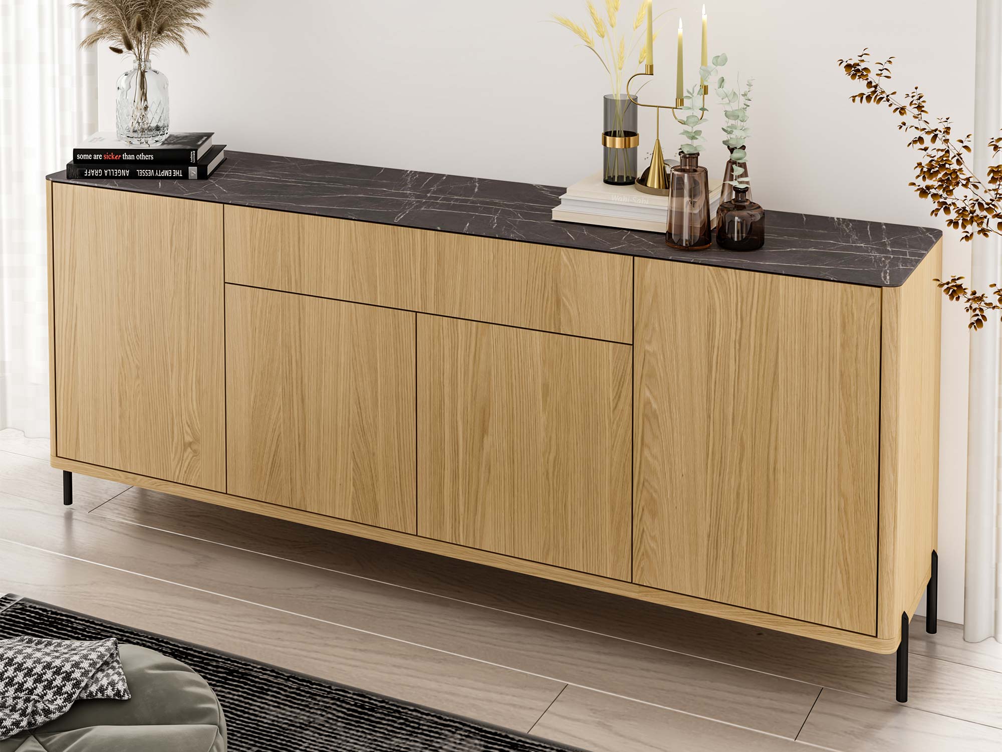 Wykończenie w kolorze dębu alpejskiego naturalnego wprowadza ciepło i naturalność, a unikalny rysunek drewna nadaje bryle autentycznego charakteru. Blaty wykonane ze spieku kwarcowego zapewniają elegancki wygląd i trwałość – są odporne na zarysowania i łatwe w pielęgnacji. To luksus zamknięty w detalach.