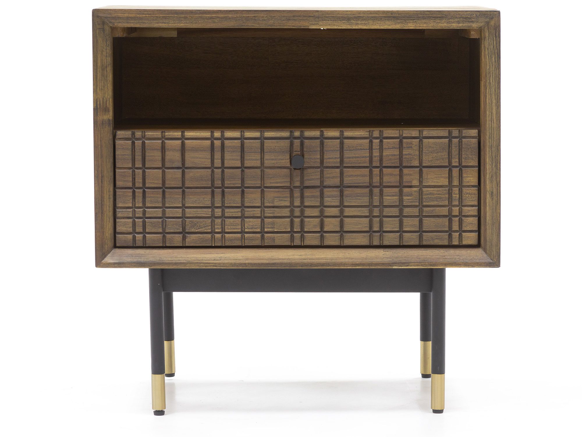 Szafka drewniana w stylu retro, wykonana z wysokiej jakości szczotkowanego drewna akacji egzotycznej, z metalowym prostym uchwytem. Fronty posiadają strukturę 3D. Metalowe proste nóżki koloru czarnego w półmacie zakończone złotym akcentam.