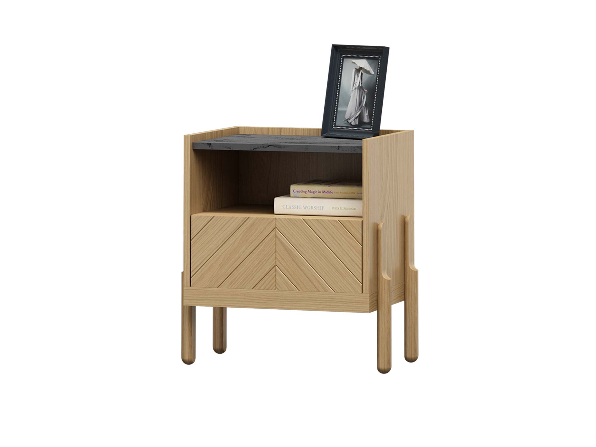 Projektując tę szafkę nocną, zadbano o to, by była nie tylko piękna, ale i funkcjonalna. System push-to-open eliminuje potrzebę stosowania uchwytów, co nadaje bryle minimalistycznego charakteru i ułatwia codzienne użytkowanie. Wystarczy delikatny nacisk, aby otworzyć szufladę, która oferuje miejsce na najpotrzebniejsze drobiazgi.