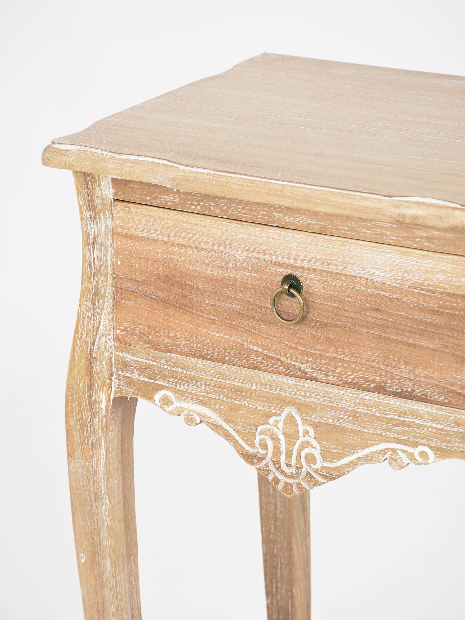 Szafka Nocna Viva to wyjątkowy mebel, który doda elegancji każdemu wnętrzu. Wykonana z bielonego drewna paulowni, posiada subtelne przetarcia, rzeźbienia oraz ozdobne metalowe uchwyty w kształcie muszelek. Jej jasnobrązowy kolor oraz gięte nóżki nadają jej lekkości, a ręcznie wykonane detale zapewniają unikalny charakter. Ta komoda będzie idealnym dodatkiem do sypialni, salonu czy przedpokoju, wprowadzając do Twojego domu przytulność i ponadczasowy styl.