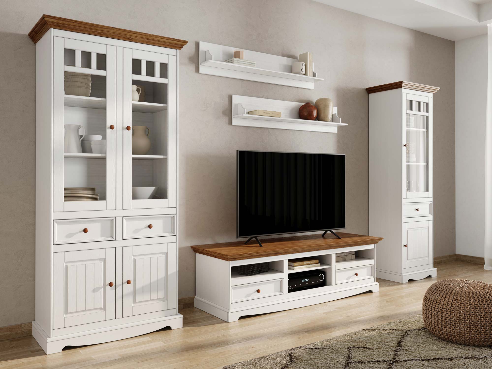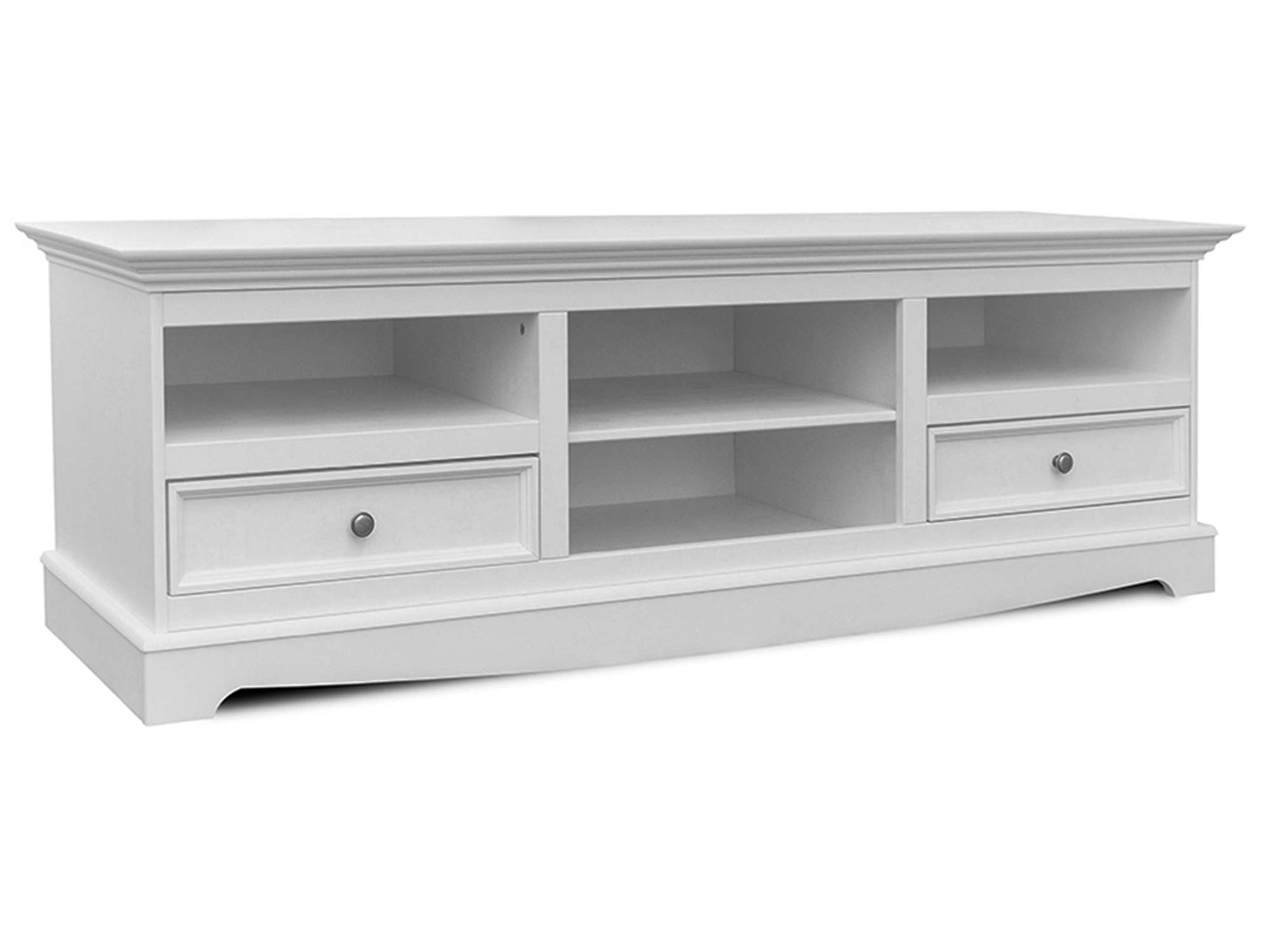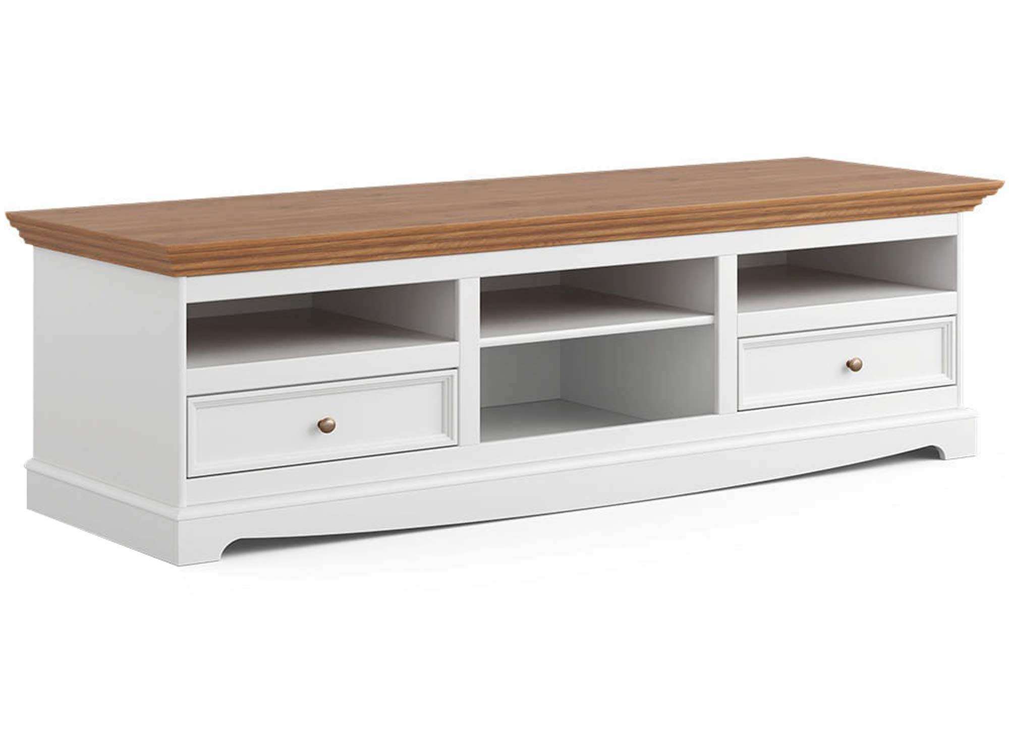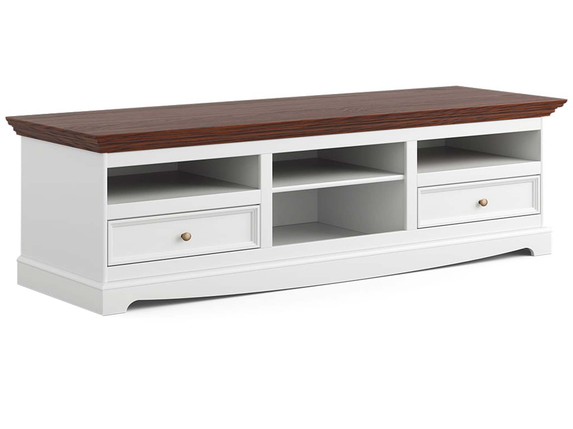 Przede wszystkim duża szafka RTV vintage INGRID zapewnia niezbędne miejsce na wszelkie akcesoria telewizyjne. Co najistotniejsze trzy otwarte półki pozwalają na zamontowanie niezbędnych dekoderów jak i umieszczenie drobnych dekoracji, płyt czy pilotów mając je pod ręką. Dodatkowo dwie szuflady to kolejna przestrzeń na przechowywanie na płyty, kolekcje filmów czy inne akcesoria. Ponadto blat pozwala na postawienie telewizora lub w przypadku powieszenia go, wyeksponowanie drobnych dekoracji czy pamiątek rodzinnych. Co więcej metalowe uchwyty w kolorze starego złota/srebra nadają meblu niepowtarzalny charakter. Bez wątpienia subtelne frezy, podstawa oraz wykończenie blatu na styl prowansalski przykują uwagę oraz zachwycą niejeden wymagający gust. Ponadto szafka posiada okrągły otwór na plecach, co znacznie usprawni organizację kabli oraz poprawi estetykę całości. Dodatkowo przedstawiony mebel w połączeniu z innymi meblami z serii INGRID pozwoli stworzyć przytulną, praktyczną, pełną elegancji przestrzeń.