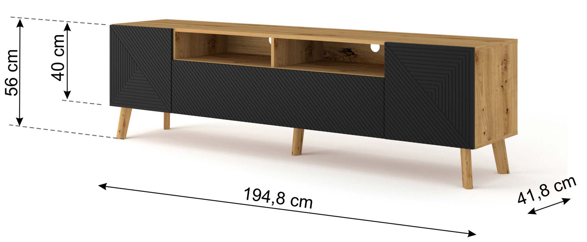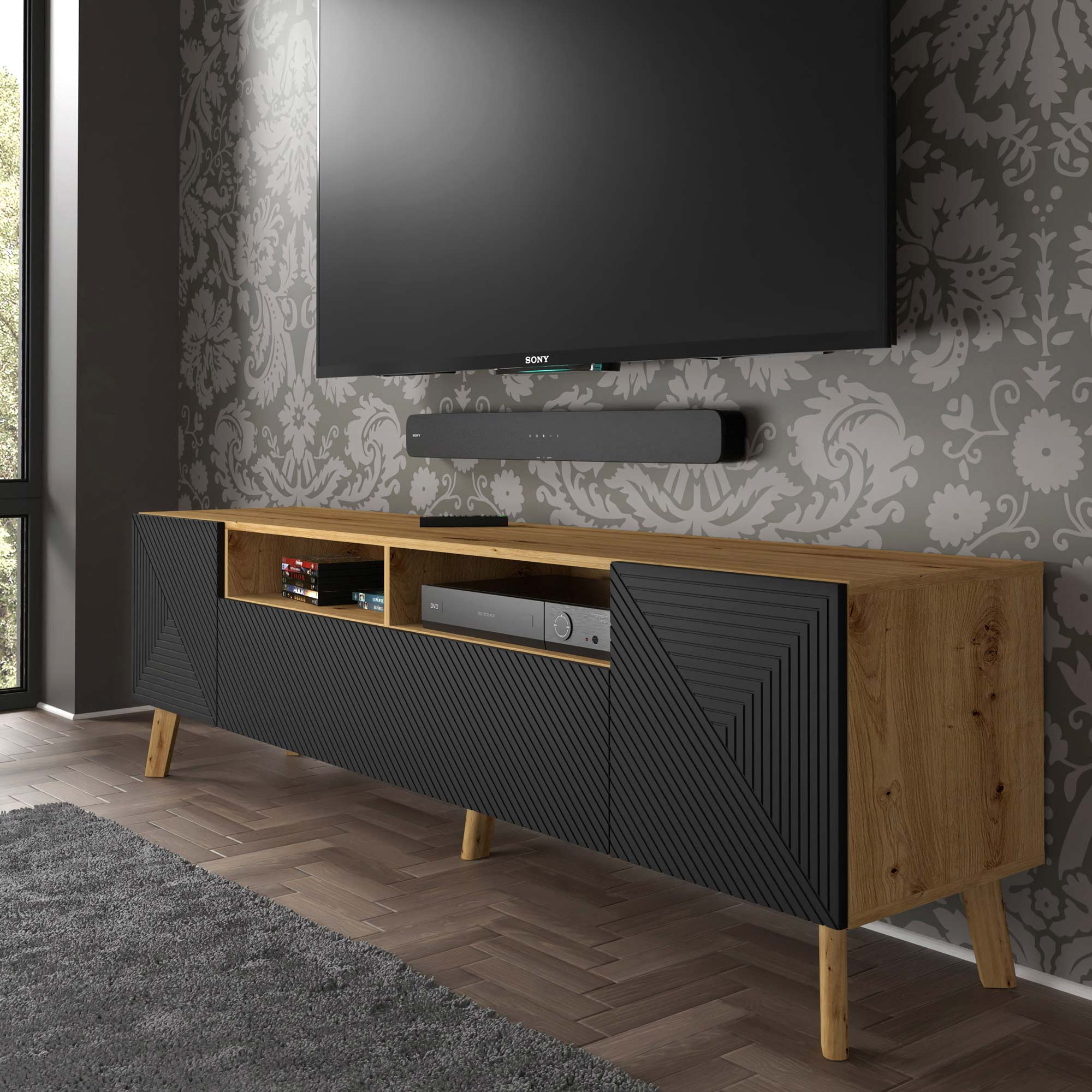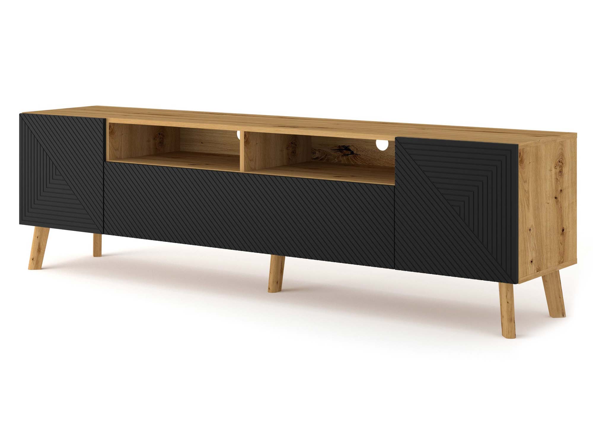 Prezentowana duża szafka pod TV to nieszablonowa propozycja do każdego nowoczesnego wnętrza. Swój wyjątkowy wygląd zawdzięcza unikalnym wyżłobieniom na froncie oraz ciekawym połączeniu czerni z odcieniem dąb artisan. Niewątpliwie doskonale zaprezentuje się w salonie czy pokoju dziennym projektowanym na styl loftowy czy industrialny. Z pewnością nie przytłoczy przestrzeni, a będzie prezentować się niezwykle elegancko i szykownie.