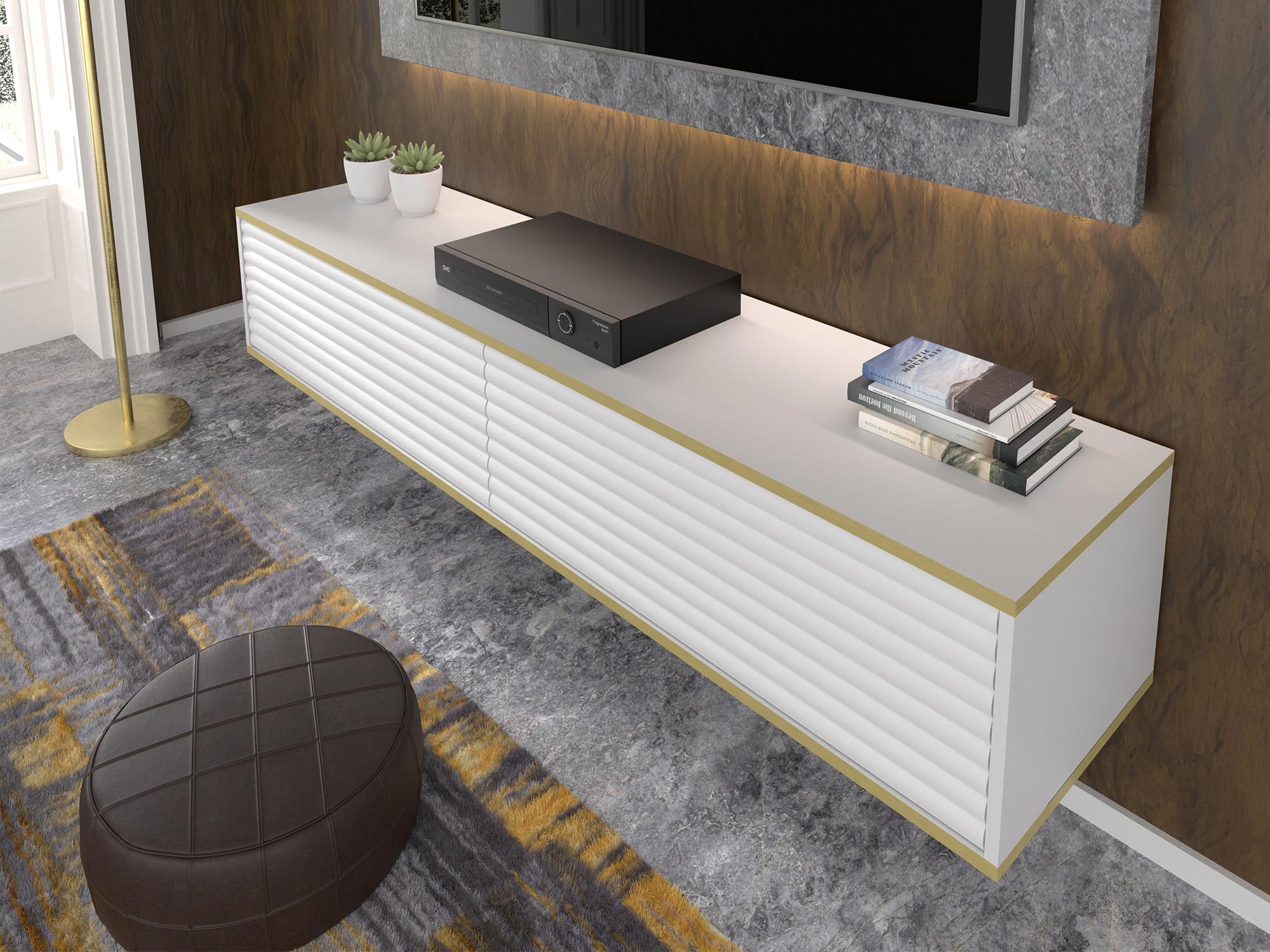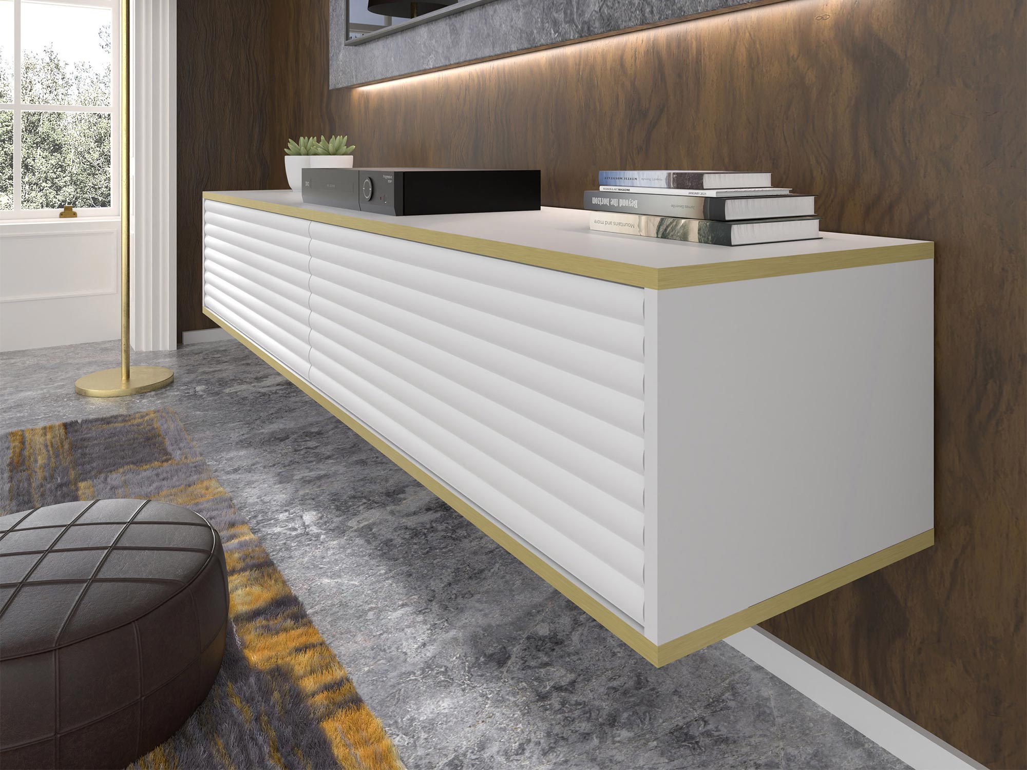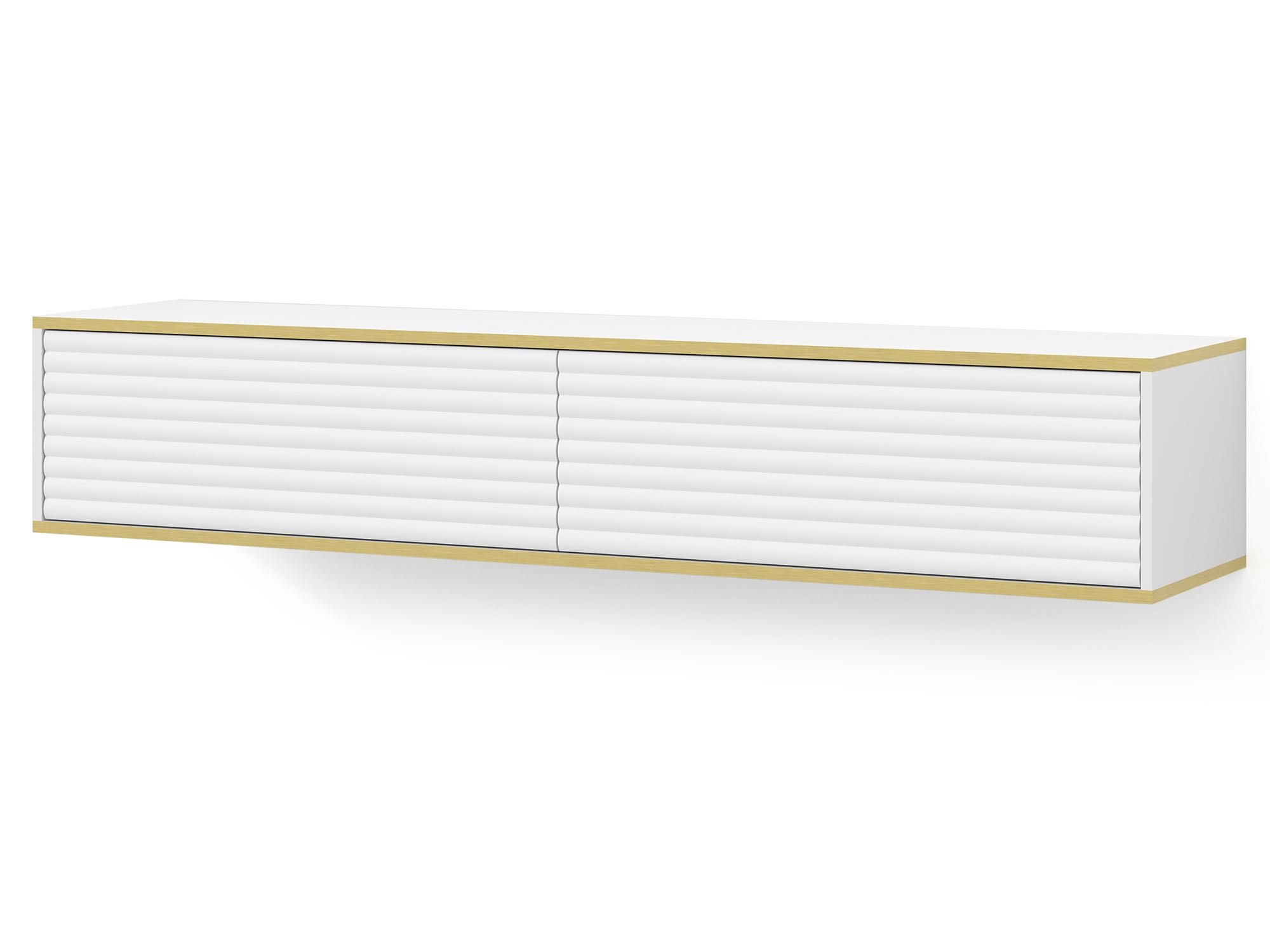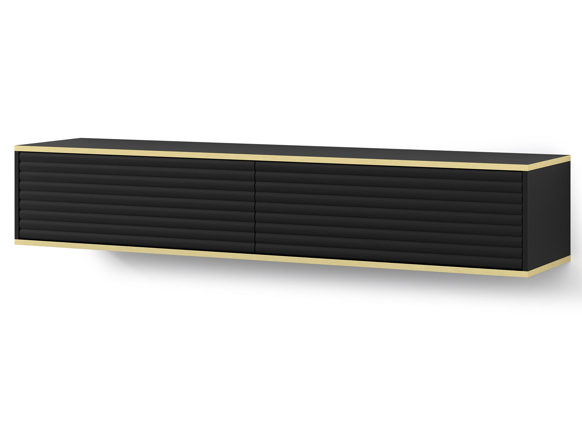Dwudrzwiowa Szafka RTV Verdi z Frezowanymi Frontami Wisząca to estetycznie zaprojektowany mebel, który doskonale sprawdzi się w salonie, sypialni oraz pokoju młodzieżowym. Odpowiadając na najnowsze trendy wnętrzarskie, szafka Verdi łączy funkcjonalność z nowoczesnym designem, oferując eleganckie frezowane fronty z efektem 3D oraz złote akcenty w postaci poziomych linii. Możliwość zawieszenia szafki na ścianie dodaje aranżacji lekkości i nowoczesnego charakteru, idealnie wpisując się w minimalistyczne trendy.