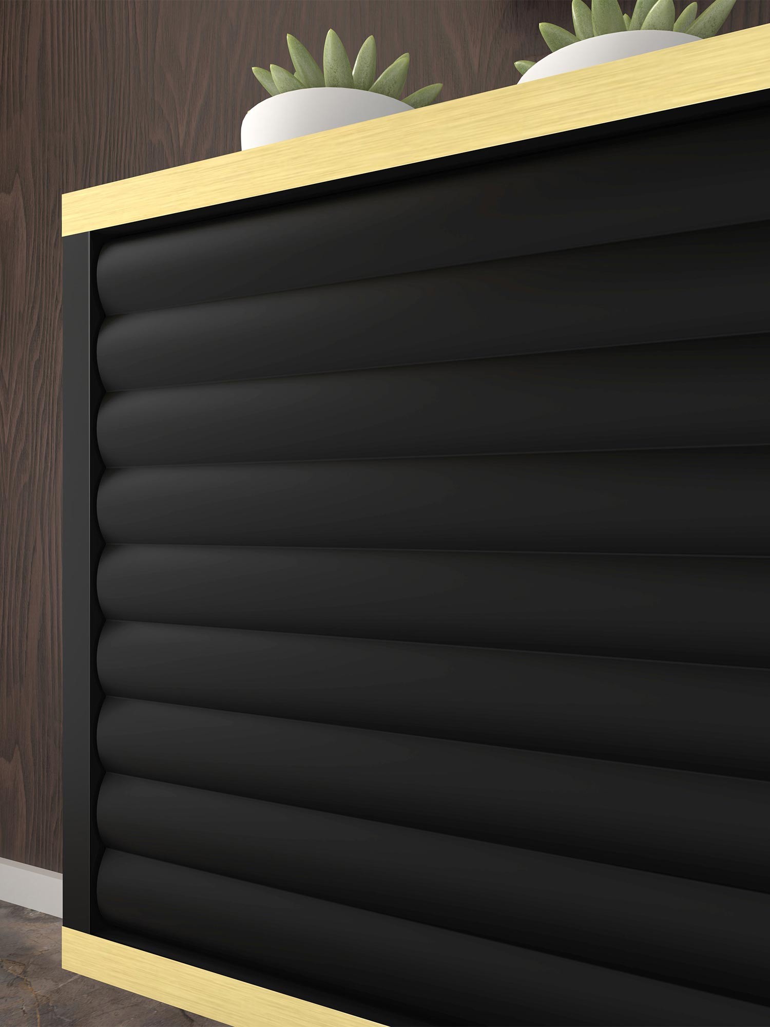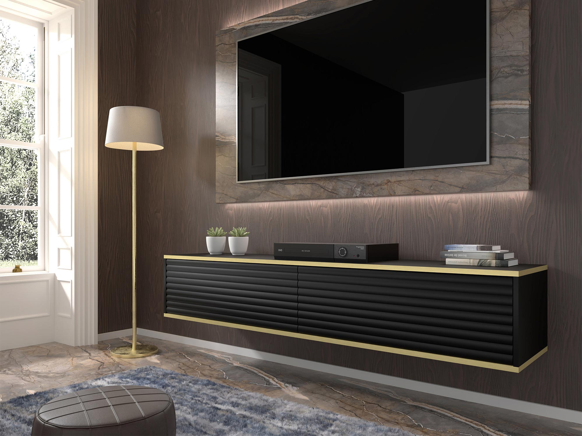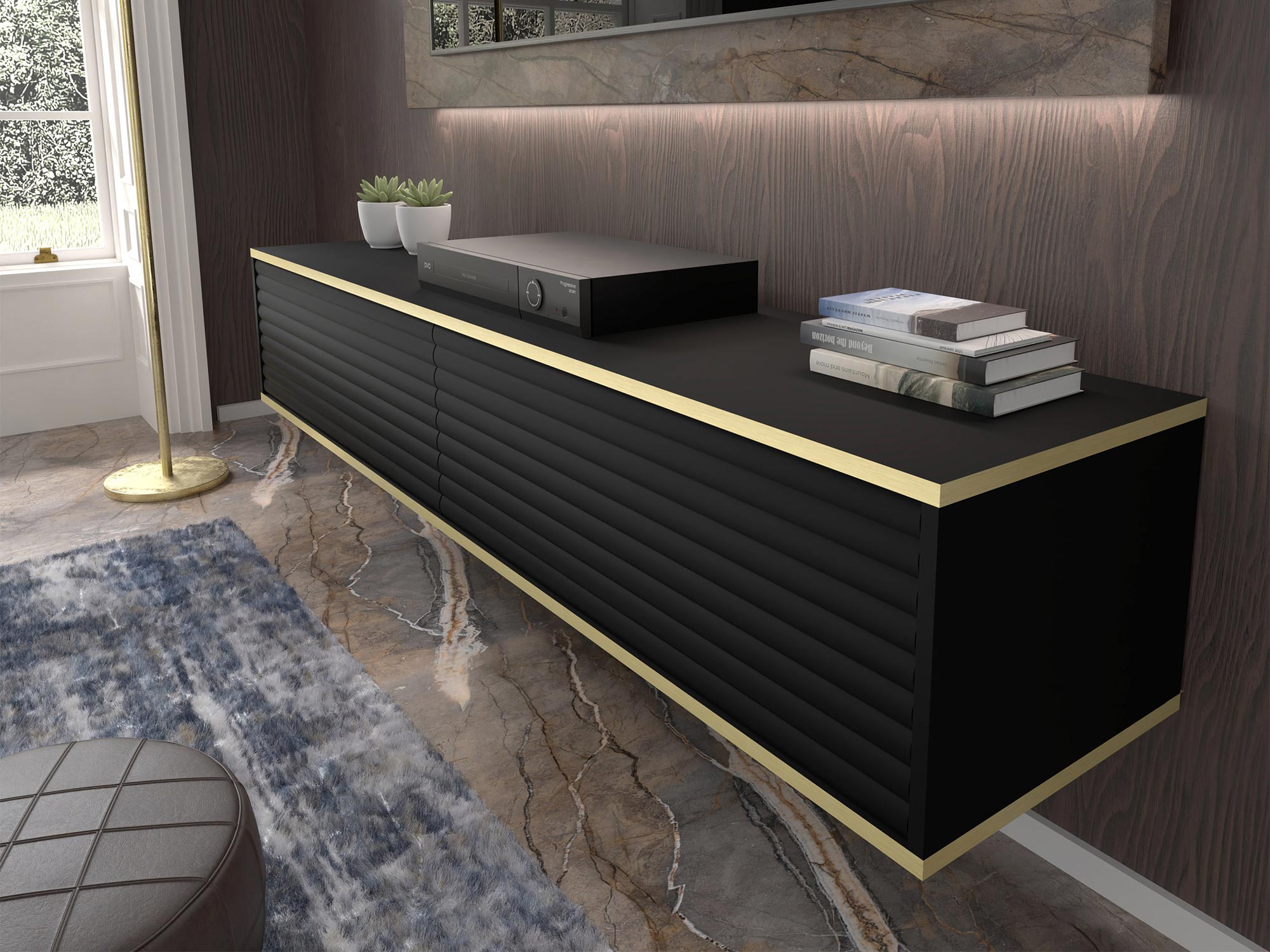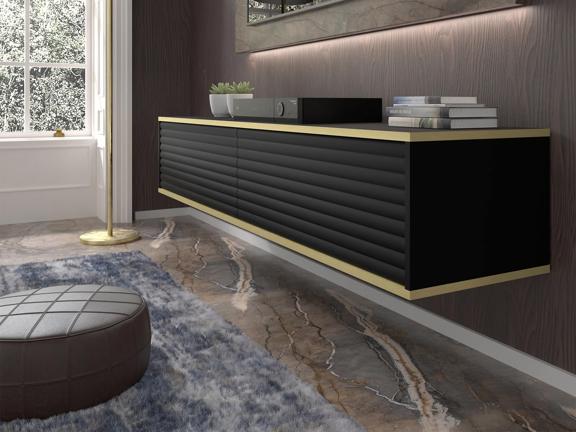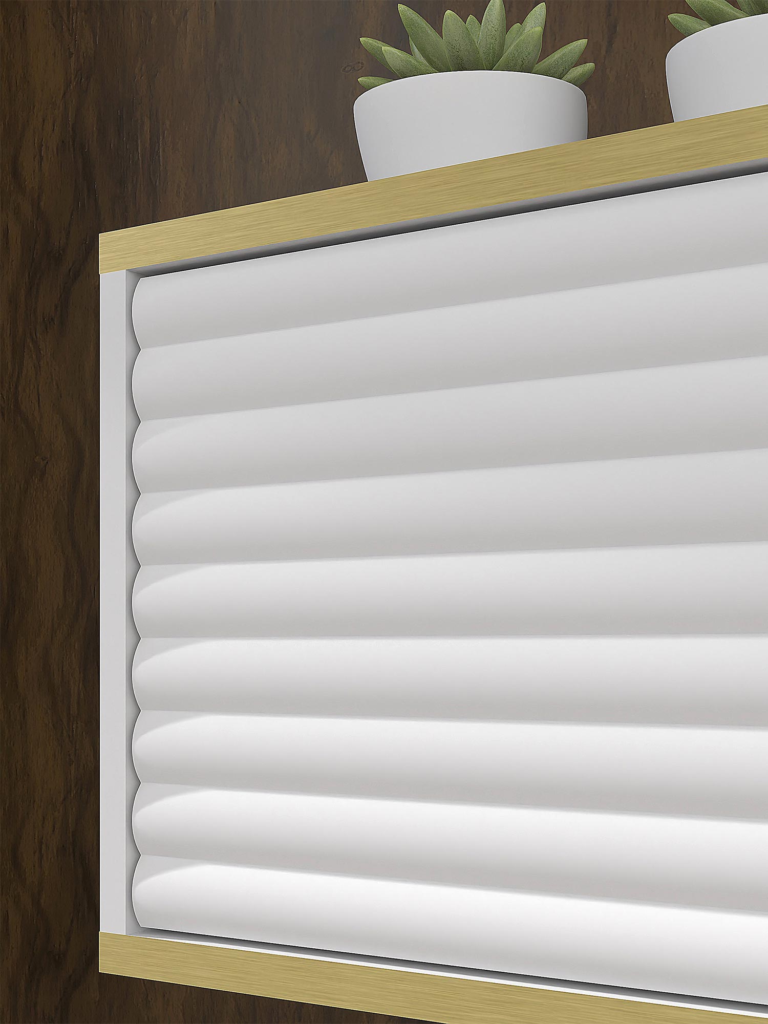 Dwudrzwiowa Szafka RTV Verdi z Frezowanymi Frontami Wisząca to estetycznie zaprojektowany mebel, który doskonale sprawdzi się w salonie, sypialni oraz pokoju młodzieżowym. Odpowiadając na najnowsze trendy wnętrzarskie, szafka Verdi łączy funkcjonalność z nowoczesnym designem, oferując eleganckie frezowane fronty z efektem 3D oraz złote akcenty w postaci poziomych linii. Możliwość zawieszenia szafki na ścianie dodaje aranżacji lekkości i nowoczesnego charakteru, idealnie wpisując się w minimalistyczne trendy.