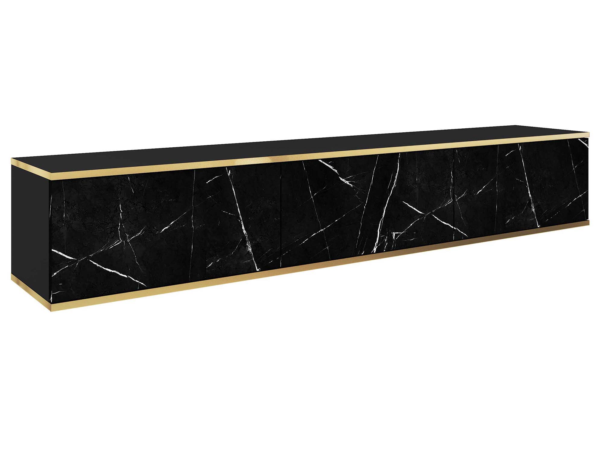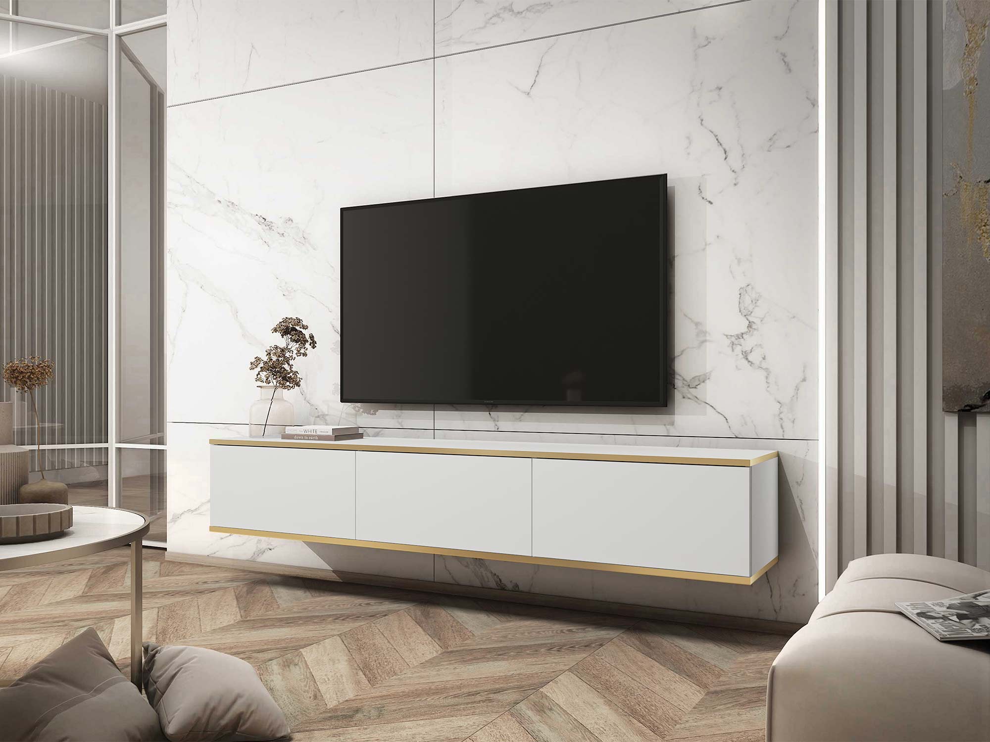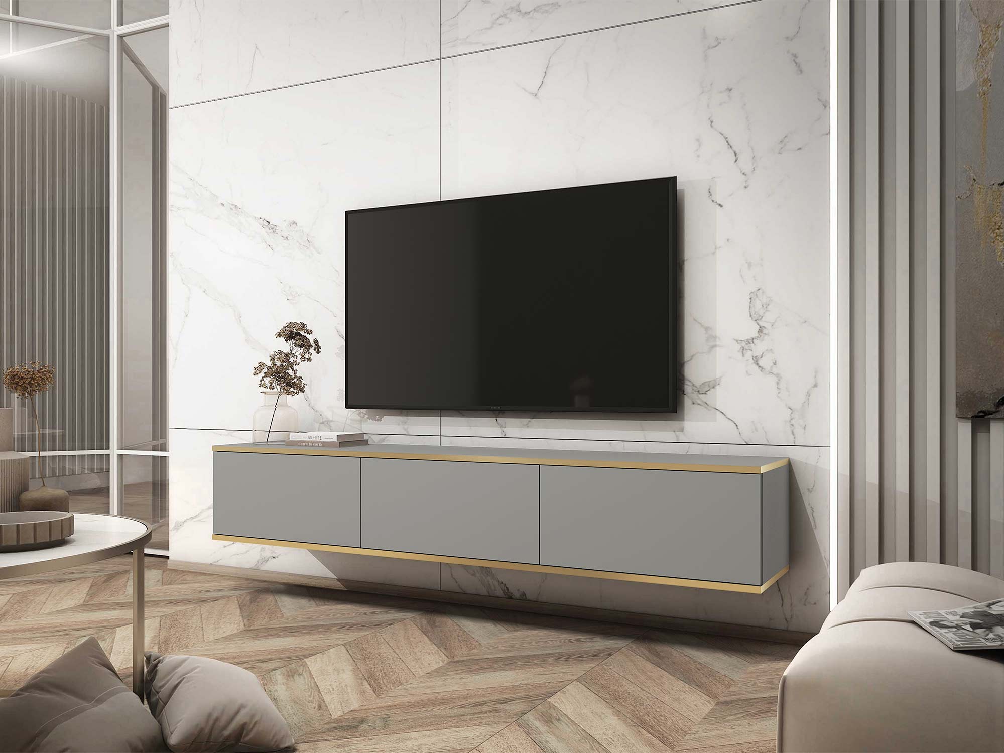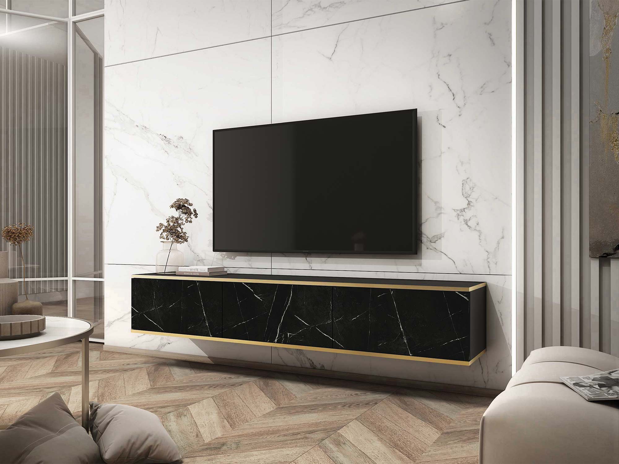 - Eleganckie akcenty: Złote listwy pięknie podkreślają horyzontalną formę szafki, dodając jej wyrafinowanego charakteru i elegancji.