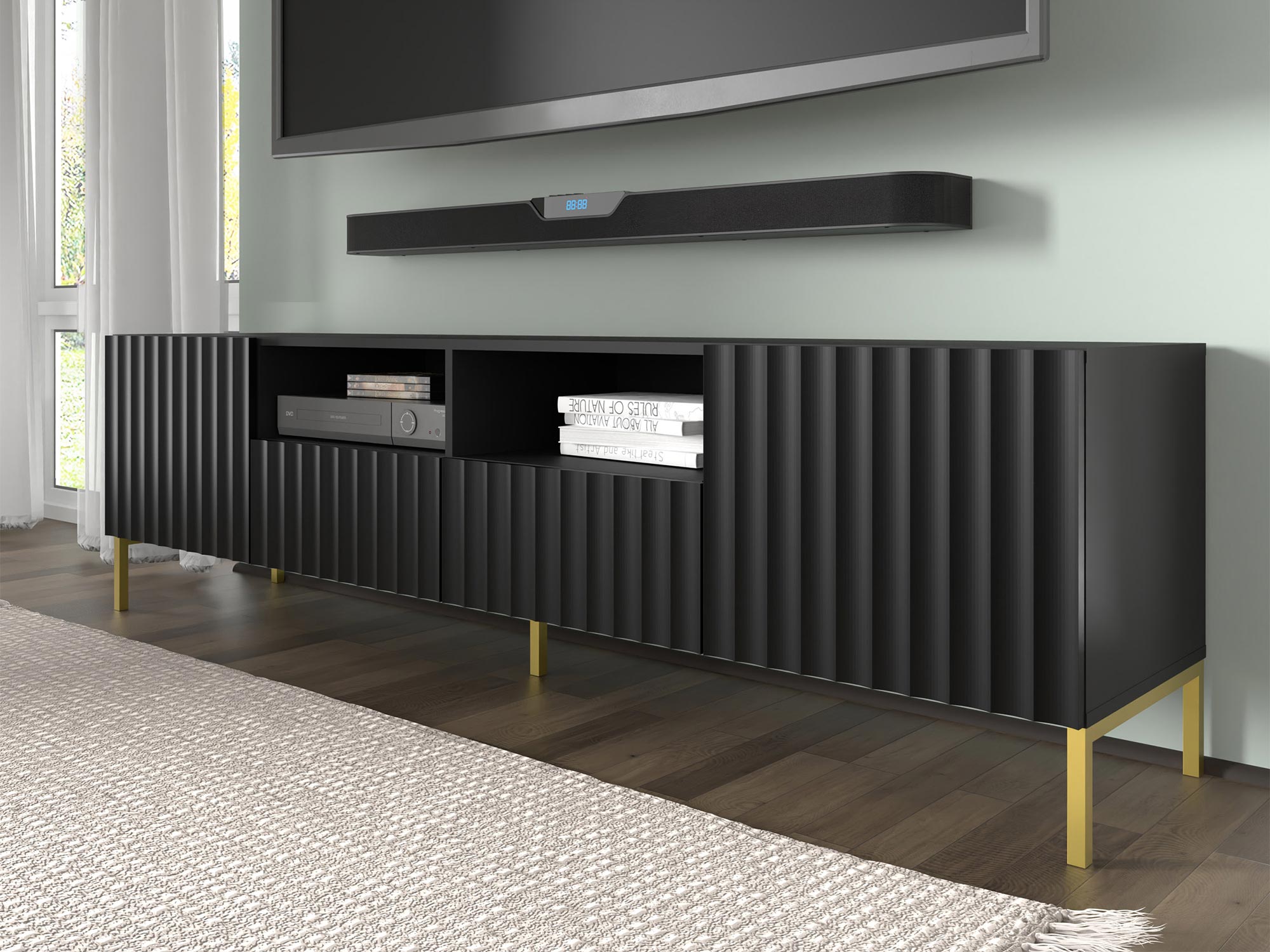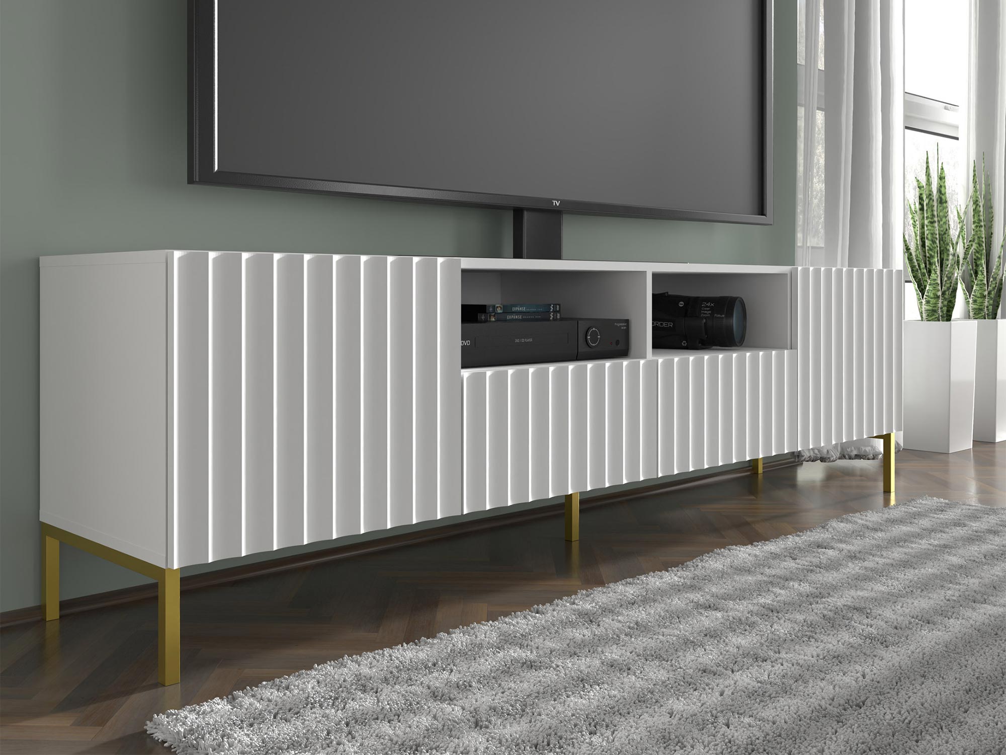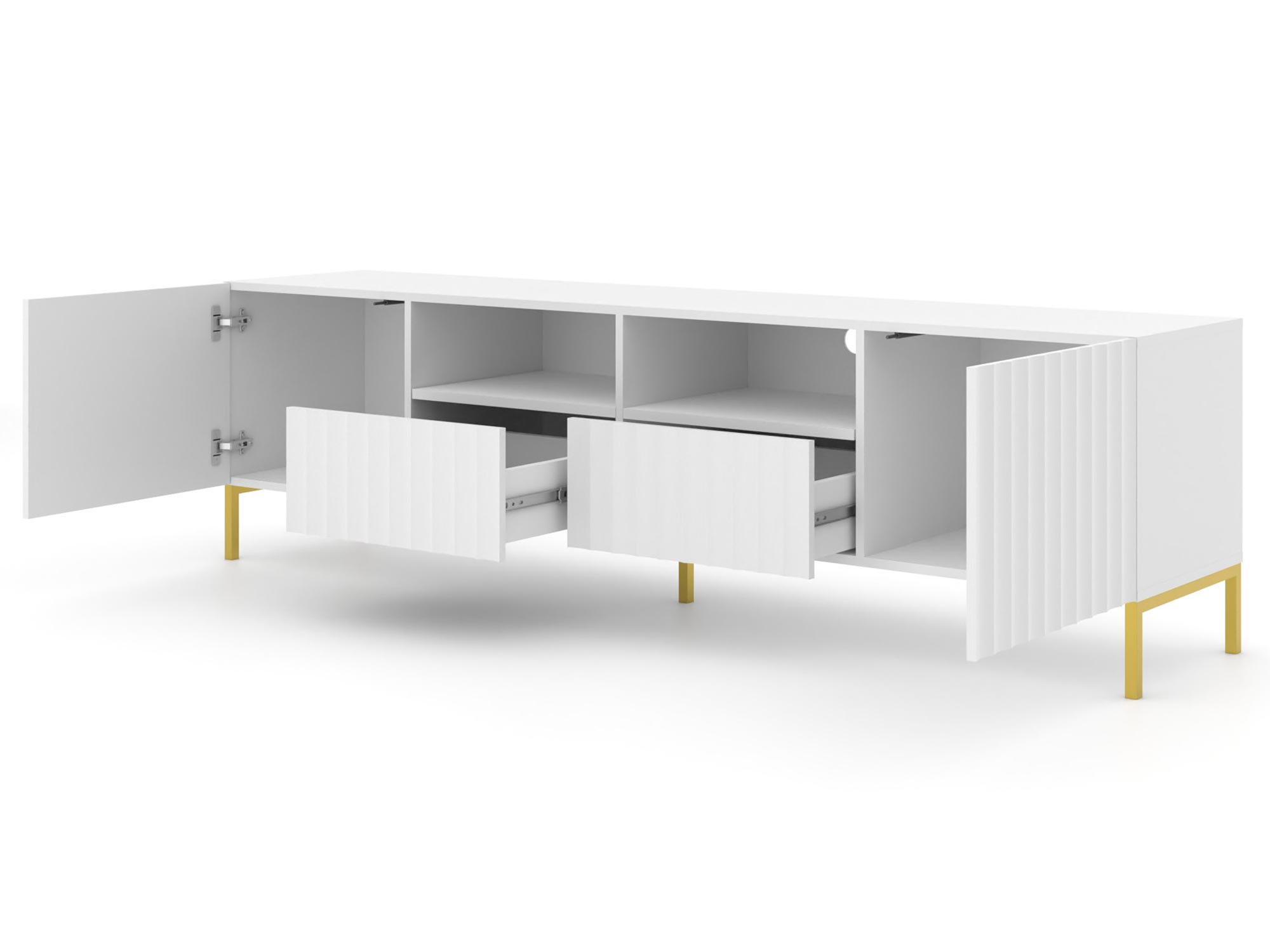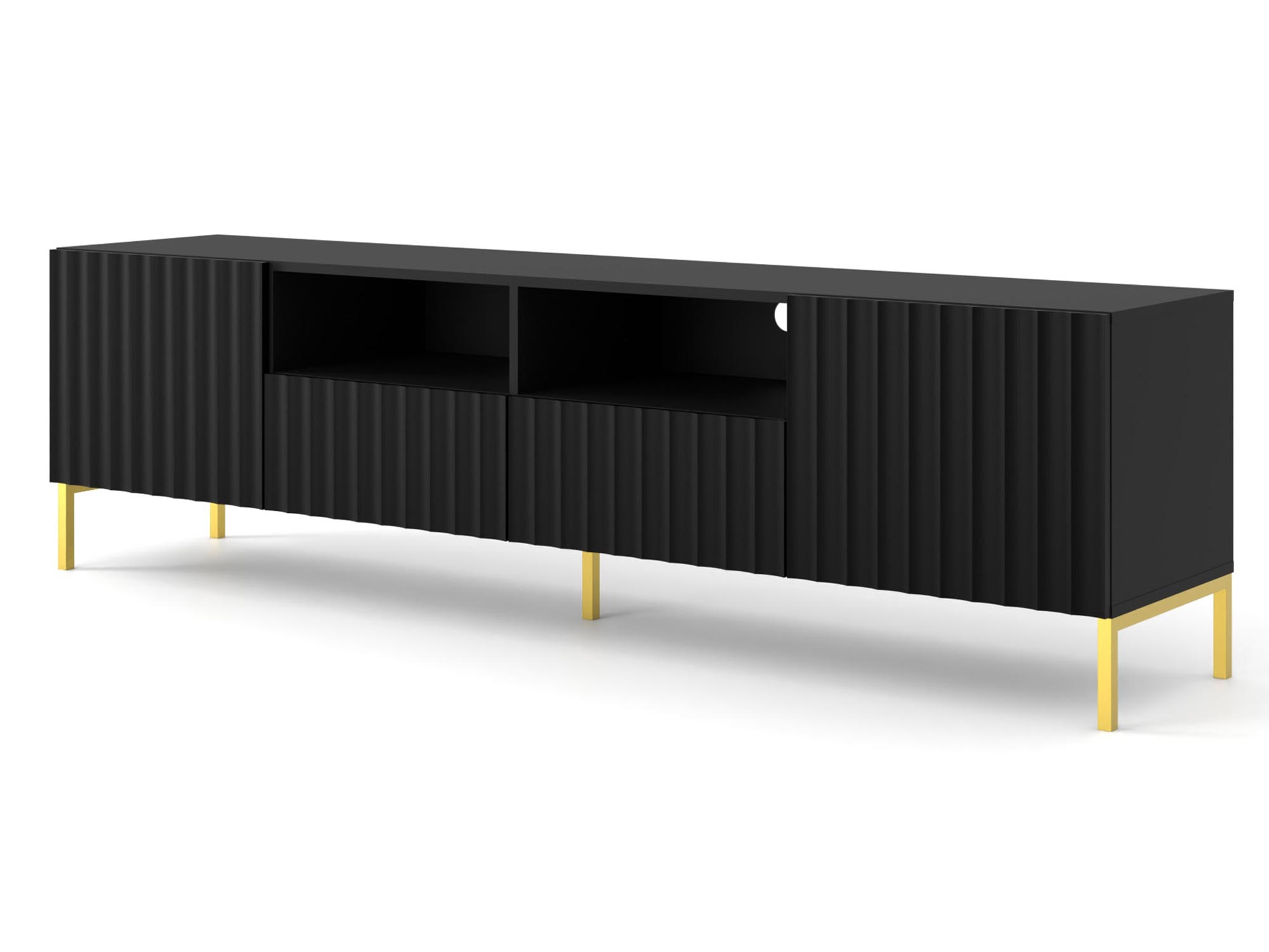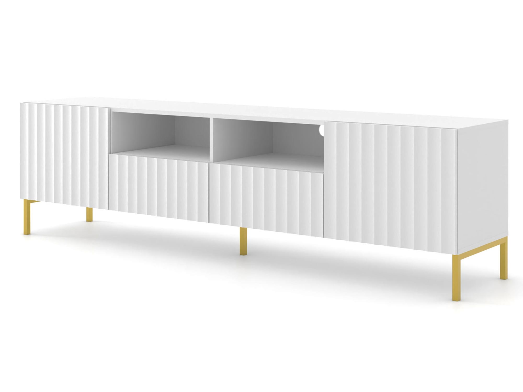 Funkcjonalna Szafka RTV Mare 200 cm z Wnęką zachwyca precyzyjnym wykonaniem i dbałością o detale. Frezowane fronty i subtelne malowanie nadają jej nowoczesnego wyglądu, który doskonale komponuje się z różnymi stylami wnętrzarskimi. Złote metalowe nogi dodają elegancji i sprawiają, że szafka staje się centralnym punktem każdego pomieszczenia.