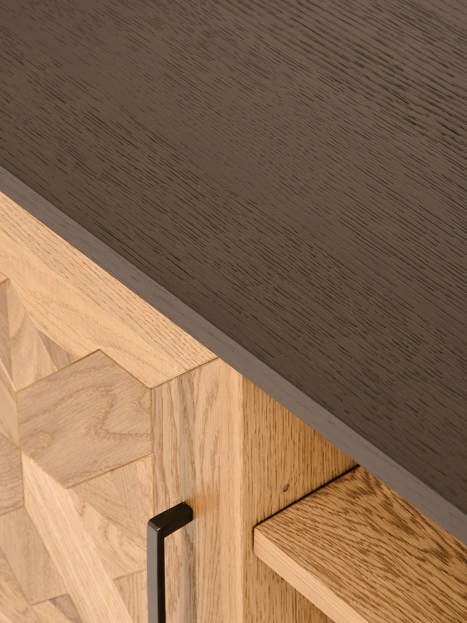 Komoda loftowa rtv w kolorze czarnym, osadzona na stalowej konstrukcji. Fronty z intarsją w kształcie X wykonane są z litego drewna białego dębu z wyraźną strukturą w naturalnym kolorze.