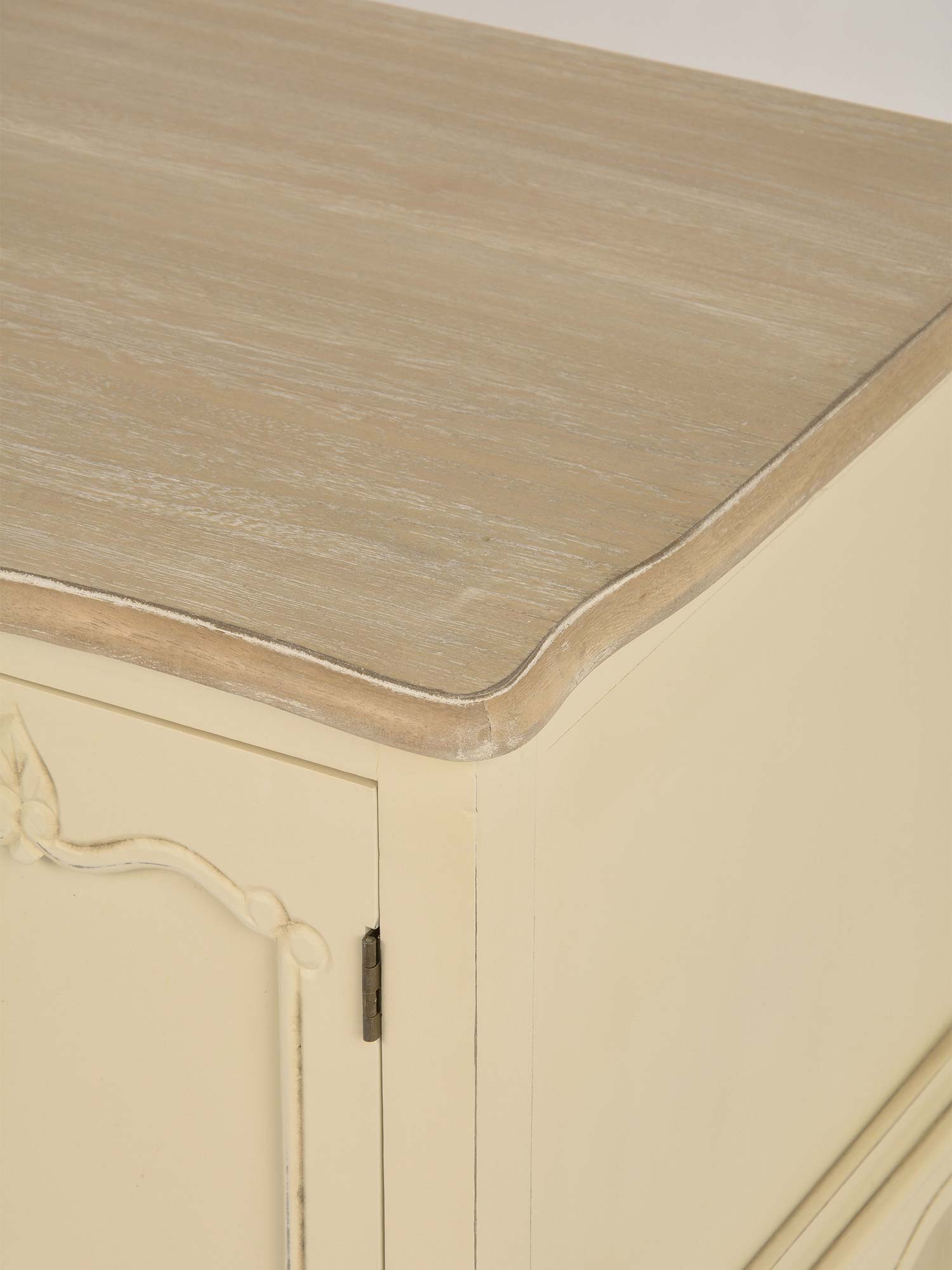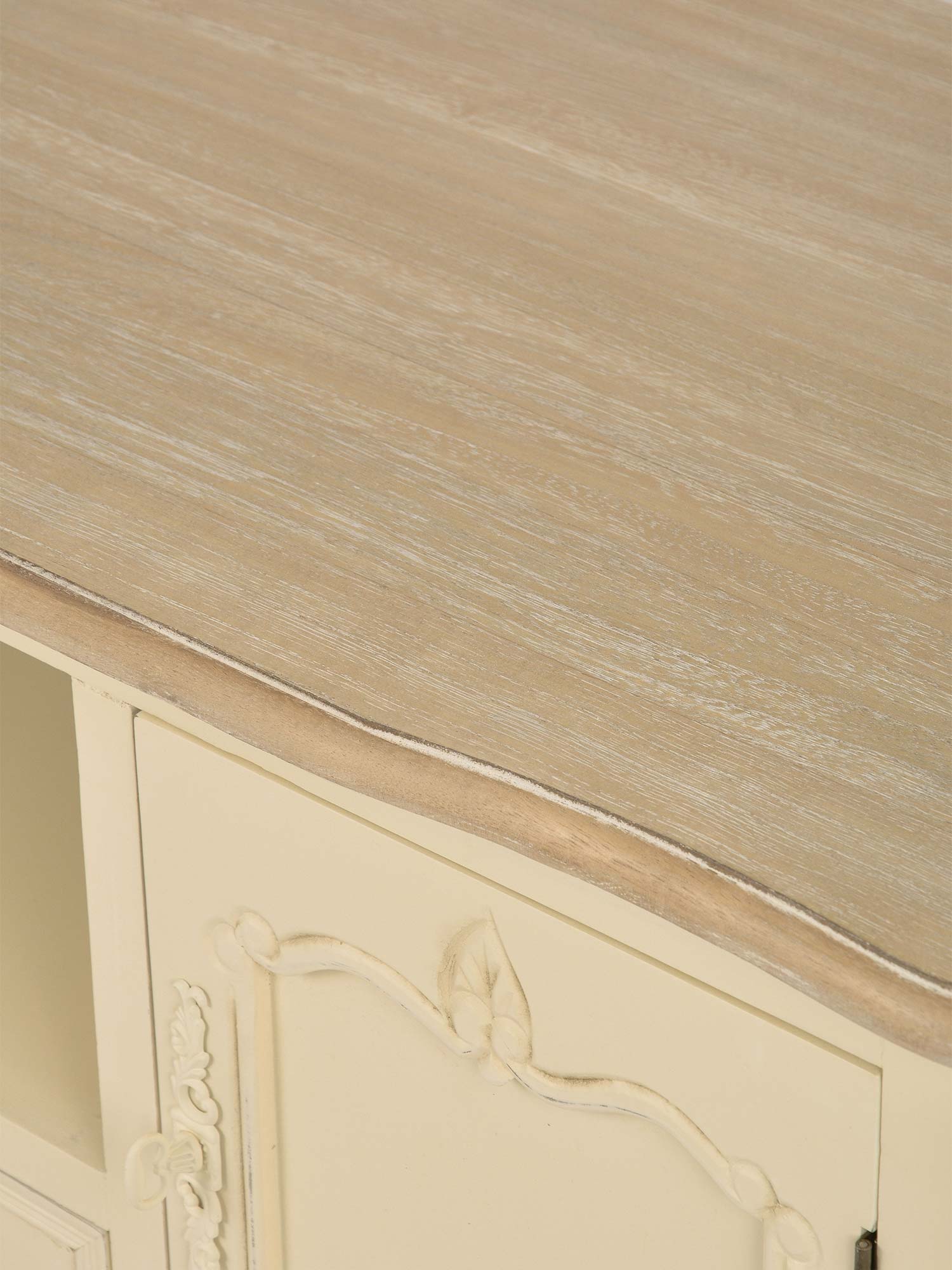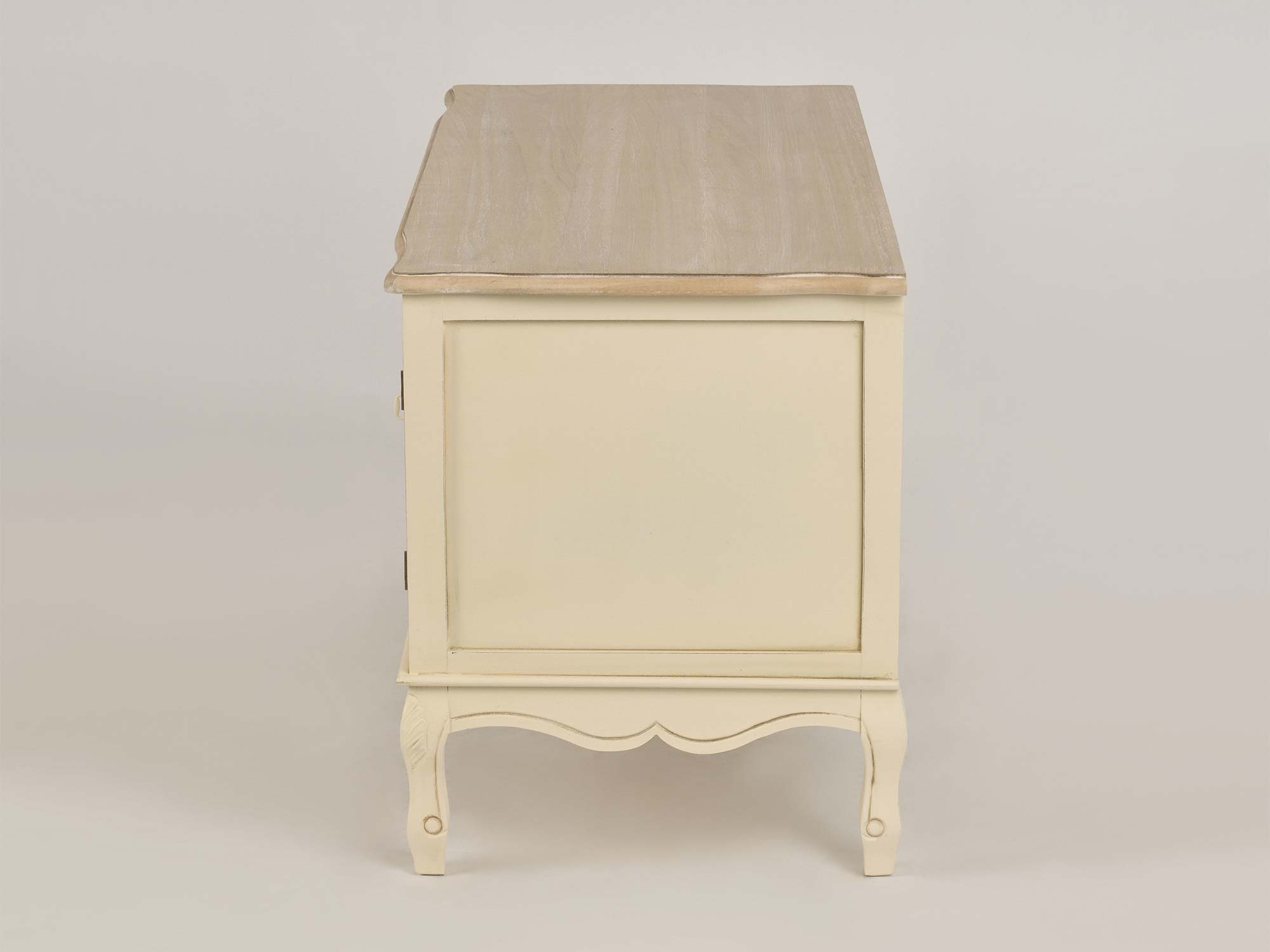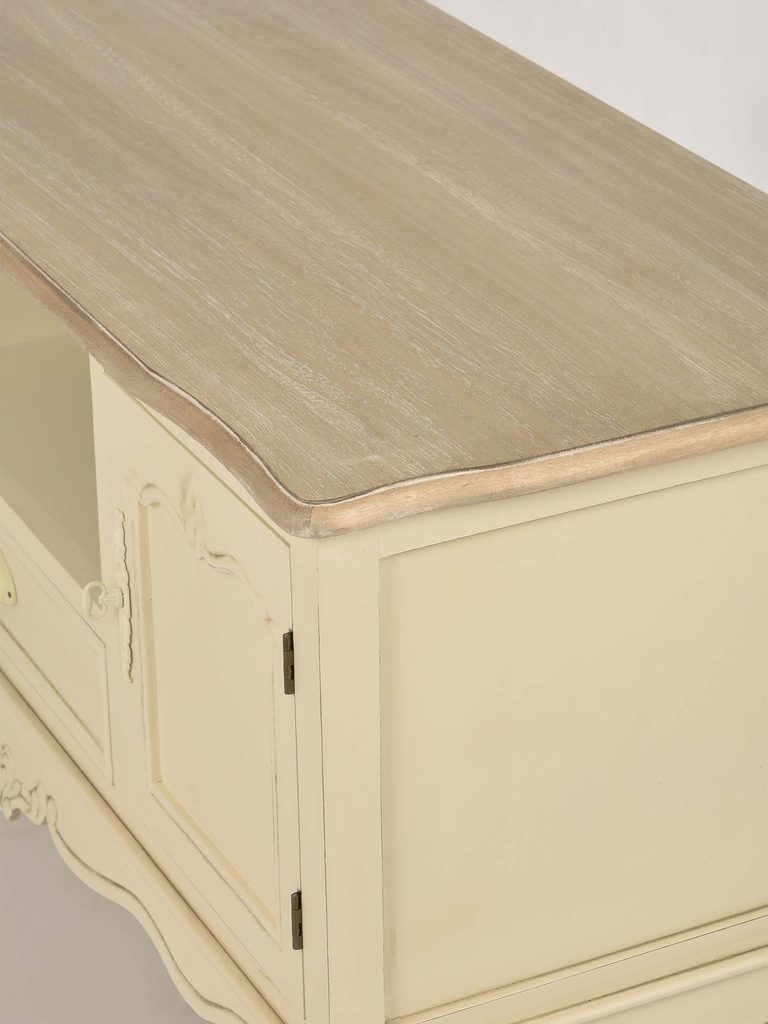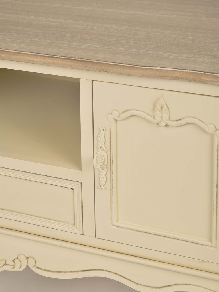 Komoda RTV Sorrento to mebel, który łączy klasyczny styl z nowoczesnymi rozwiązaniami. Korpus komody w kolorze kremowym wykonany z drewna paulowni to połączenie lekkości i trwałości. Blat z frezowanymi krawędziami w odcieniu jasnobrązowym, widoczna struktura drewna oraz metalowe uchwyty podkreślają elegancki wygląd komody. Ozdobne rzeźbienia na cokole oraz gięte nóżki nadają jej prowansalskiego uroku, który sprawdzi się zarówno w tradycyjnych, jak i nowoczesnych wnętrzach. Dzięki ręcznemu malowaniu, każdy egzemplarz komody jest unikalny, co sprawia, że będzie to wyjątkowy element wyposażenia Twojego salonu.