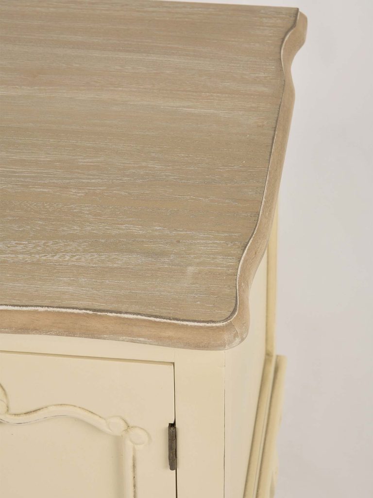 Komoda ręcznie malowana w stylu prowansalskim na giętych nóżkach, posiada ozdobne metalowe oraz rzeźbienia na cokole. Korpus jest w kolorze kremowym, blat z frezowanymi krawędziami jest w kolorze jasnobrązowym.