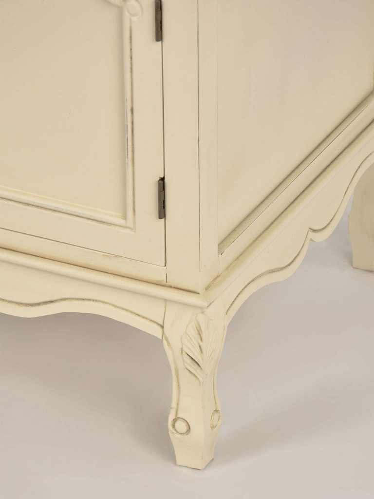 Komoda RTV Sorrento to doskonały wybór dla osób, które szukają eleganckiego, funkcjonalnego mebla w stylu prowansalskim. Dzięki ręcznemu malowaniu, solidnej konstrukcji i wyjątkowym detalom, takim jak ozdobne metalowe uchwyty, rzeźbienia na cokole i gięte nóżki, komoda stanie się wyjątkowym elementem Twojego salonu czy jadalni. Zainwestuj w mebel, który łączy piękno, funkcjonalność i trwałość – komoda Sorrento to wybór, który z pewnością Cię zachwyci.