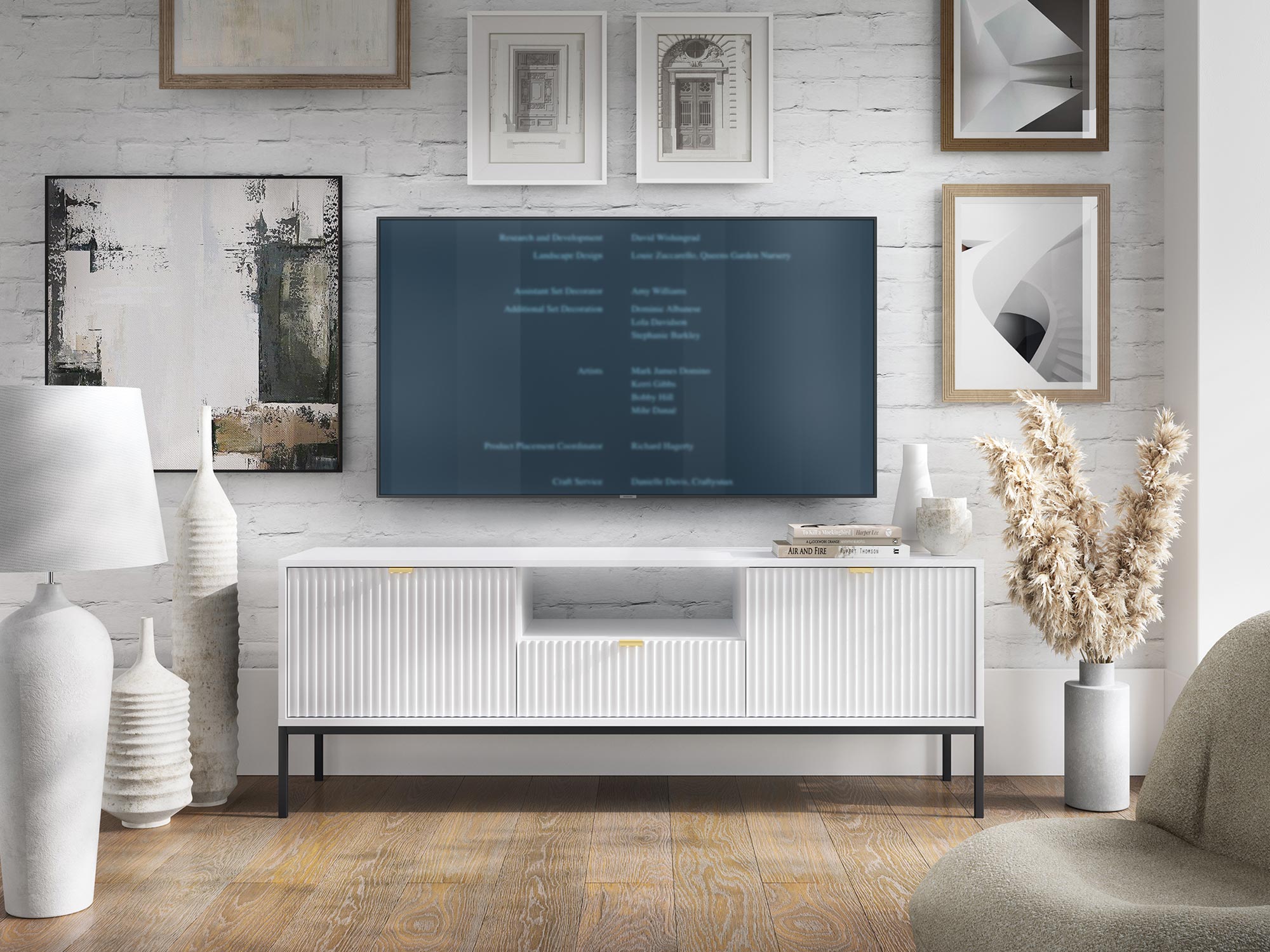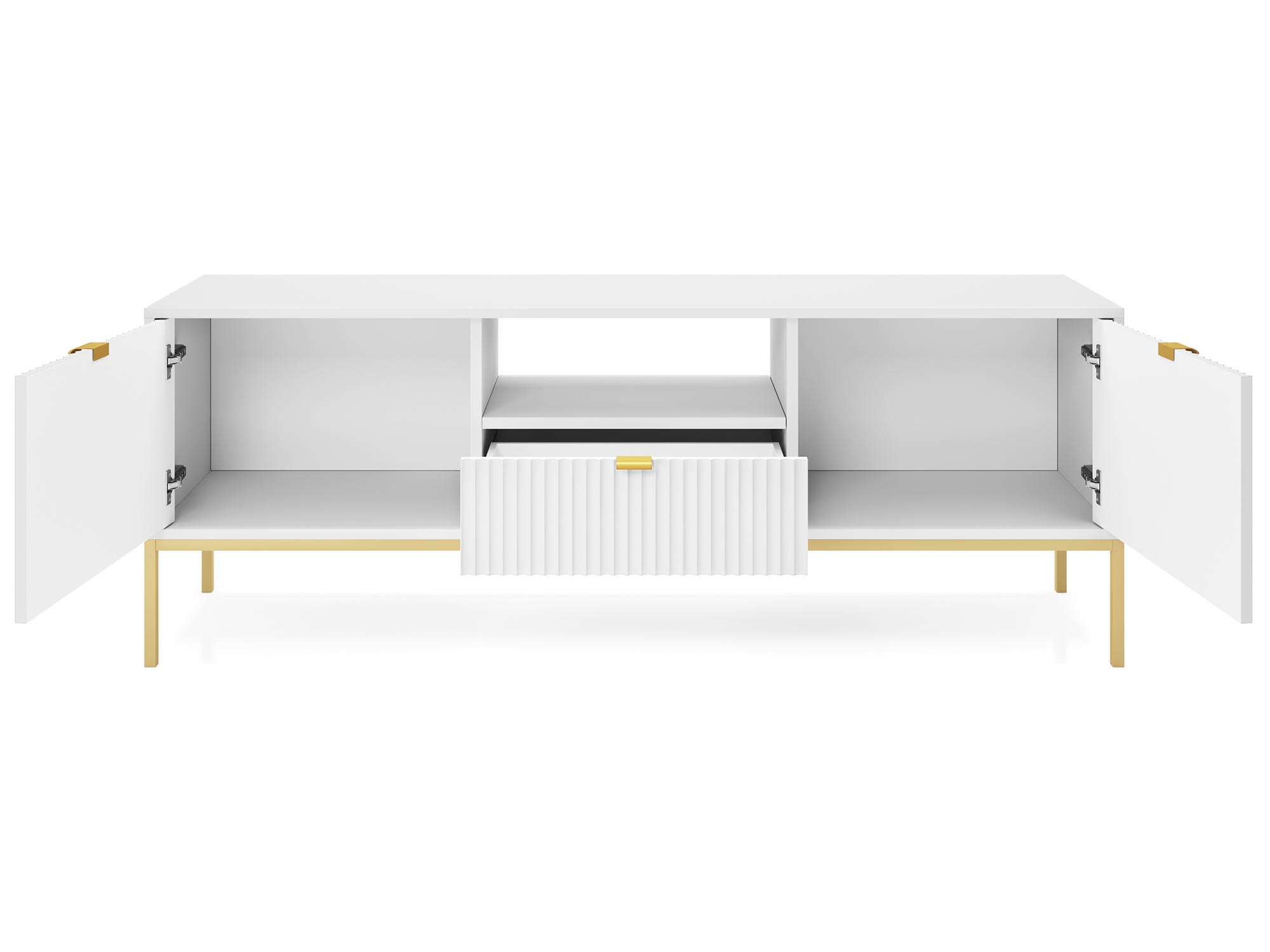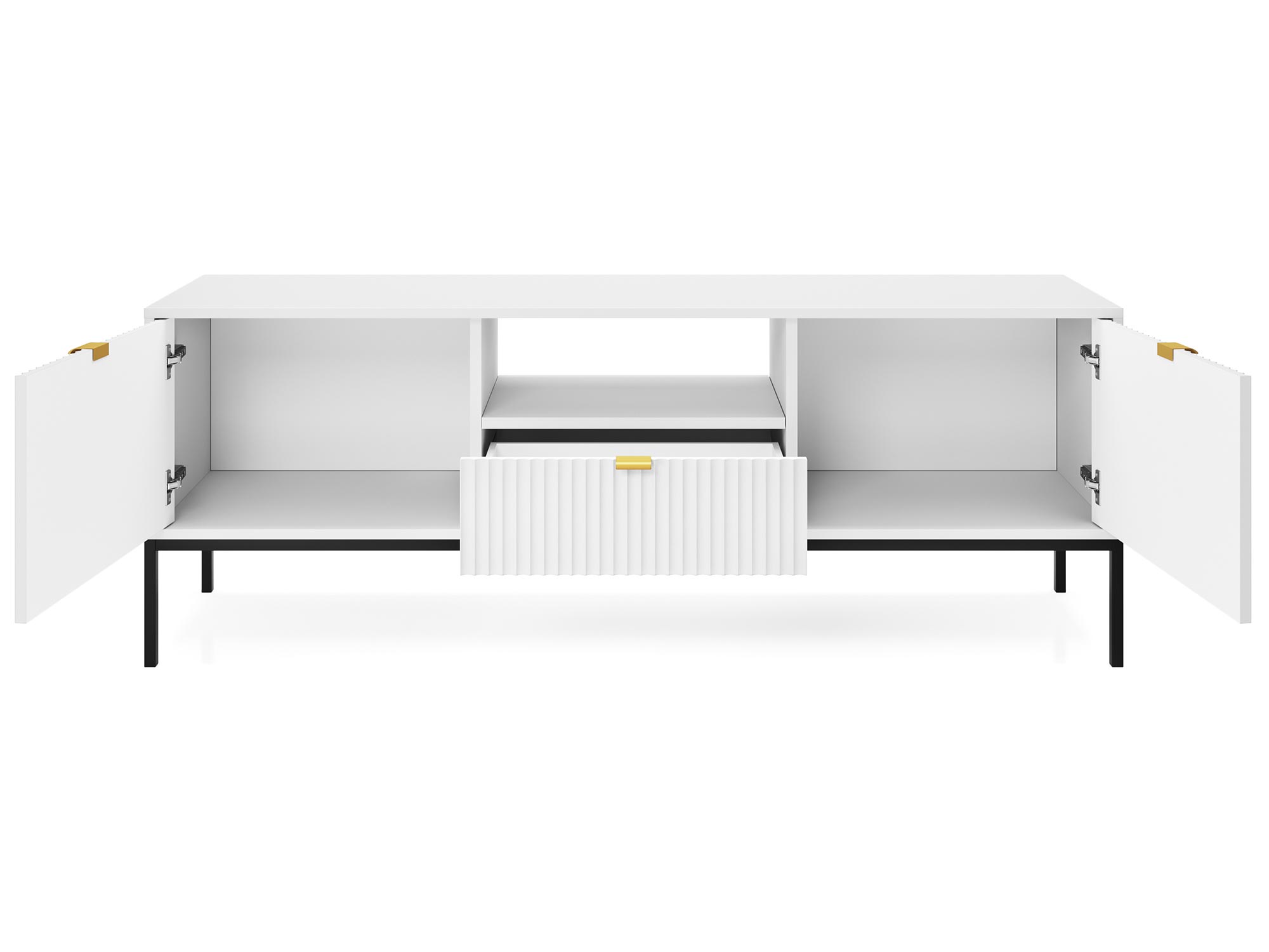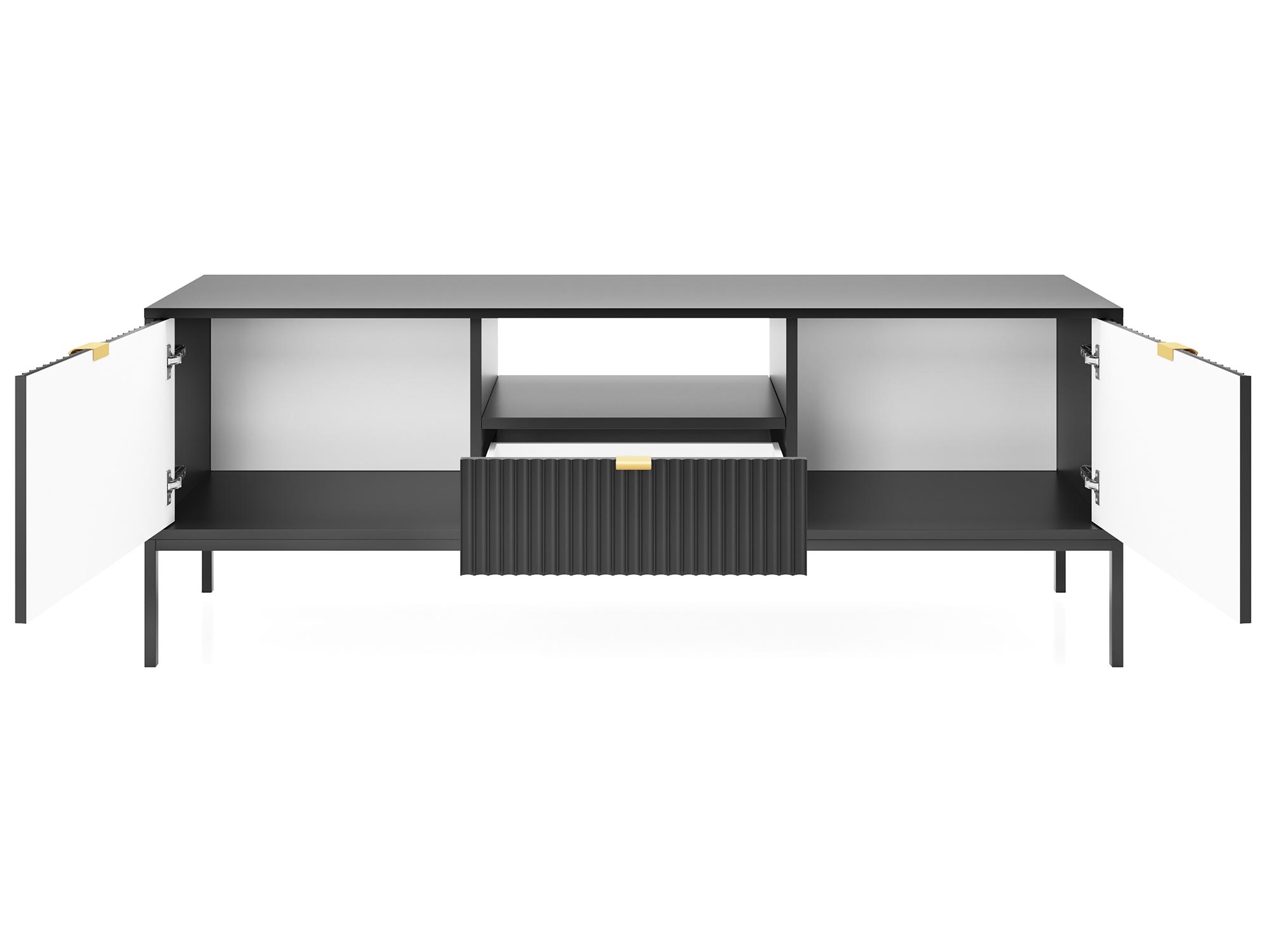 Odkryj nowy wymiar elegancji z Szafką RTV 154 Sivas, która łączy w sobie wyszukaną estetykę z praktycznym designem. Dzięki unikalnemu połączeniu złotych uchwytów z ryflowanymi frontami, dostępnymi w trzech kolorach – czarnym, szarym i białym, ten mebel stanie się centralnym punktem każdego salonu, dodając mu wyrafinowanego charakteru.