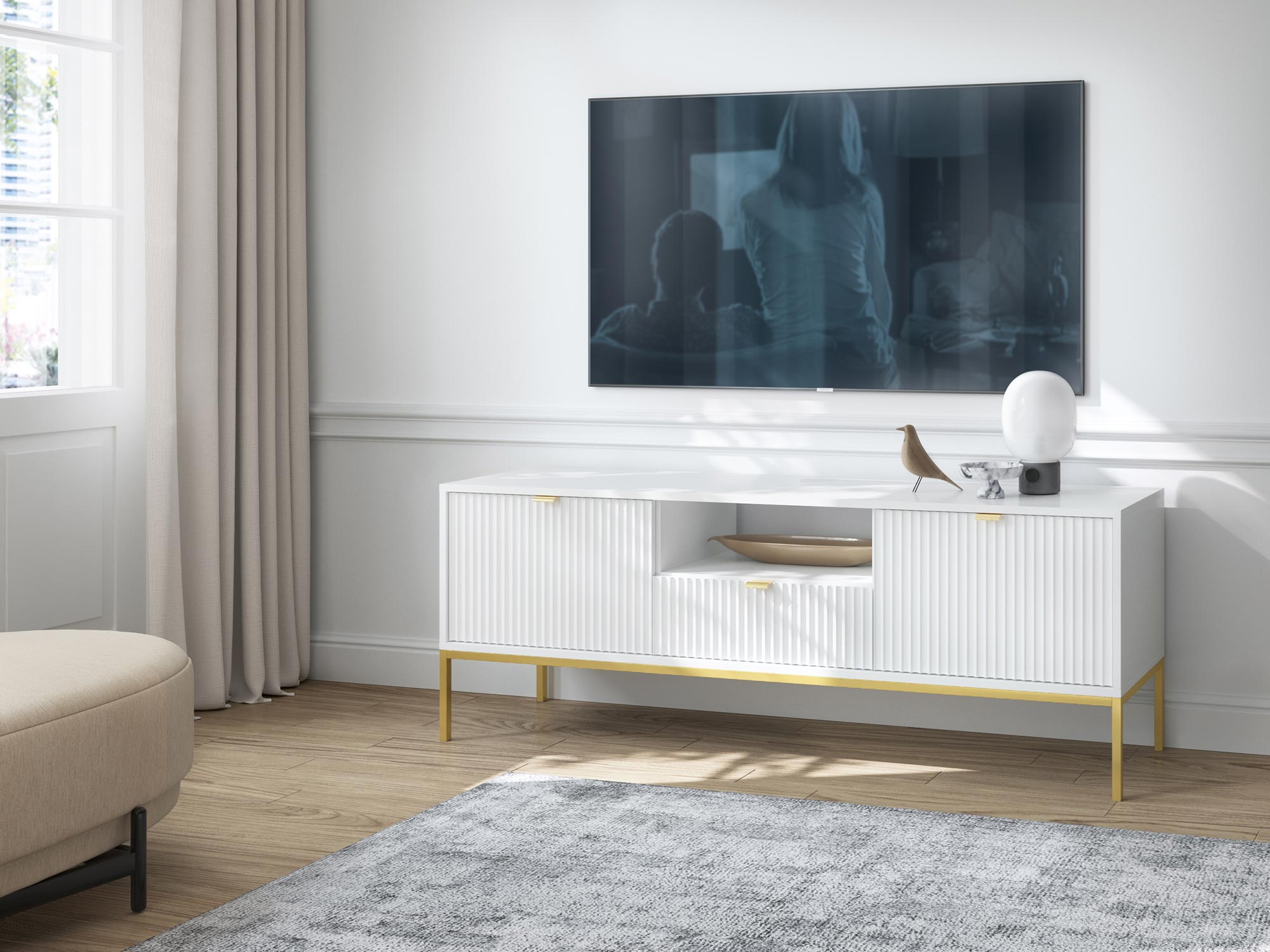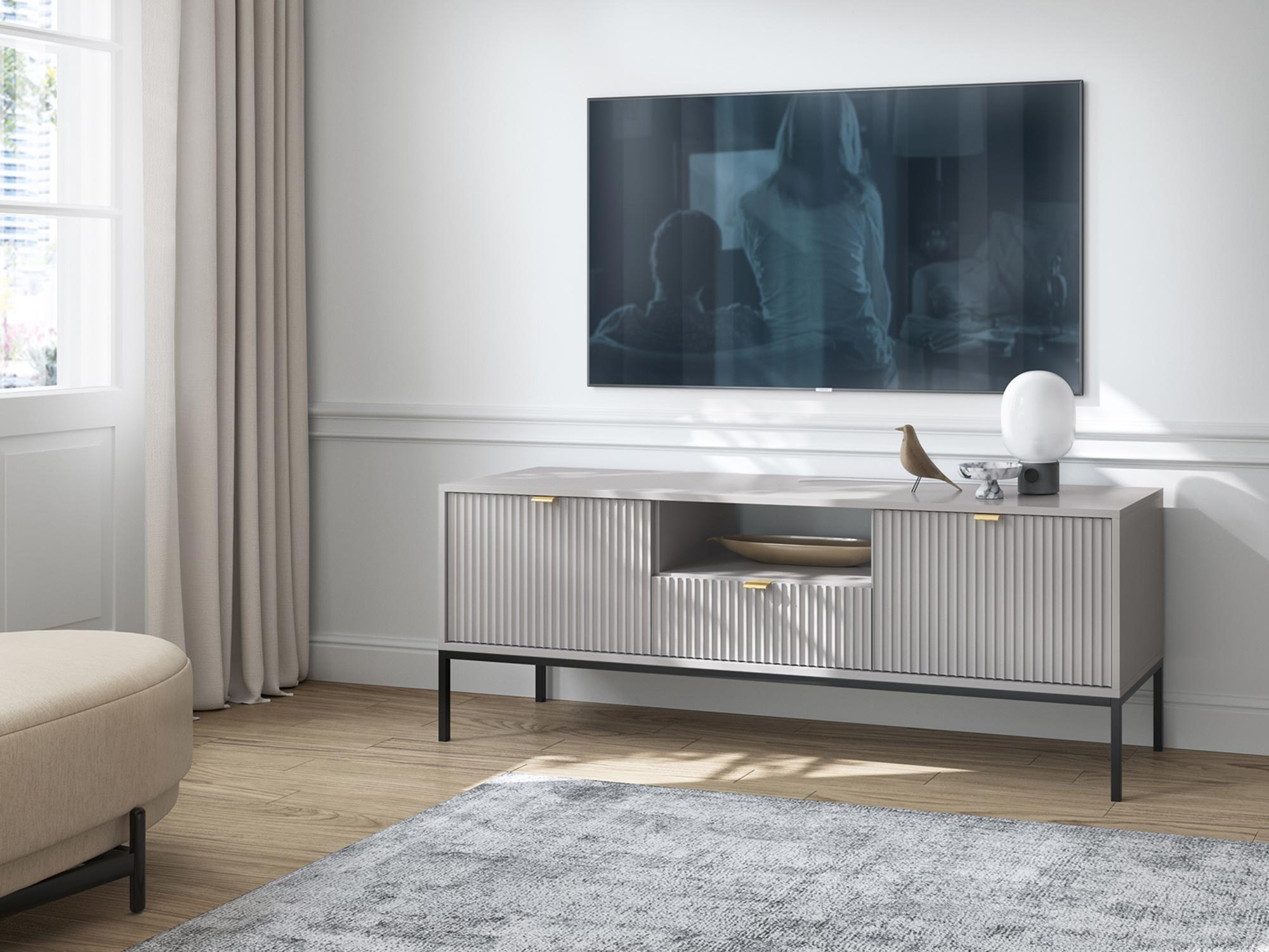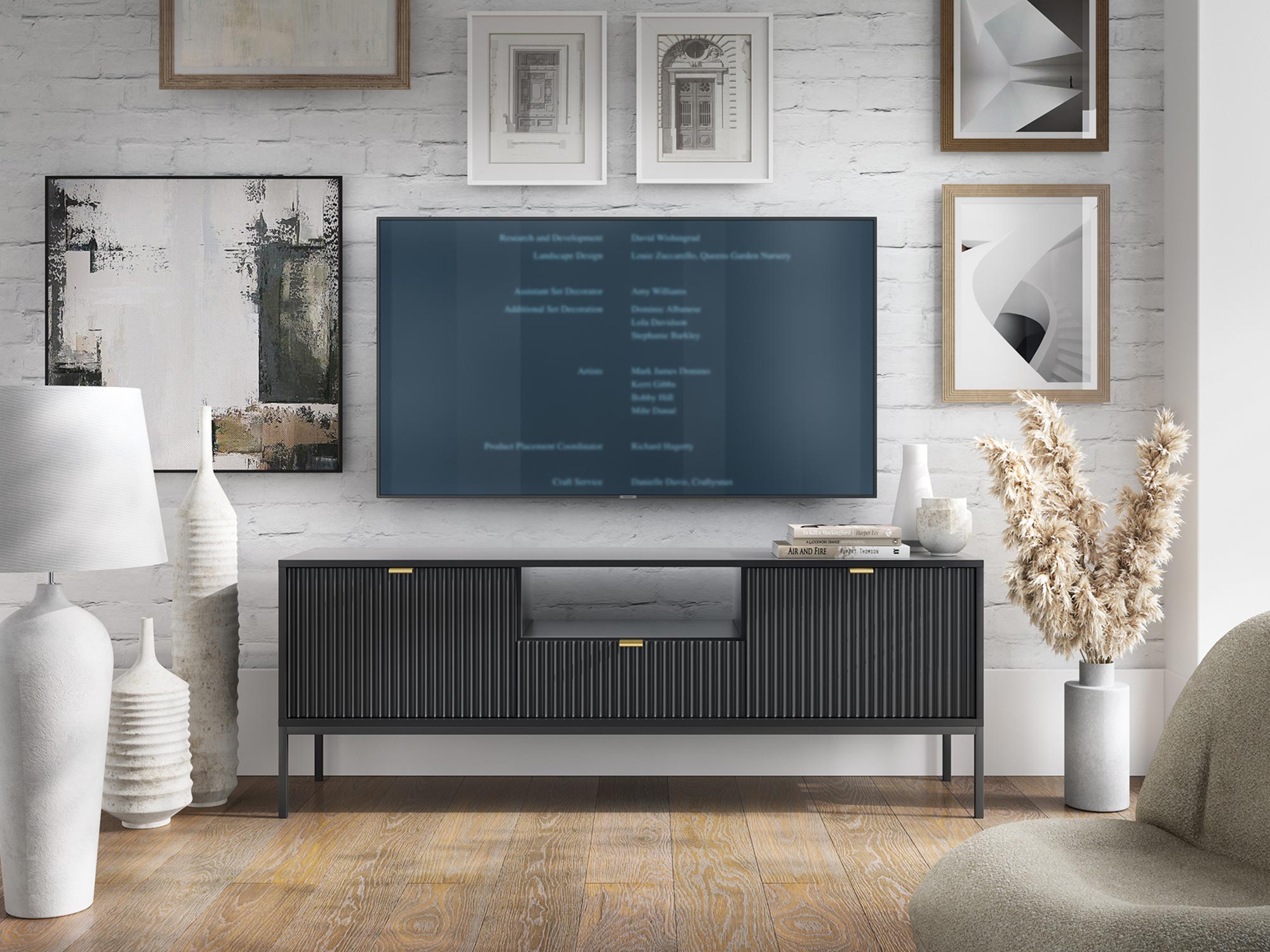 Odkryj nowy wymiar elegancji z Szafką RTV 154 Sivas, która łączy w sobie wyszukaną estetykę z praktycznym designem. Dzięki unikalnemu połączeniu złotych uchwytów z ryflowanymi frontami, dostępnymi w trzech kolorach – czarnym, szarym i białym, ten mebel stanie się centralnym punktem każdego salonu, dodając mu wyrafinowanego charakteru.