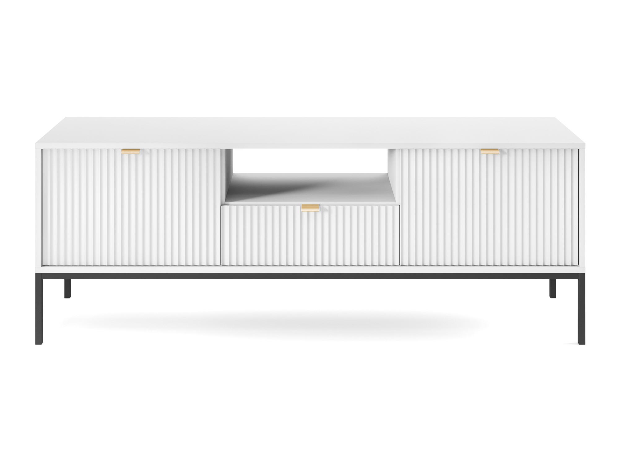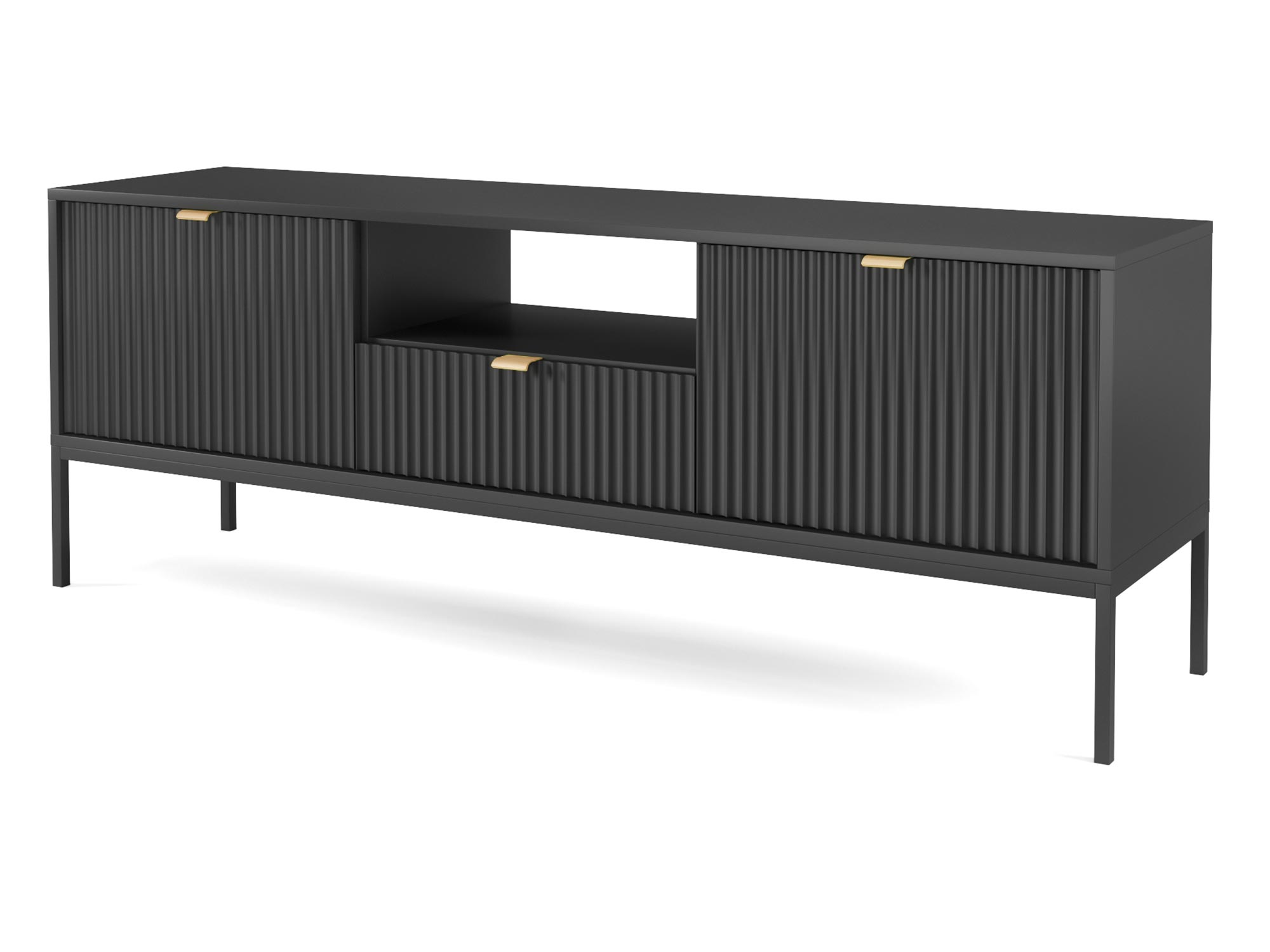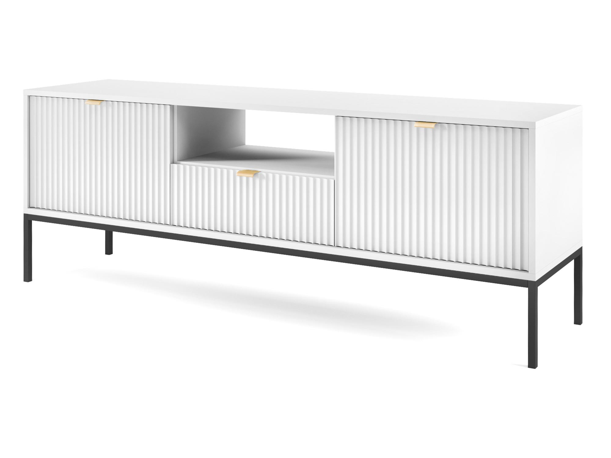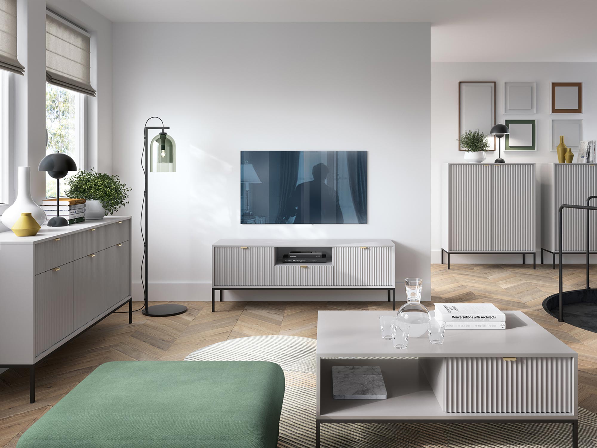 Odkryj nowy wymiar elegancji z Szafką RTV 154 Sivas, która łączy w sobie wyszukaną estetykę z praktycznym designem. Dzięki unikalnemu połączeniu złotych uchwytów z ryflowanymi frontami, dostępnymi w trzech kolorach – czarnym, szarym i białym, ten mebel stanie się centralnym punktem każdego salonu, dodając mu wyrafinowanego charakteru.