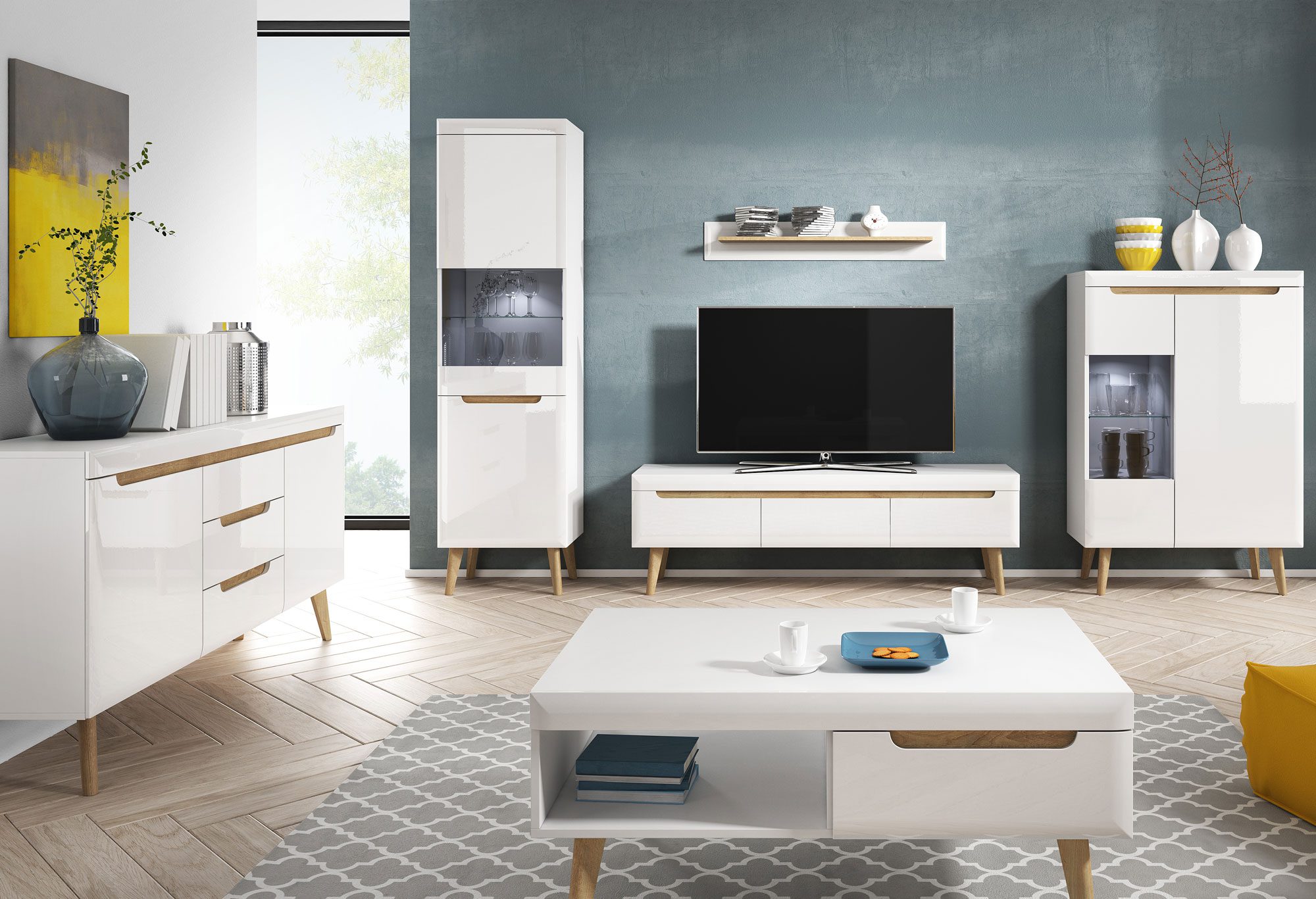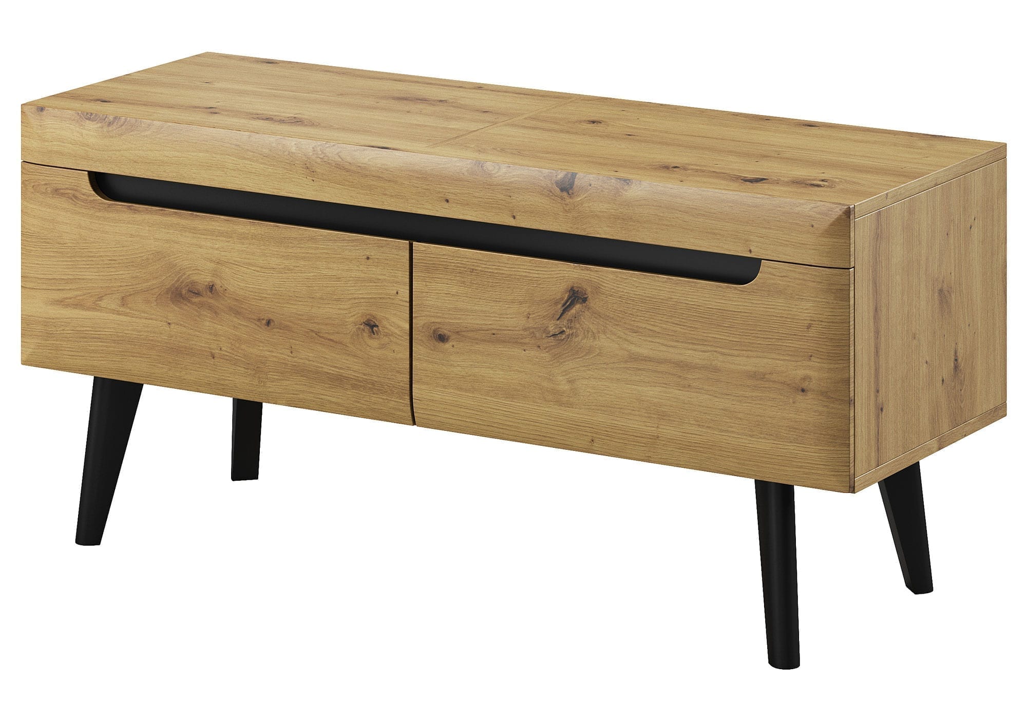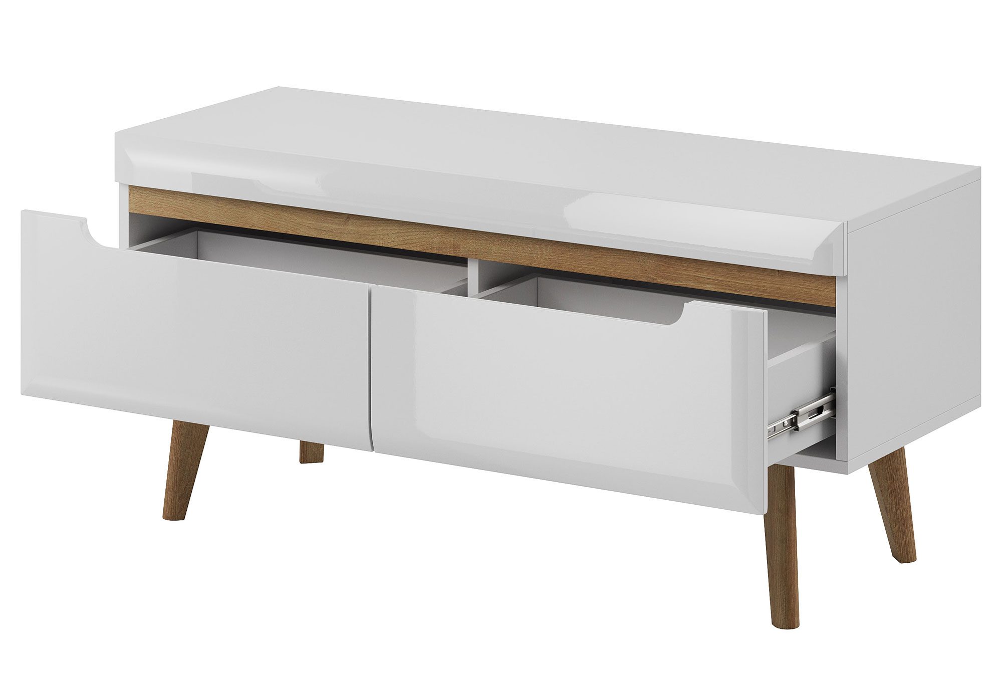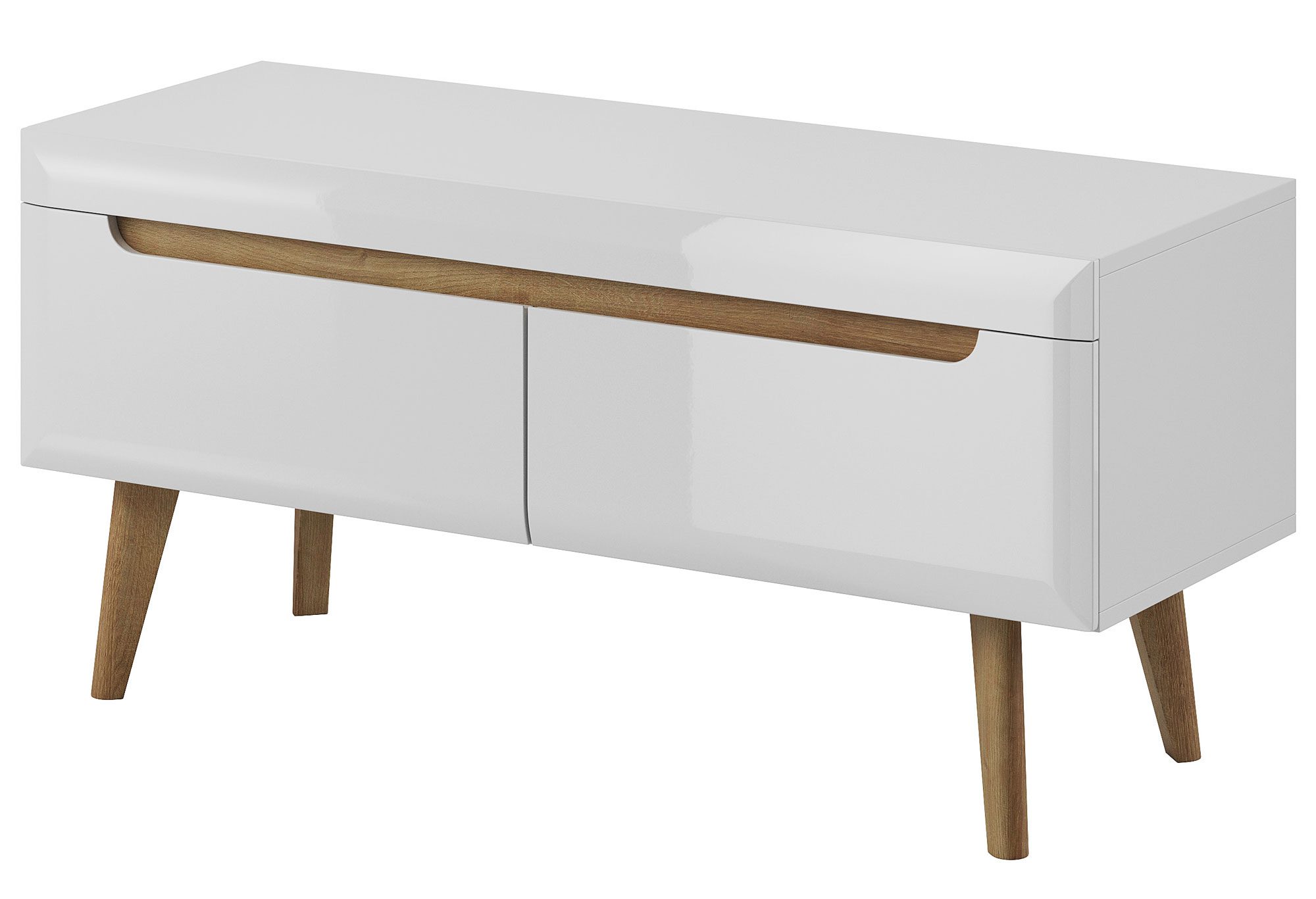 Fantastyczna propozycja dla osób poszukujących klasycznej elegancji i funkcjonalności. Z pewnością mała szafka RTV BASTIEN odznacza się lekką formą i perfekcyjnym wykonaniem, które może być swobodnie użytkowane przez długie lata. Ponadto produkt z ciekawymi wstawkami świetnie współgra ze współczesnym salonem, sypialnią czy pokojem gościnnym, pozwalając na indywidualną aranżację. Przede wszystkim wyjątkowego charakteru dodają mu wysokie drewniane nóżki oraz osadzone we frontach frezowane uchwyty. Co więcej lekko zaokrąglona forma to koncepcja, która wyróżnia kolekcję na tle innych. Mebel wyposażono w dwie, pojemne szuflady na prowadnicach kulkowych. Szafka RTV w tym wydaniu spełni najbardziej wygórowane oczekiwania, stając się przyjemnym dla oka akcentem podczas domowego relaksu.