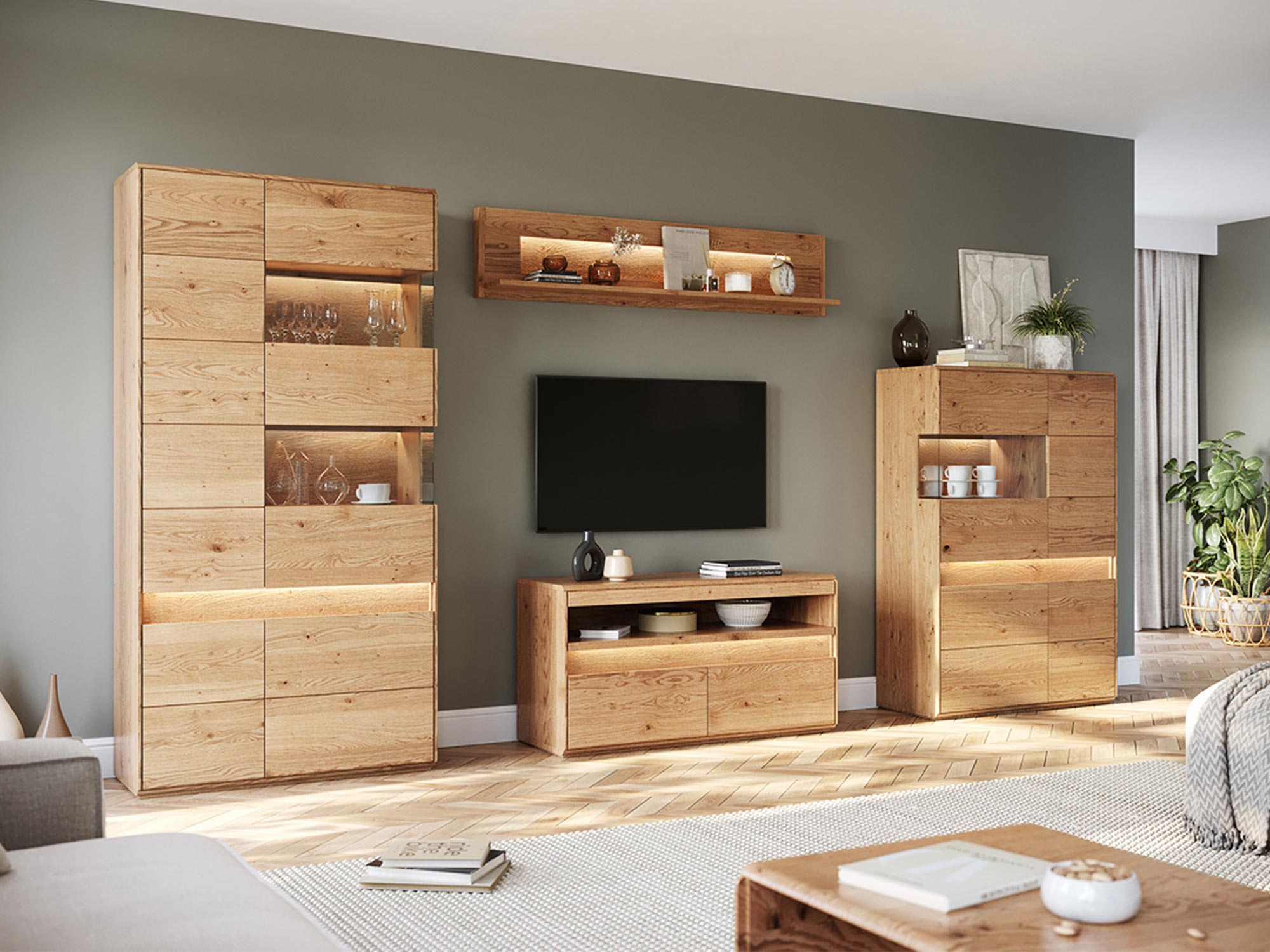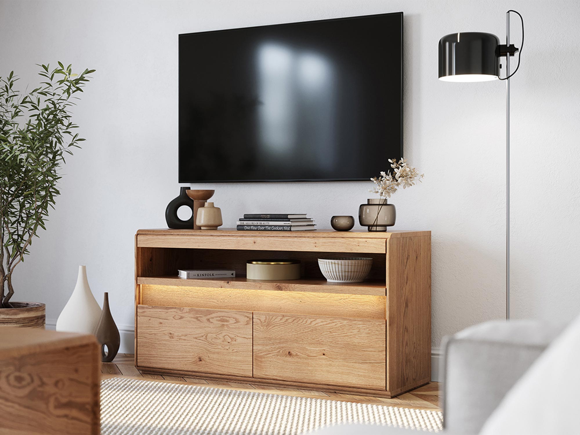 Nowoczesna szafka RTV z litego dębu pod ściennym telewizorem