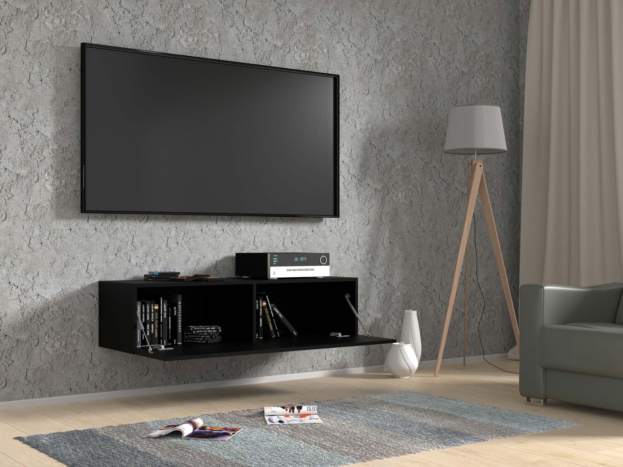 Matowa szafka RTV wisząca czarna 120 aranżacja AMIRA